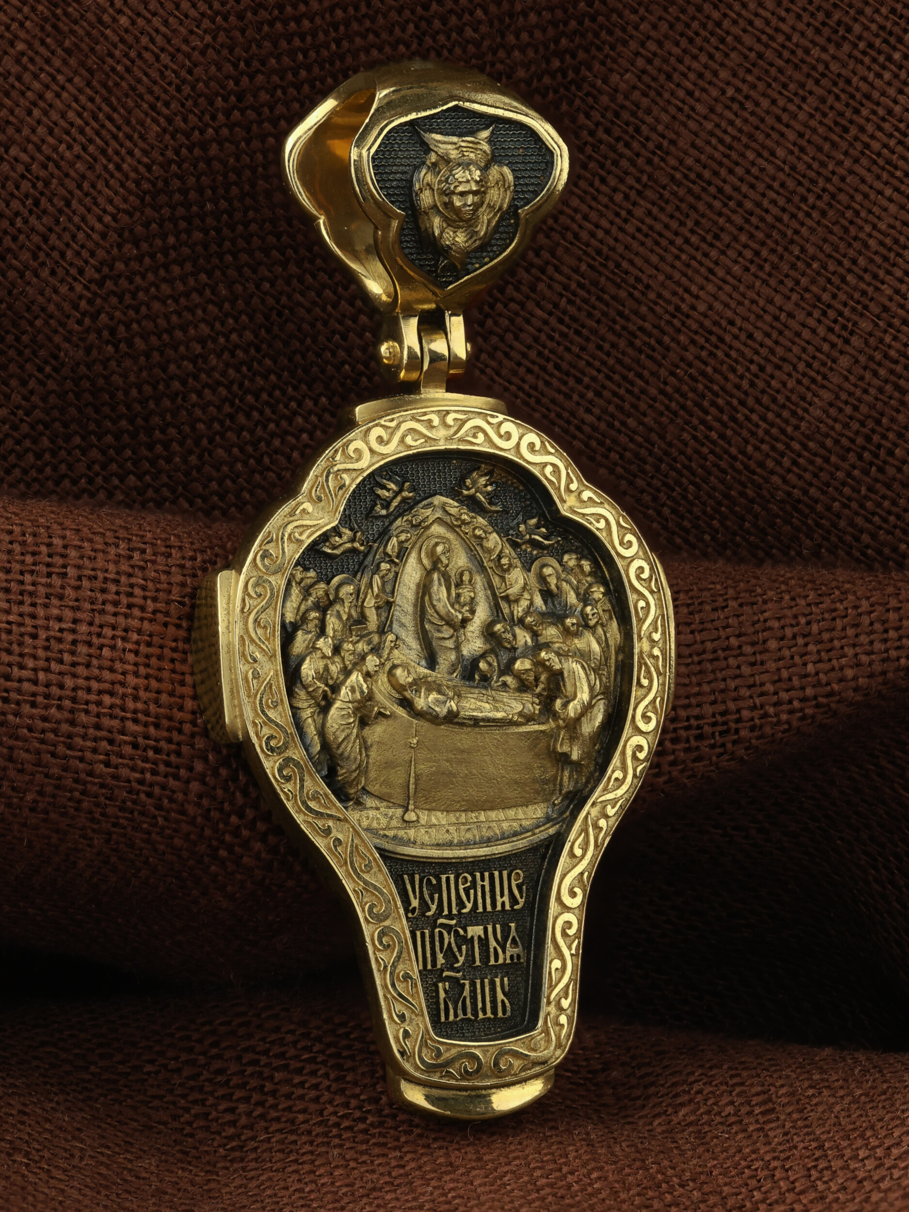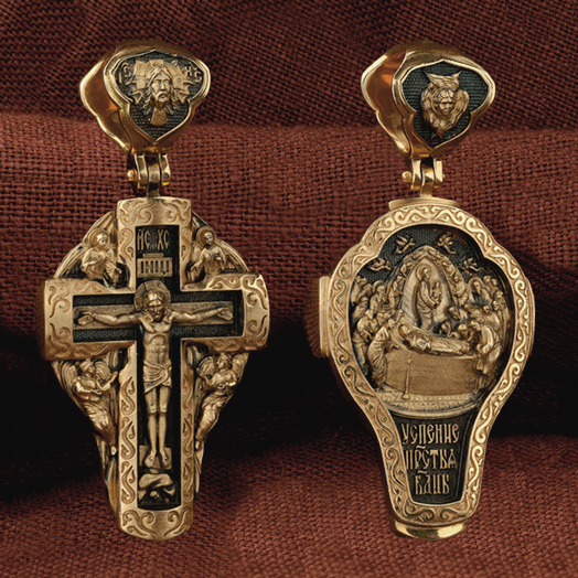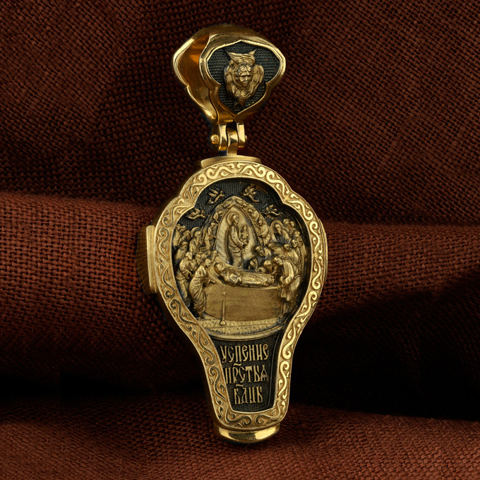 На оборотной стороне креста изображена икона Успения Пресвятой Богородицы. Все годы после Распятия, Воскресения и Вознесения Иисуса Христа Пресвятая Дева провела большей частью в Иерусалиме, проповедуя Господа наравне с апостолами. Но вот настало время Ее земной кончины. Архангел Гавриил возвестил Ей, что через три дня душа Ее оставит тело. Но Богородица очень обрадовалась. Ведь Ее ожидала встреча с Тем, Кого Она любила гораздо больше, чем жизнь. Три дня спустя в доме апостола Иоанна, где жила Мария, собрались и другие апостолы: Господь чудесным образом устроил так, что все они вернулись к этому дню из дальних странствий, где проповедовали Христа. Не было только Фомы. Апостолы стали свидетелями блаженной кончины Святой Девы. Сам Христос, окруженный множеством ангелов, явился, чтобы принять душу Своей Пречистой Матери и возвести Ее в рай. На кулонном кольце изображен шестикрылый Ангел — Серафим.