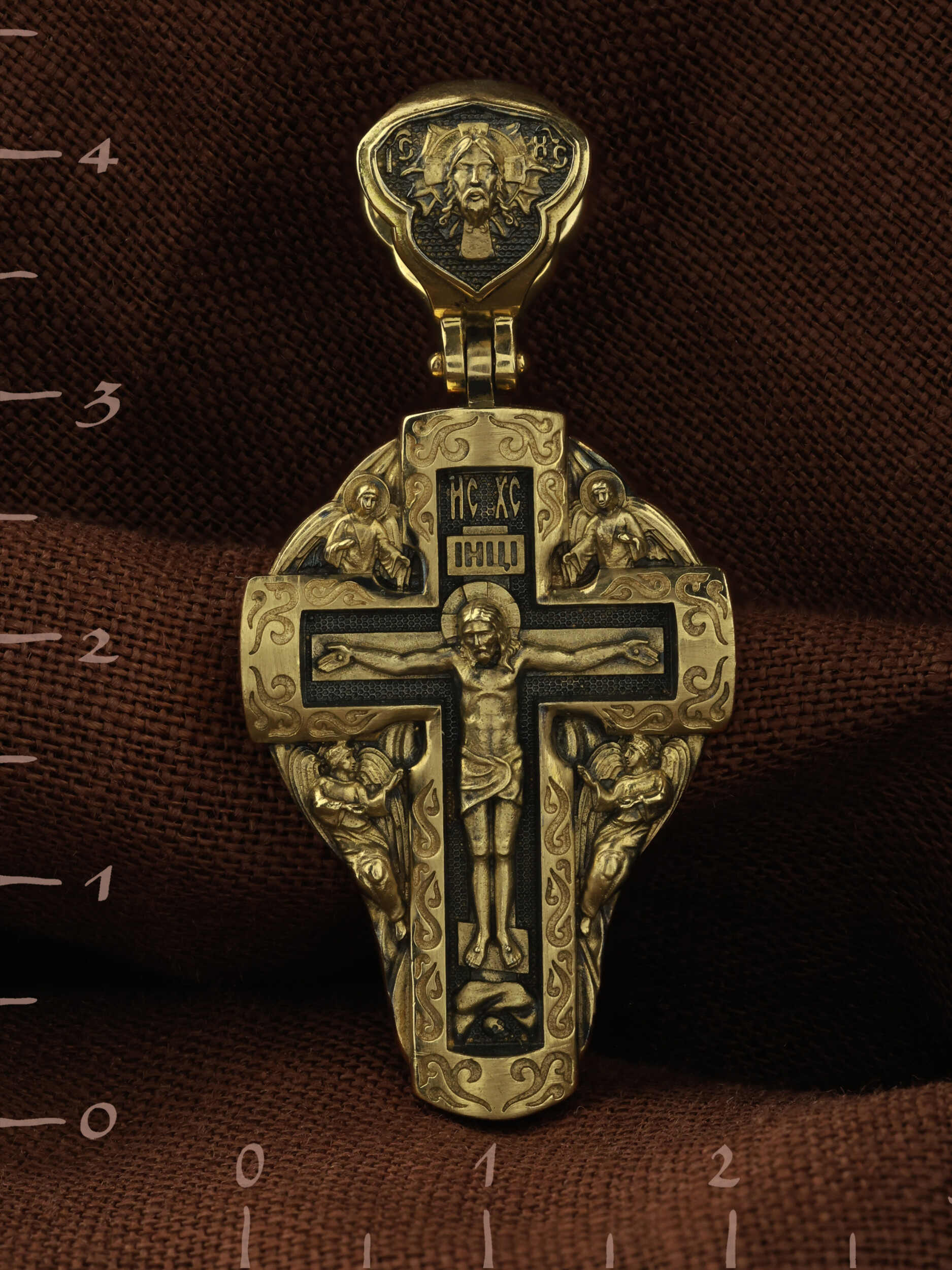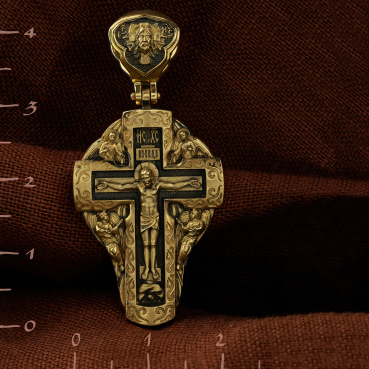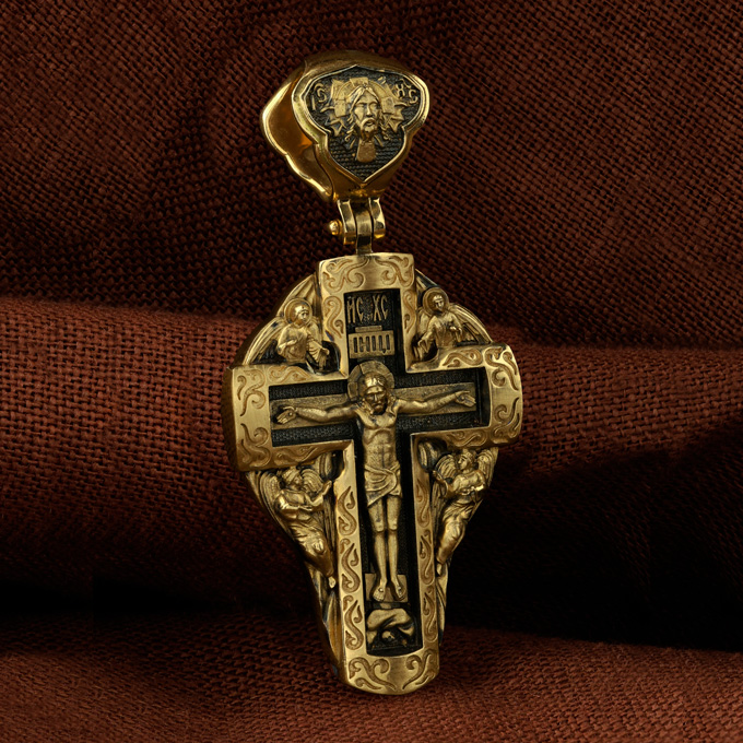 На лицевой стороне креста изображено Распятие Господа и Спасителя нашего Иисуса Христа, отдавшего Себя на смерть, для искупления грехов мира. Крест является символом жертвенной любви Всеблагого Бога к падшим людям, всепобеждающим духовным оружием христиан, основанием и средоточием церковной жизни. Господь сказал: кто хочет идти за Мною, отвергнись себя, и возьми крест свой, и следуй за Мною. (Мк. 8: 34). Над Распятием помещена надпись «IC» «ХC», означает Иисус Христос. На верхней табличке, выше головы Иисуса, расположена надпись, составленная Понтием Пилатом — «IНЦI». Она означает «Иисус Назорей, Царь Иудейский». Возвышение, на котором стоит Крест, символизирует гору Голгофу, на которой произошло Распятие. Под подножием Креста изображена покоящаяся голова (череп) Адама. У Креста изображены Ангелы. На кулонном кольце изображен Нерукотворный образ Господа и Спасителя нашего Иисуса Христа, чудесно отпечатавшийся на плате, которым Христос вытер свой лик. Ниже надпись — «IC» «ХC».