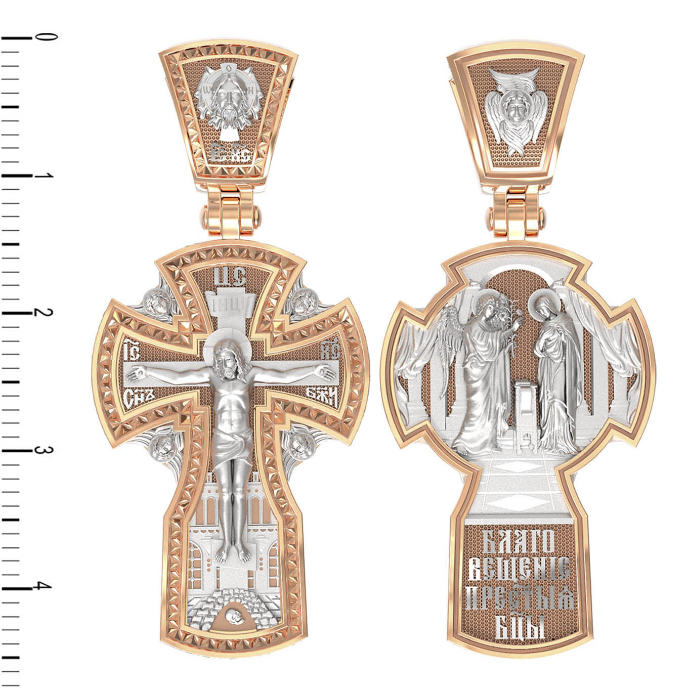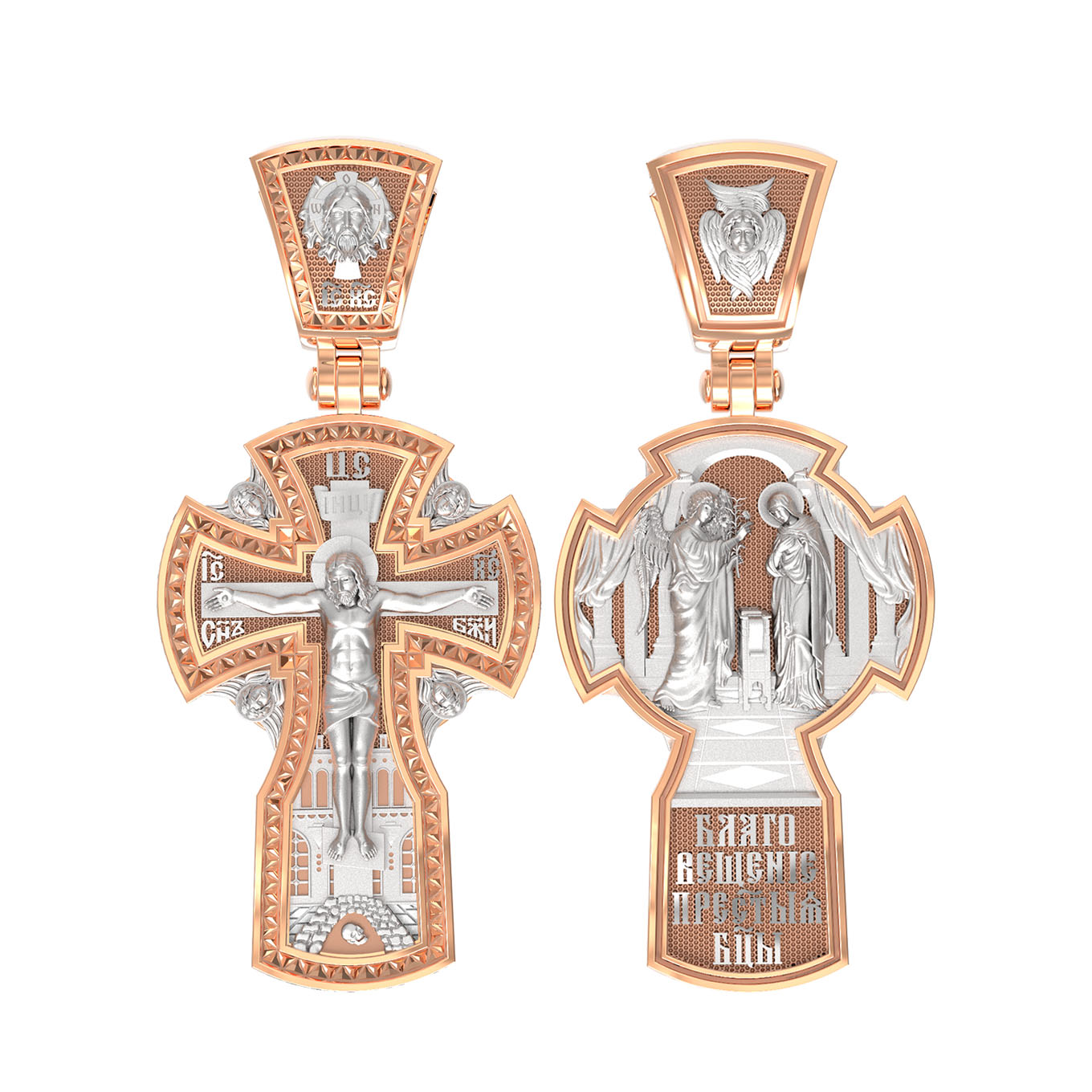 На оборотной стороне креста изображена икона «Благовещение Пресвятой Богородицы». Как нам повествует Священное Писание, Архангел Гавриил послан был от Бога в город Назарет к Пресвятой Деве Марии с радостной вестью, что Господь избрал Ее быть Матерью Спасителя мира. Ангел сказал: «Радуйся благодатная! Господь с Тобою! Благословенна Ты между женами». Мария cмутилась от слов Ангела и думала: что значит это приветствие? Ангел же продолжал говорить Ей: «не бойся, Мария, ибо Ты обрела благодать у Бога. И вот, Ты родишь Сына и наречешь имя Ему Иисус. Он будет велик, и назовется сыном Всевышнего, и Царству Его не будет конца…» На кулонном кольце изображен Ангел Серафим.
