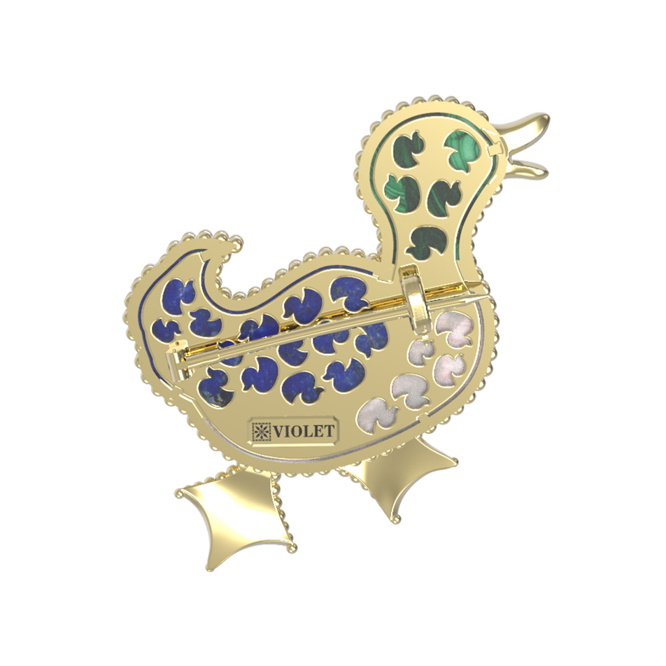 Брошь из лимонного золота c эмаль, лазуритом, малахитом и перламутром