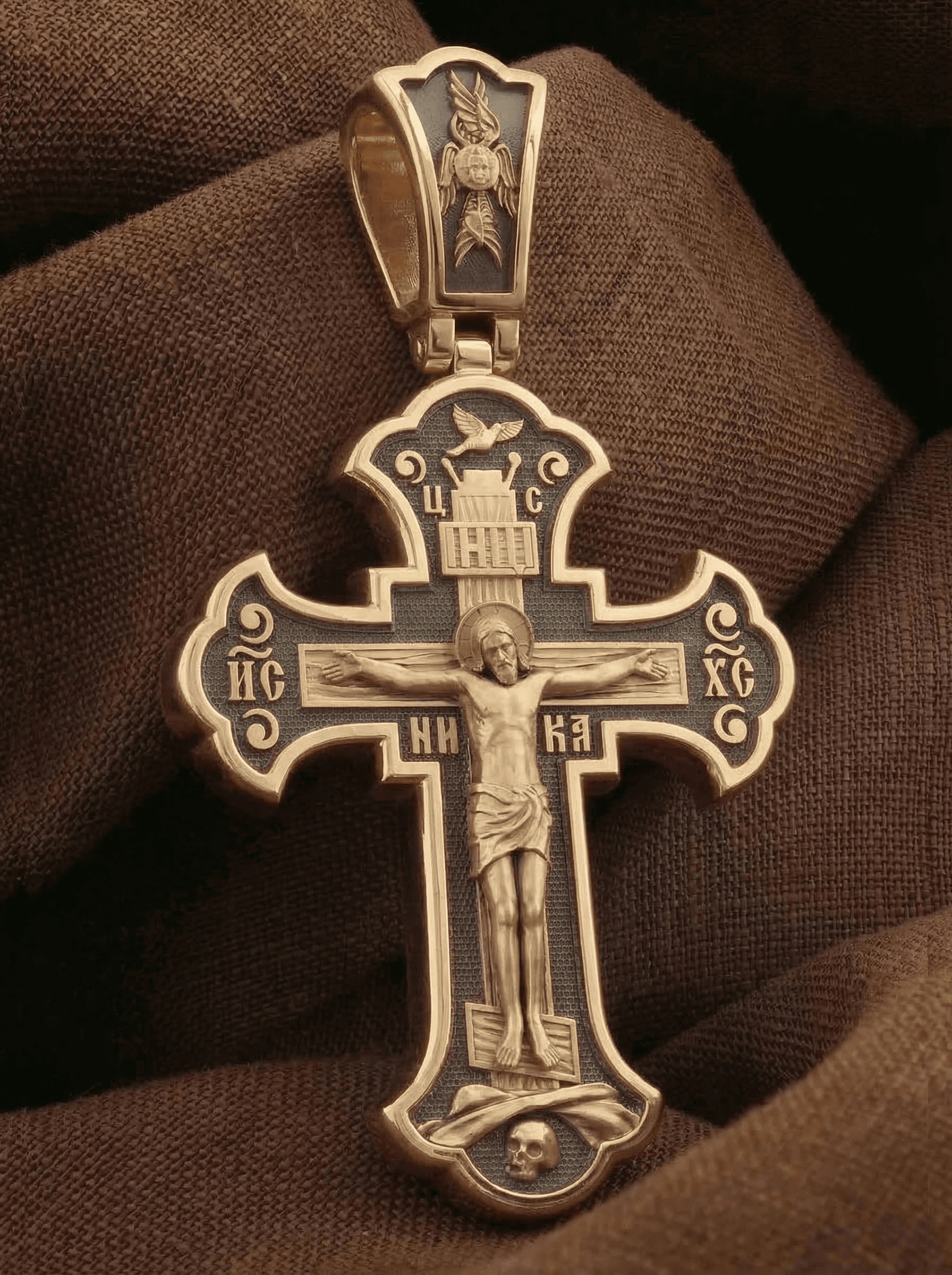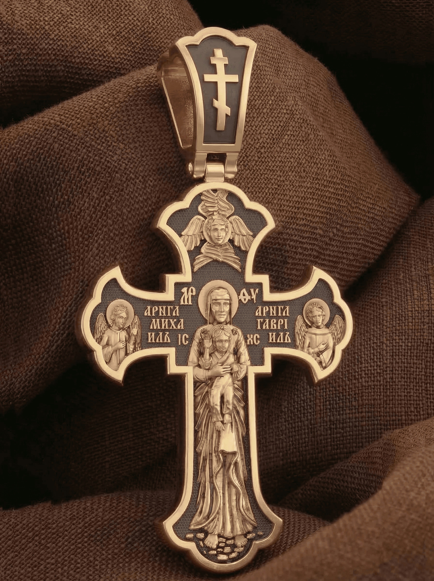 На лицевой стороне этого креста центральную часть занимает икона Распятия Христа — образ жертвы, принесенной Господом за грехи людей. Именно ко Христу, сошедшему на землю ради нашего спасения, возносятся все молитвы. Пресвятая Богородица, ангелы и святые — помощники Господа в деле спасения и заступники за людей перед Богом. «Оружием великим Христовым» именует Церковь крест, потому что, претерпев страдания и умерев, Господь победил смерть и лишил дьявола его власти над миром. Поэтому рядом с титлами Святого имени Христа написано «НИКА», что значит «победитель».