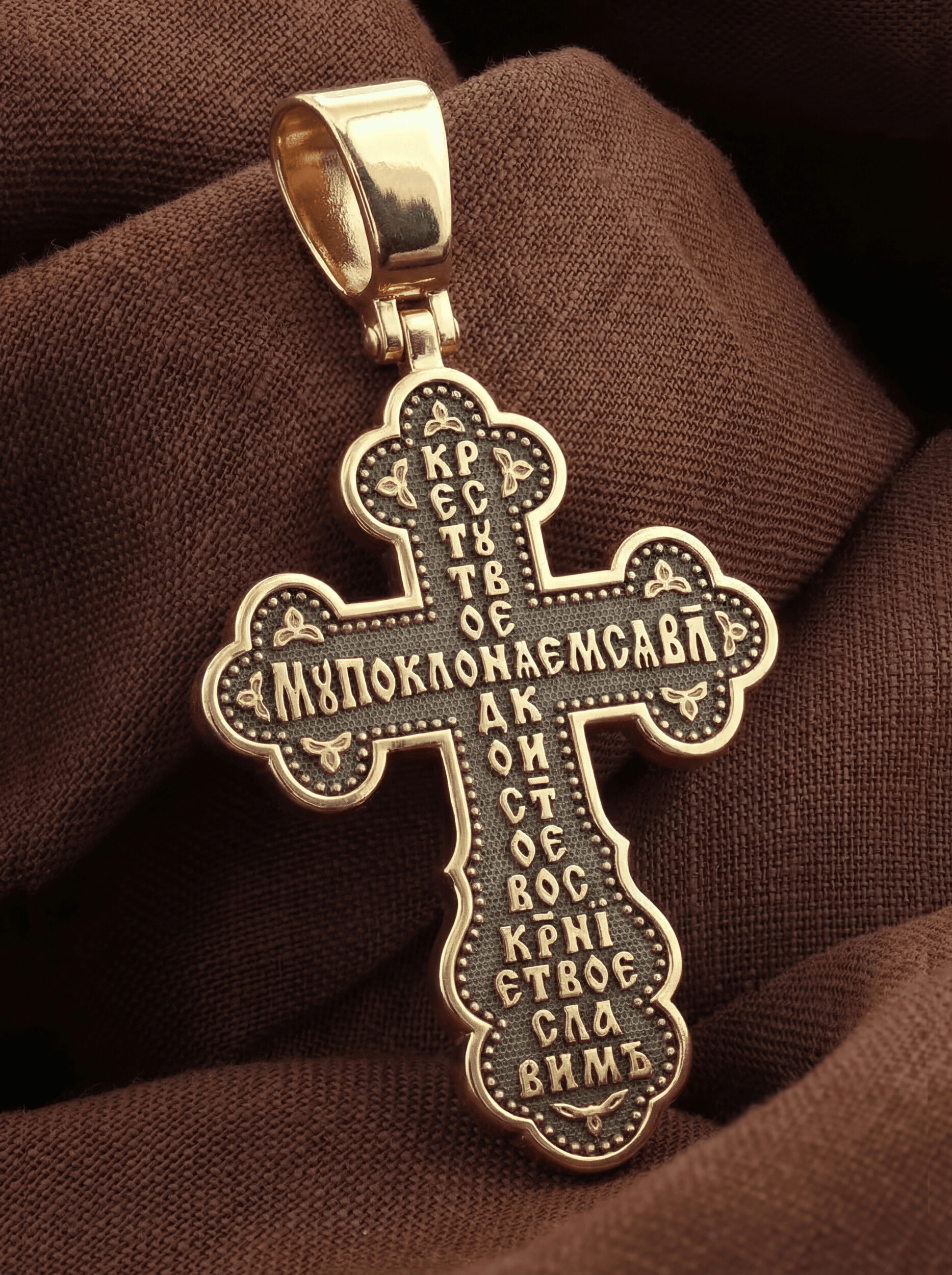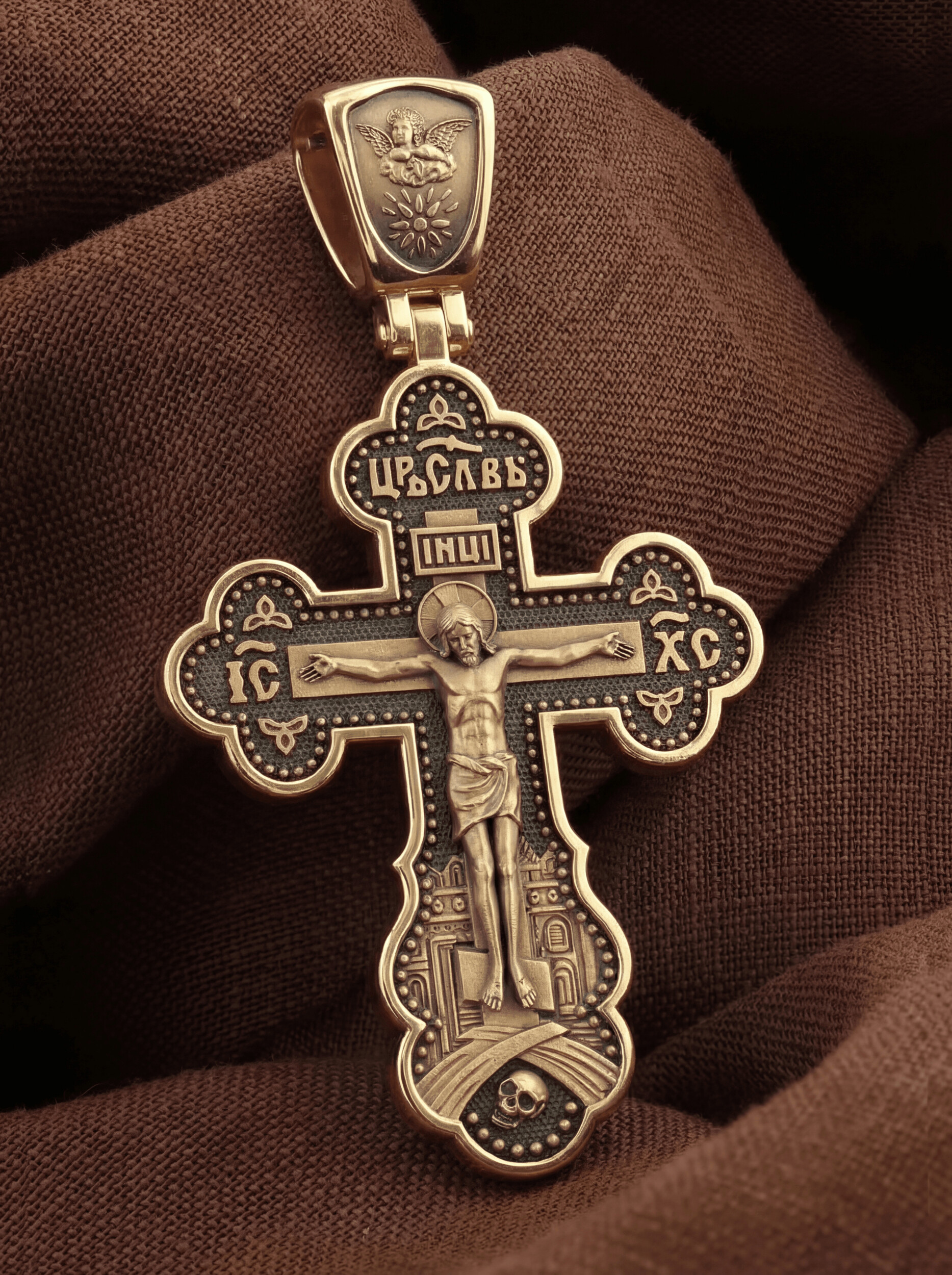 На лицевой стороне креста изображено Распятие, потому что это орудие казни Иисус Христос сделал орудием победы над грехом и смертью. Своими страданиями Он искупил грехи человечества, умерев и сошествовав во ад, победил сатану, освободил души праведников от вечной смерти и открыл им небесные врата рая. Жертва Христа сделала возможным спасение для каждого человека. На православном кресте Христос не умирает, а свободно простирает руки, ладони Иисуса открыты, будто он хочет обнять все человечество, даря им свою любовь и открывая путь к вечной жизни. Над титлом видим слова «ЦРЬ СЛВЫ» — Царь Славы. Верхняя перекладина символизирует собой табличку с надписью «IHЦI» — Иисус Назарянин Царь Иудейский. Возле перекладины пишется сокращенно имя Спасителя «IC XC» — Иисус Христос. Возвышение, на котором стоит Крест, символизирует гору Голгофу, на которой произошло Распятие. У подножия Креста изображают прах Адама, обозначенный черепом.