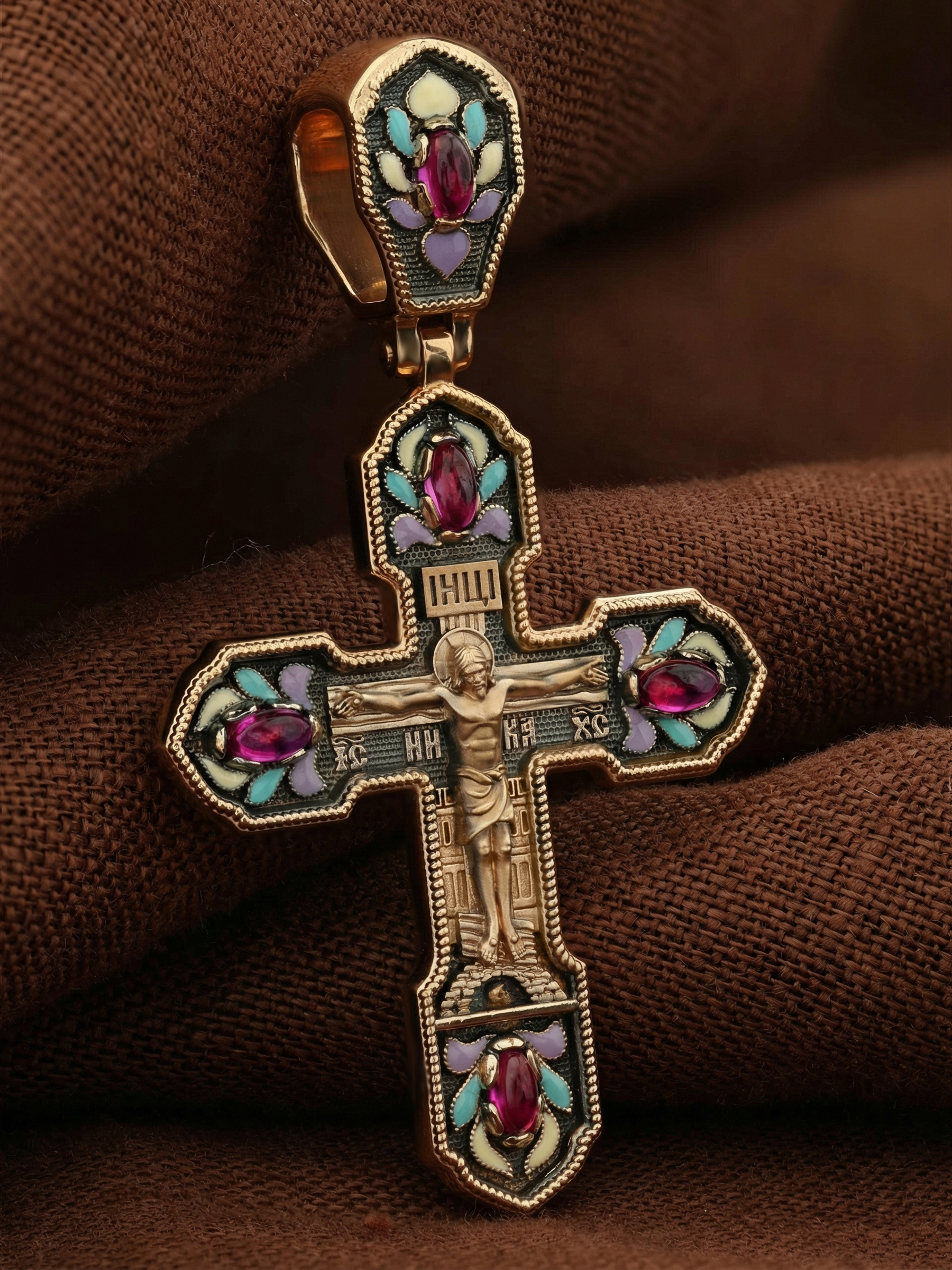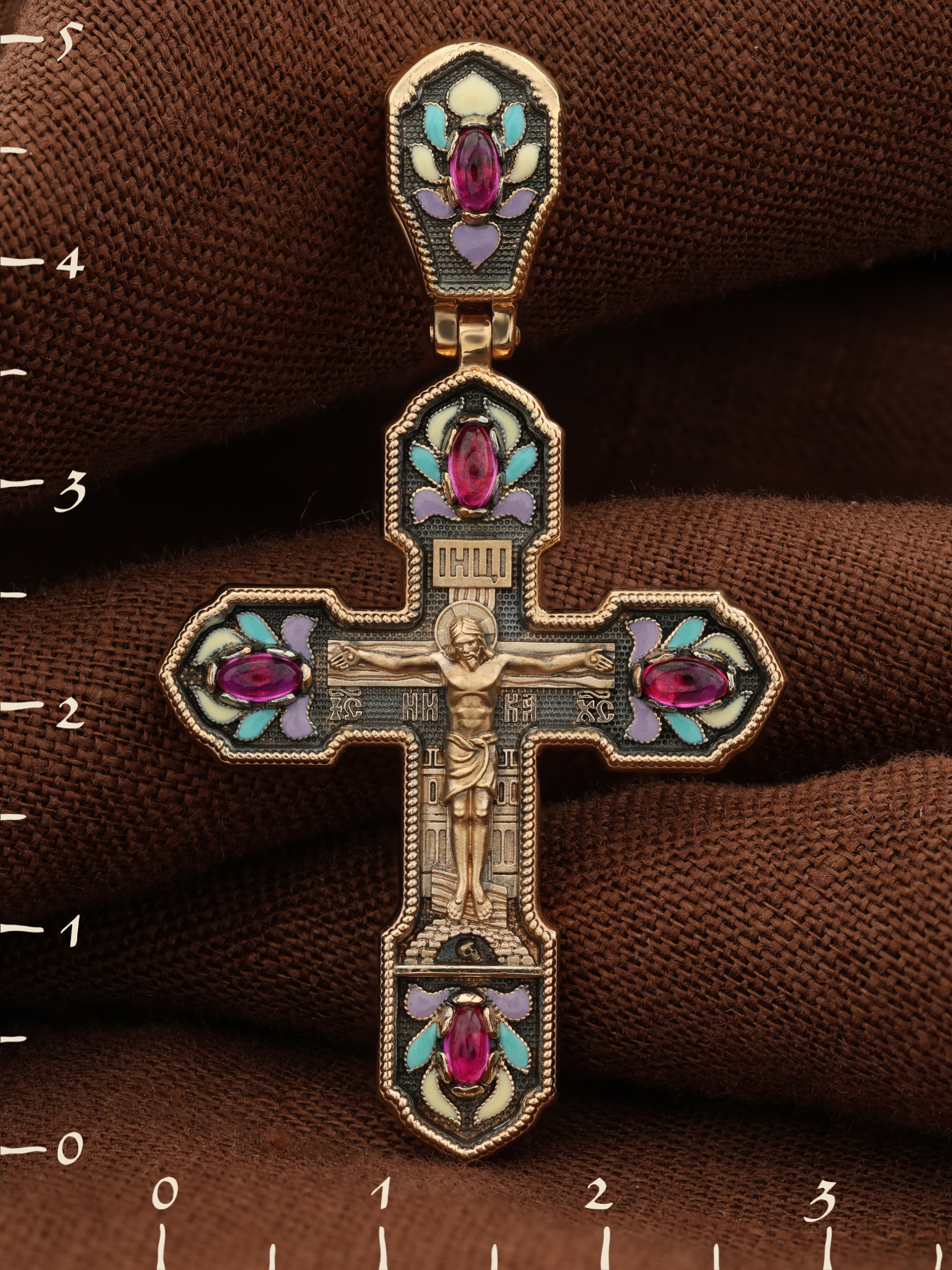 Крест из золота c эмаль и рубином