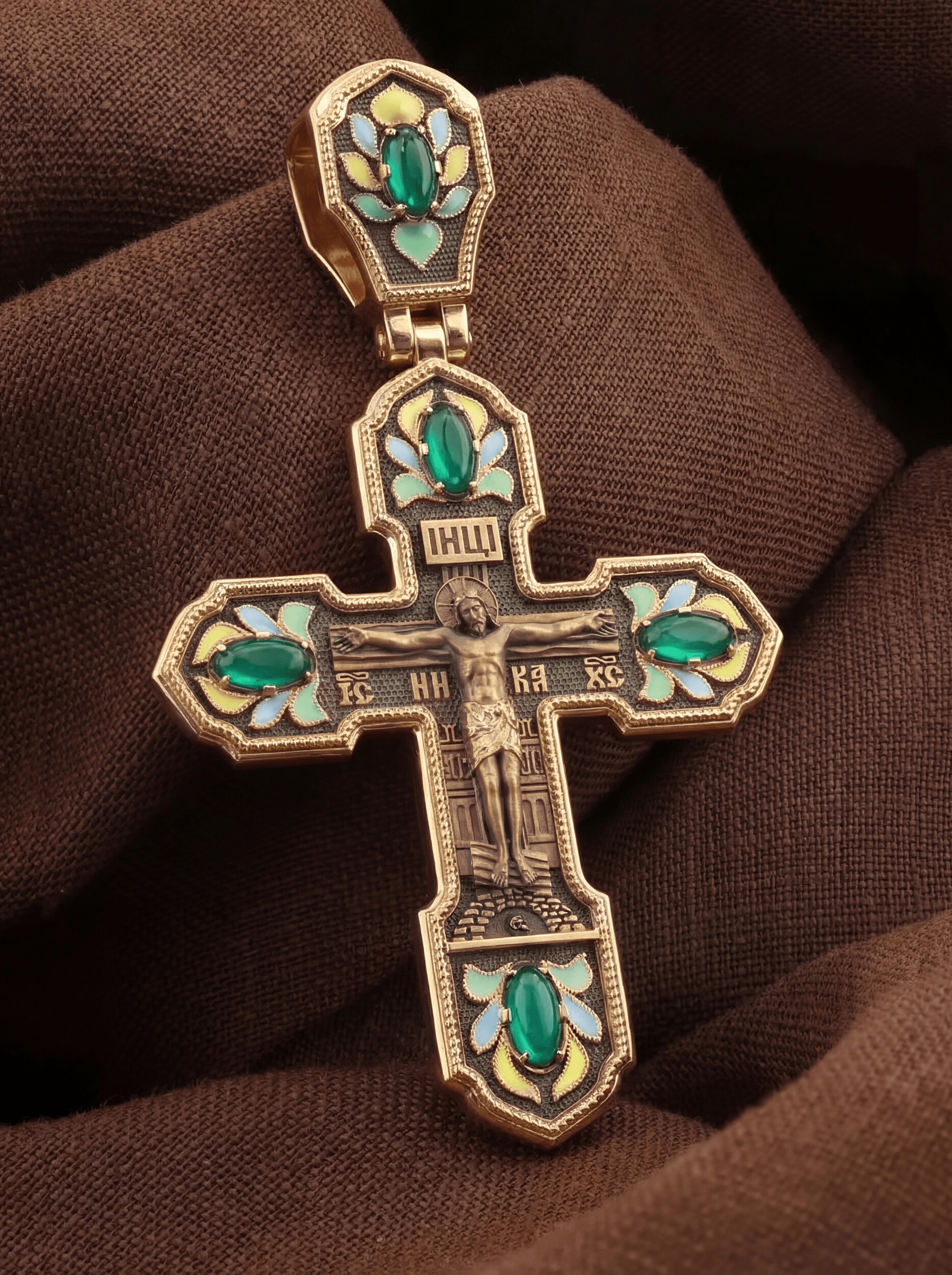 В верхней части Распятия у изголовья Иисуса Христа видна табличка с аббревиатурой «IНЦI» — «Иисус Назорей Царь Иудейский», которая, согласно Евангелию, была прибита к кресту после Его Распятия. Внизу, у подножия Господа, можно увидеть гору Голгофу с Главой Адамовой в пещере. Сам образ Распятия сопровождается каноническими надписями. Это святое имя Христа, которое принято писать на иконах сокращенно — «ИС ХС», словосочетание «СЫН БОЖИЙ», что означает божественную природу Иисуса Христа, и надпись «НИКА», обозначающая «победитель».