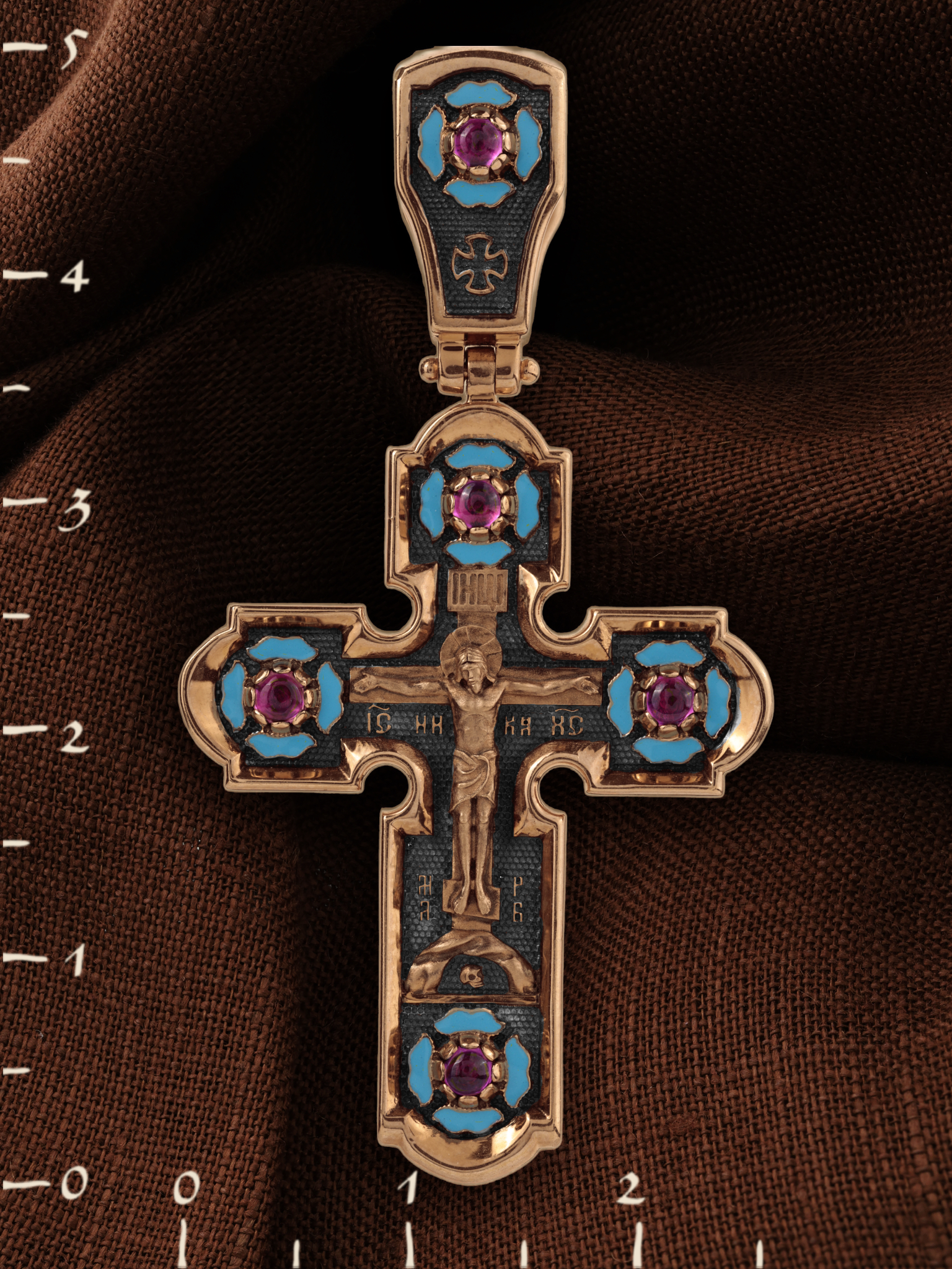 На лицевой стороне креста изображено Распятие Господа и Спасителя нашего Иисуса Христа. Христос, подвергнутый на кресте мучительной казни, своими страданиями искупил нас от древнего греха и даровал нам жизнь вечную. На верхней табличке, выше головы Иисуса, расположена надпись, составленная Понтием Пилатом — «IНЦI». Она означает «Иисус Назорей, Царь Иудейский». Надпись «IС» « ХС» означает Иисус Христос и слово «НИКА», что означает «победитель», помещаются на разных сторонах поперечной перекладины креста. В нижней части креста находится надпись «МЛРБ» — «место лобное рай бысть» означает, что место лобное стало раем. Крест стоит на горе камней, символизирующих Голгофу. Под подножием Креста изображена покоящаяся голова (череп) Адама, грехи которого Христос омыл Своею Кровью. Христос в Своей Божественной любви, над которой смерть не властна и которая, страдая, и не страдает в обычном смысле, простирает к людям со Креста Свои объятия, в которые призывается и привлекается весь мир.