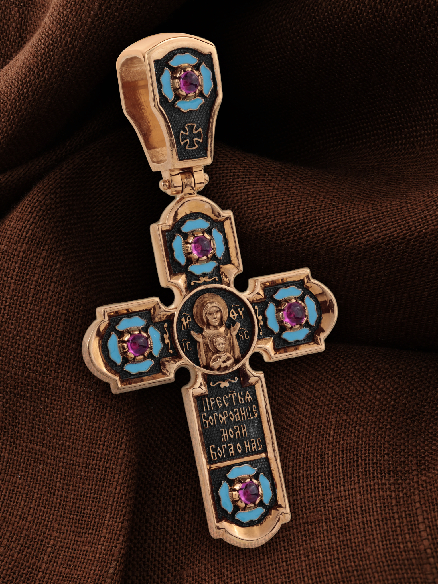 На оборотной стороне креста изображена икона Божией Матери «Знамение». Икона изображает Пресвятую Богородицу, молитвенно поднимающую Свои руки: на груди Ее, на фоне круглого щита, — благословляющий Божественный Младенец — Спас-Эммануил. Богоматерь изображена по пояс. Иконы Божией Матери, известные под именем «Знамение», появились на Руси в XI — XII веках, а называться так стали после чудесного знамения от Новгородской иконы, случившегося в 1170 году. Многочисленные списки с иконы Знамения известны по всей России. Многие из них просияли чудесами в местных храмах и были наименованы по месту явления чудес.