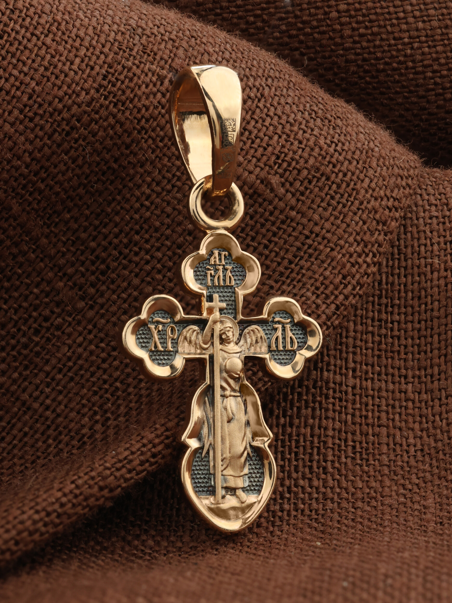 На оборотной стороне креста изображен святой Ангел-Хранитель в виде прекрасного юноши держащего в правой руке крест, а в левой — сферу. Ангел-Хранитель — это Ангел приставляемый Богом к человеку при крещении для охраны и помощи в добрых делах. Невидимо пребывая при нас постоянно, он, руководствуя нас ко спасению, не только по нашему желанию таинственно наставляет нас на все доброе и полезное, не только возносит наши молитвы к Богу, но еще и сам от себя охраняют и защищают нас от врагов видимых и невидимых, ходатайствует за нас пред Богом.