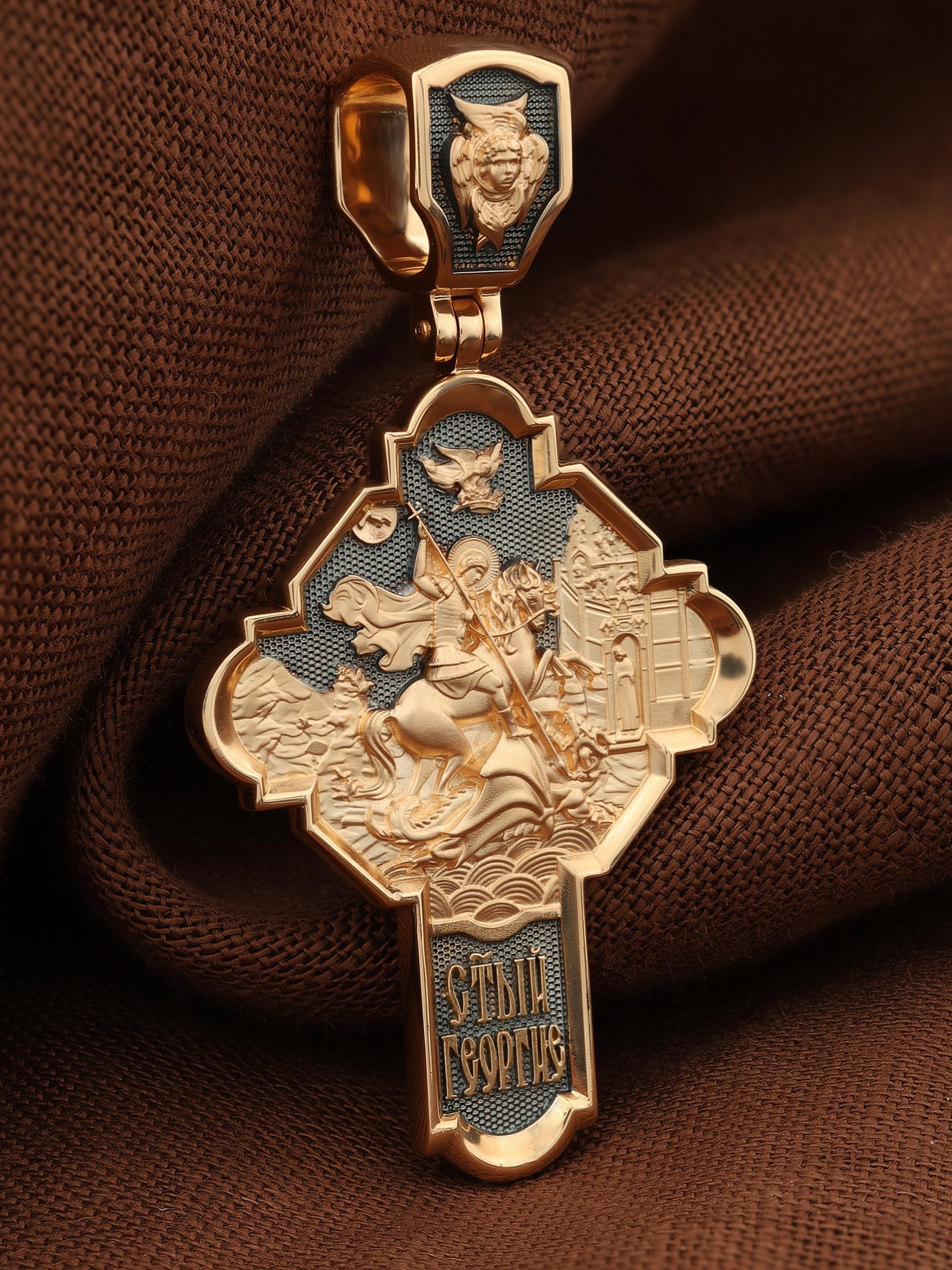 На оборотной стороне креста помещено изображение Святого Великомученика Георгия Победоносца — одного из самых почитаемых и удивительных святых. Георгий родился в Каппадокии (Малая Азия) в семье богатых и знатных горожан. Юношей поступил на службу к римскому императору Диоклетиану, за отличное знание военного дела и проявленную в боях и походах храбрость был приближен к императору и удостоен высокого воинского звания. Во время начавшихся гонений на христиан, перешел на сторону гонимых и, отвергнув человеческий страх, стал ярым проповедником учения Христа. Мучители подвергли опального воеводу жесточайшим восьмидневным пыткам и казнили его (обезглавили) в возрасте около тридцати лет в 303 году. Георгий изображен как воитель, сидящий на вздыбленном коне и поражающий копьем огнедышащего змея. Слева над образом изображена благословляющая Божия десница. Над святым изображен ангел возлагающий на него венец мученика. Змей символизирует собою сатанинские силы. Молитвами вознесенными к Всевышнему и своей непреклонной верой он смог одолеть чудовище. Святой убил змея, спас царскую дочь, принесенную в жертву, и жителей города, их души от влияния дьявола, породив в них надежду и веру в Господа, призывая людей принять христианскую веру. На кулонном кольце изображен шестикрылый Ангел — Серафим.