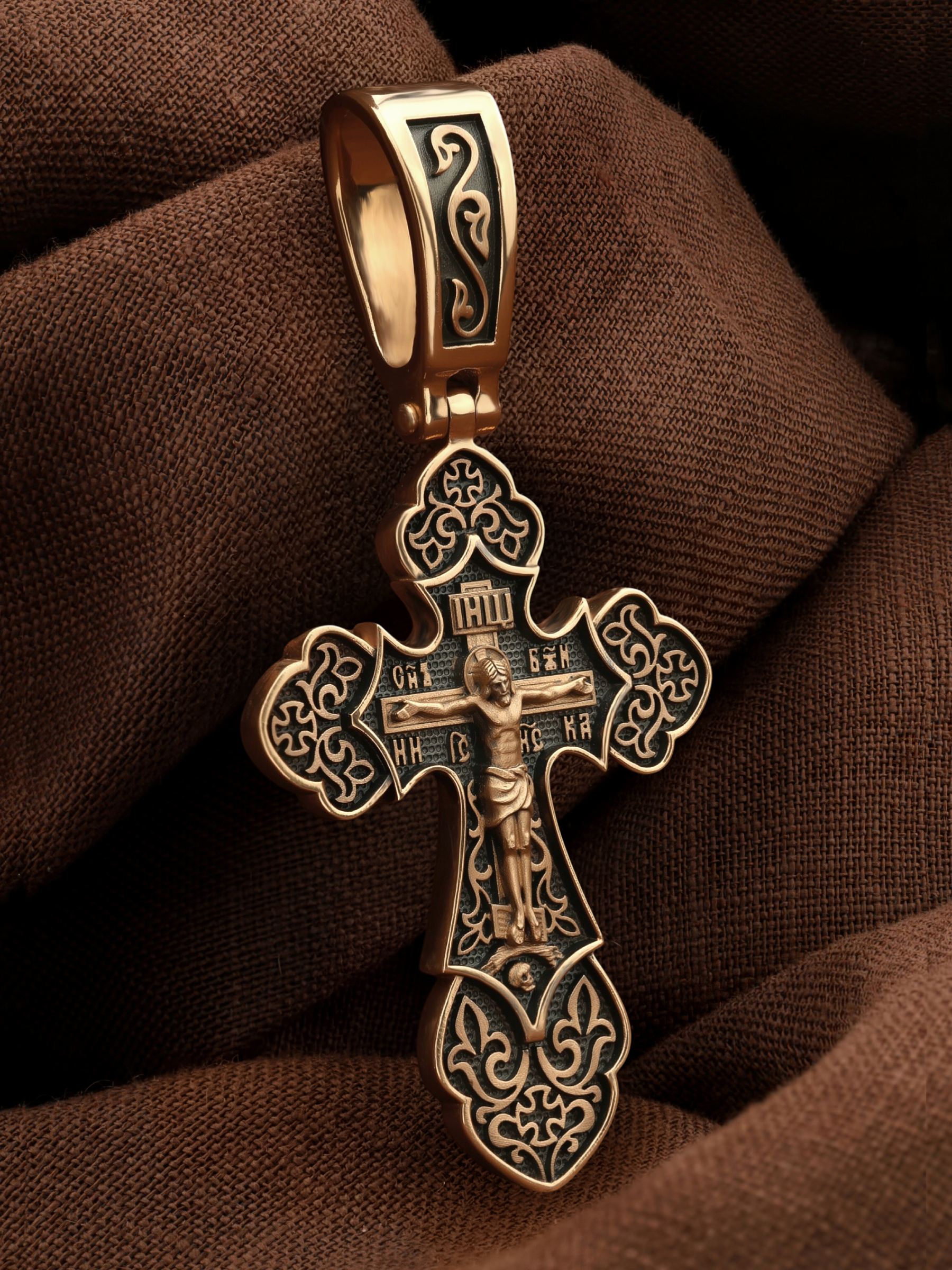 Крест с рельефным изображением Распятия в окружении пышных цветов и ажурного узора, напоминает нам о красоте Райского сада. На лицевой стороне креста изображено Распятие, потому что это орудие казни Иисус Христос сделал орудием победы над грехом и смертью. Своими страданиями Он искупил грехи человечества, умерев и сошествовав во ад, победил сатану, освободил души праведников от вечной смерти и открыл им небесные врата рая. Жертва Христа сделала возможным спасение для каждого человека. На православном кресте Христос не умирает, а свободно простирает руки, ладони Иисуса открыты, будто он хочет обнять все человечество, даря им свою любовь и открывая путь к вечной жизни. Верхняя перекладина символизирует собой табличку с надписью «IHЦI» — Иисус Назарянин Царь Иудейский. Над перекладиной пишется словосочетание «СЫН БОЖИЙ», ниже перекладины добавляется: «НИКА» (греч. — Победитель) и сокращенное имя Спасителя «IC XC» — Иисус Христос. Возвышение, на котором стоит Крест, символизирует гору Голгофу, на которой произошло Распятие. У подножия Креста изображают прах Адама, обозначенный черепом.