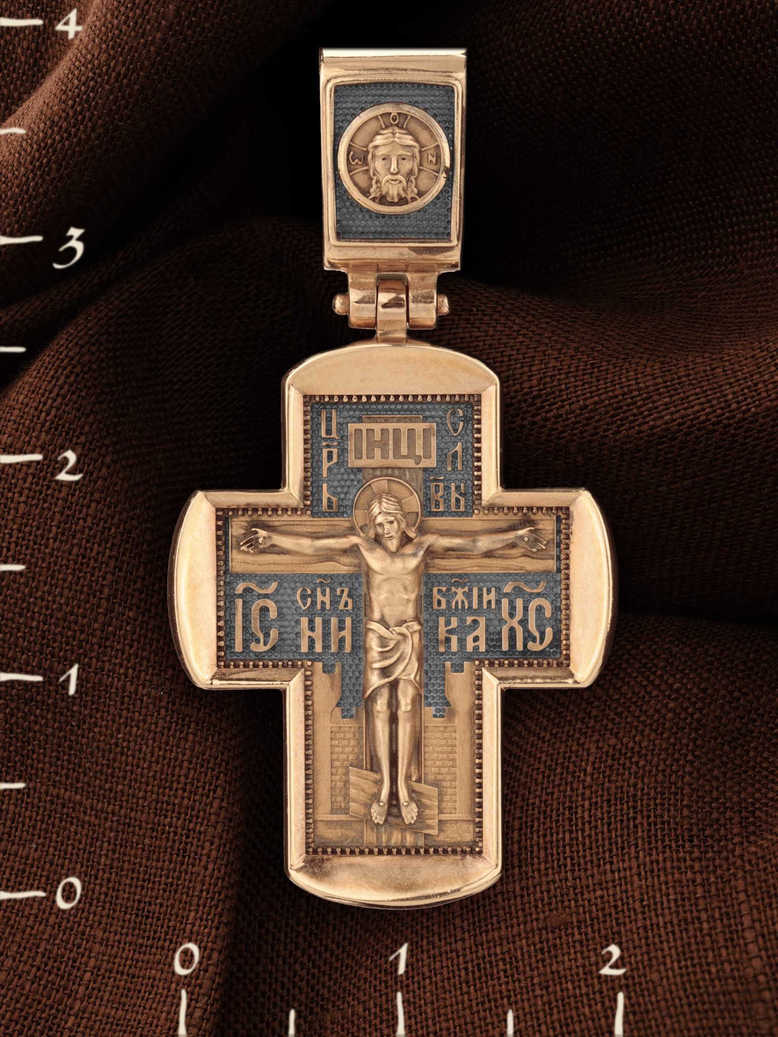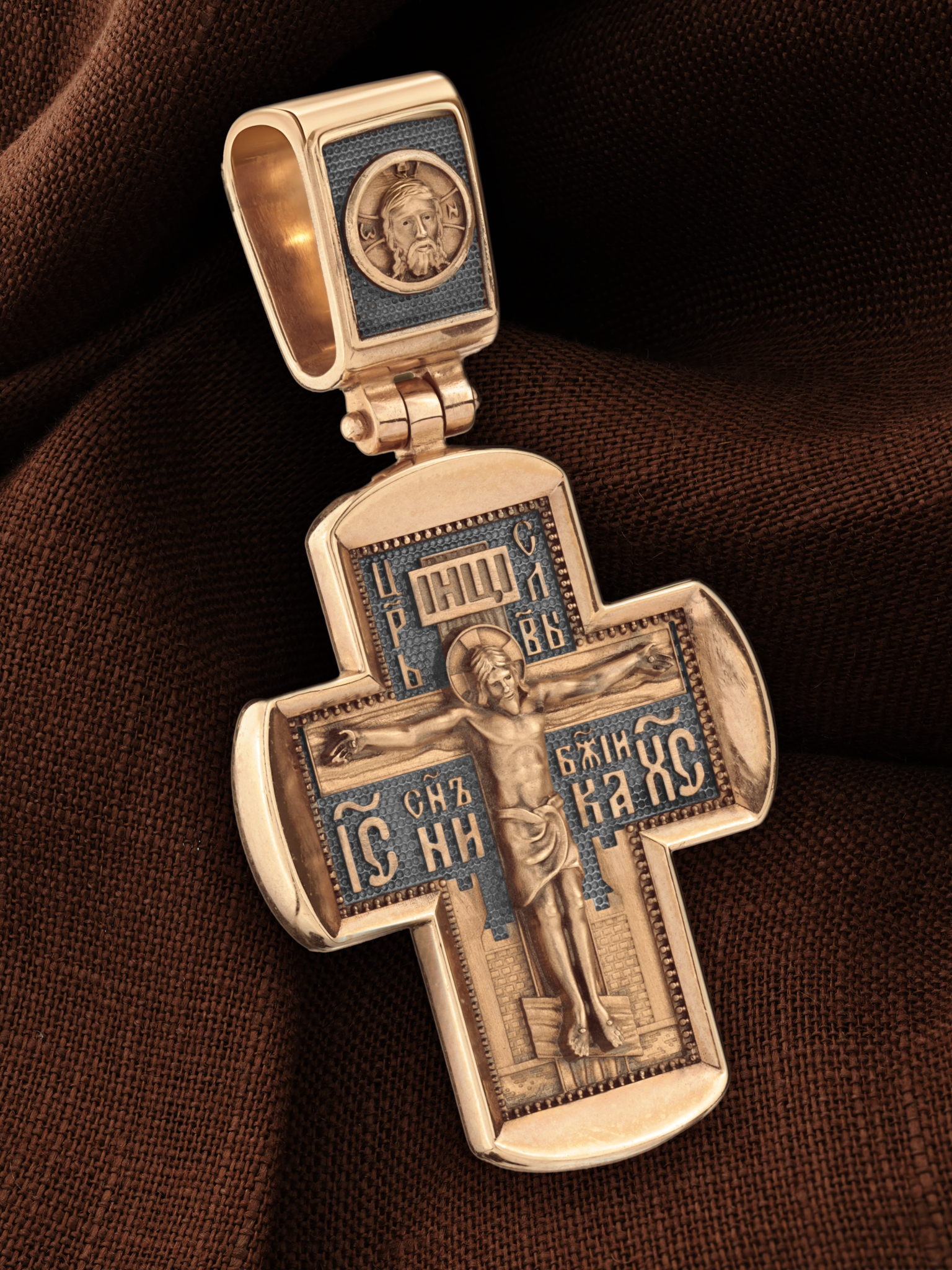 На лицевой стороне креста изображено Распятие Господа и Спасителя нашего Иисуса Христа, отдавшего Себя на смерть, для искупления грехов мира. Крест является символом жертвенной любви Всеблагого Бога к падшим людям, всепобеждающим духовным оружием христиан, основанием и средоточием церковной жизни. Над вершиной Распятия помещена надпись «Царь Славы». На верхней табличке, выше головы Иисуса, расположена надпись, составленная Понтием Пилатом — «IНЦI». Она означает «Иисус Назорей, Царь Иудейский». Распятие сопровождается каноническими надписями. Надпись «IC» «ХC», означает Иисус Христос, надпись «НИКА» (греч. Победитель) и словосочетание «СЫН БОЖИЙ», что означает божественную природу Иисуса Христа, помещаются на разных сторонах поперечной перекладины креста. Сзади — Иерусалимская стена. На кулонном кольце изображен Спас Нерукотворный — образ Господа и Спасителя нашего Иисуса Христа, чудесно отпечатавшийся на плате, котором Христос вытер свой лик.