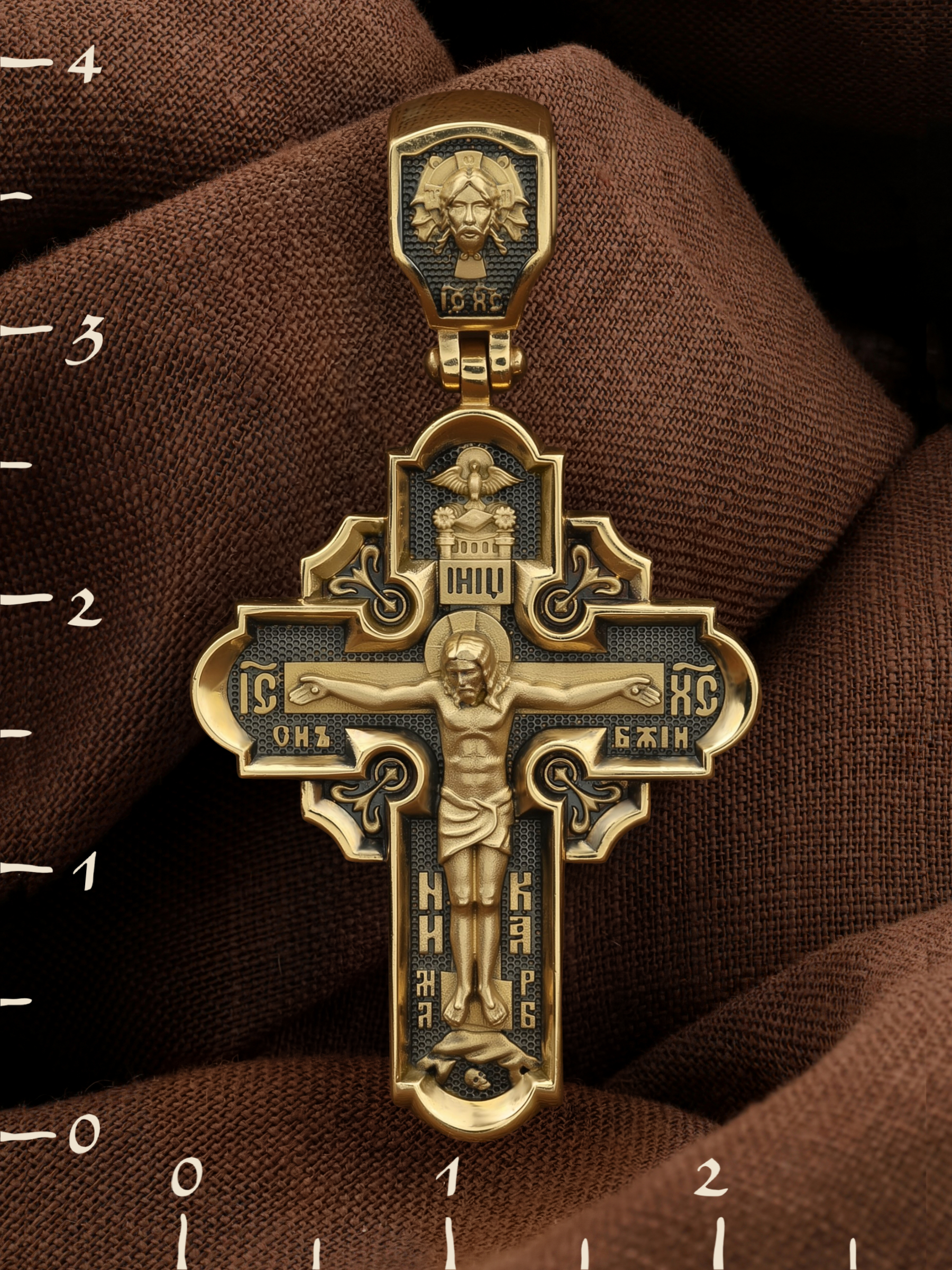 На лицевой стороне креста изображено Распятие Господа и Спасителя нашего Иисуса Христа, отдавшего Себя на смерть, чтобы другие могли жить — жить вечной жизнью, жить с Богом. Своею кровью Господь освятил крест и сделал его проводником Своей благодати, источником освящения верующих. На верхней табличке, выше головы Иисуса, расположена надпись, составленная Понтием Пилатом — «ИНЦИ». Она означает «Иисус Назорей, Царь Иудейский». Надпись «IС ХС» означает Иисус Христос помещается на разных сторонах поперечной (большой) перекладины креста. На кулонном кольце помещено изображение Духа Святого в виде голубя, сходящего с Небес
