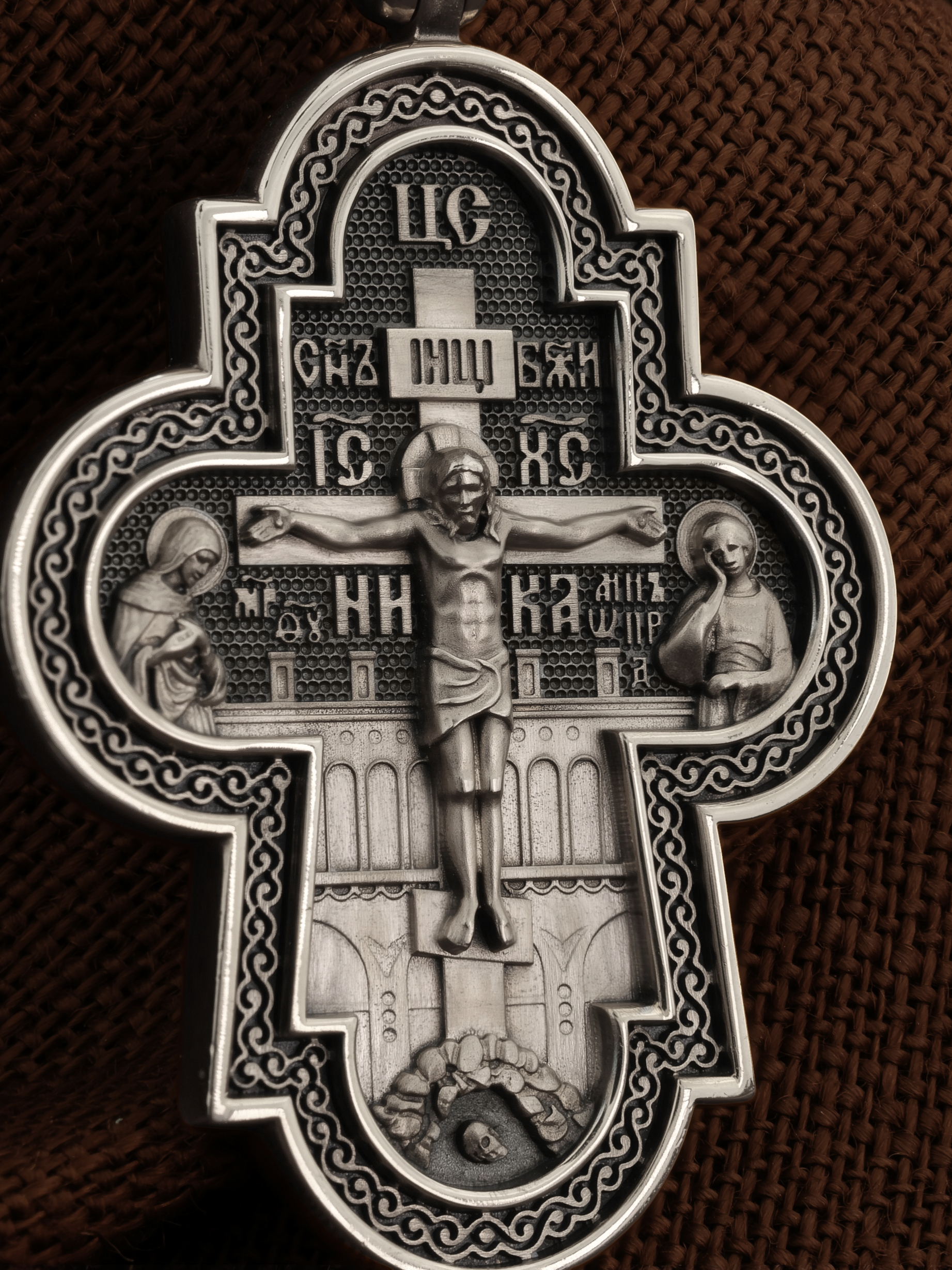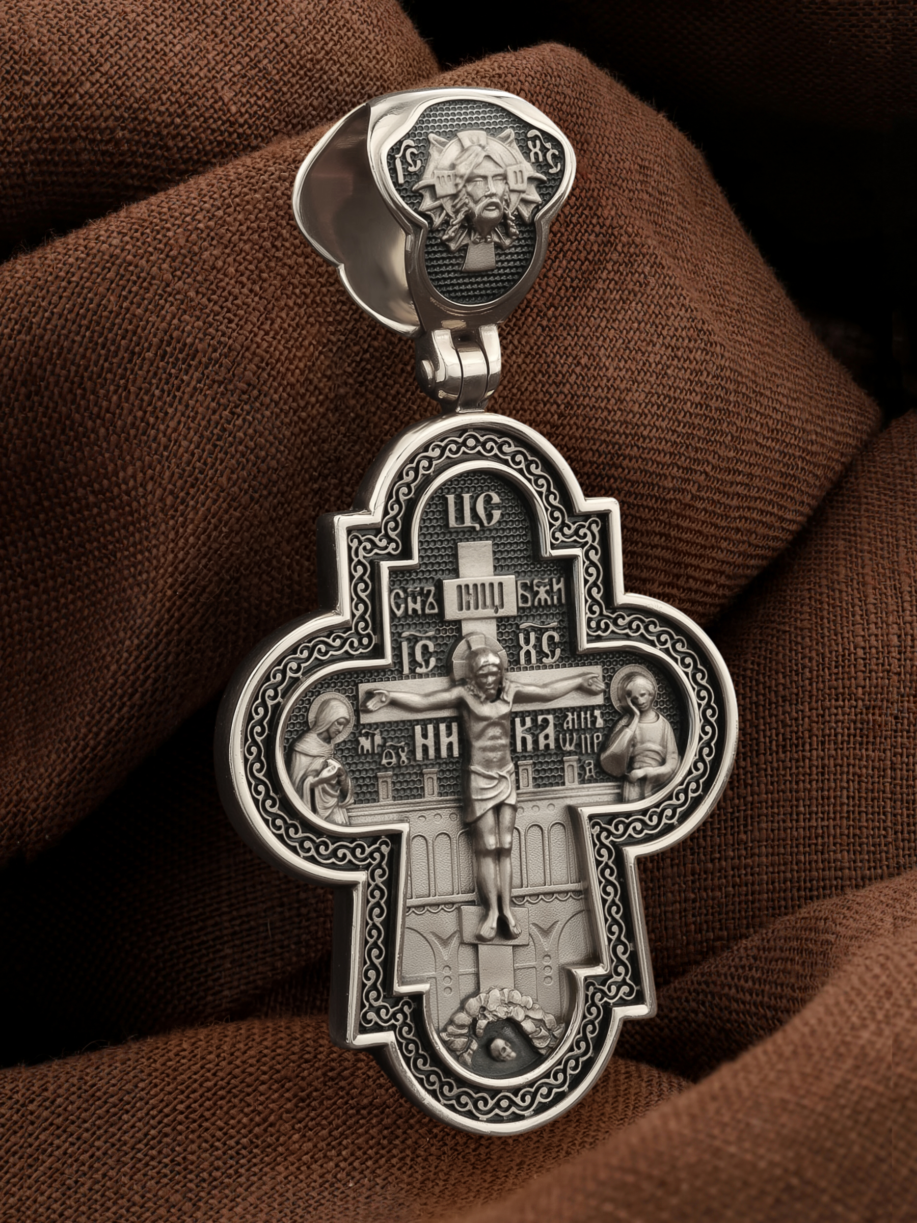 На лицевой стороне креста изображено Распятие Господа и Спасителя нашего Иисуса Христа, отдавшего Себя на смерть, чтобы другие могли жить — жить вечной жизнью, жить с Богом. Через крестную жертву Бог раскрывает нам Свою безмерную любовь и призывает к ответной любви. Своею кровью Господь освятил крест и сделал его проводником Своей благодати, источником освящения верующих. На верхней табличке, выше головы Иисуса, расположена надпись, составленная Понтием Пилатом — «IНЦI». Она означает «Иисус Назорей, Царь Иудейский». Распятие сопровождается каноническими надписями. Над Распятием находится надпись «Царь Славы». Надпись «IС» « ХС» означает Иисус Христос и помещается на разных сторонах поперечной (большой) перекладины креста. Рядом расположены надпись «Сын Божий» и слово «НИКА», что означает «победитель». Слева от Распятия изображена Пресвятая Богородица, справа — апостол и евангелист Иоанн Богослов, один из ближайших учеников Иисуса Христа. За Распятием высится Иерусалимская стена, в знак того, что Господь был распят вне стен города. Возвышение, на котором стоит Крест, символизирует гору Голгофу, на которой произошло Распятие. Под подножием Креста изображена покоящаяся голова (череп) Адама. Над На кулонном кольце изображен Нерукотворный образ Господа и Спасителя нашего Иисуса Христа, чудесно отпечатавшийся на плате, котором Христос вытер свой лик.