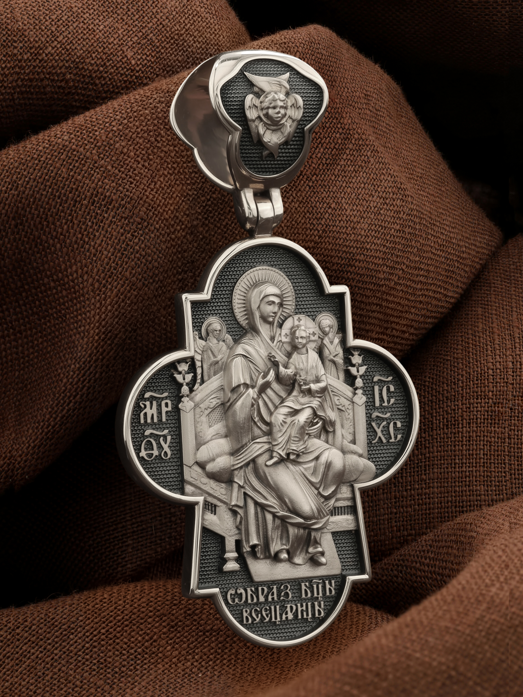 На оборотной стороне креста изображена икона Божией Матери «Всецарица» или «Пантанасса», на которой Пресвятая Богородица восседает на царском троне. На руках Ее — Богомладенец Христос со свитком в левой руке и благословляющий десницей. Правой рукой Богородица указывает на Своего Царственного Сына, как на Спасителя мира. Чудотворная икона была написана в XVII веке и находится на Святой Горе Афон, в одном из древних греческих монастырей — Ватопеде. По молитвам перед иконой совершается множество чудесных исцелений. Пречистая Богородица наставляет на праведный путь, помогает укрепить веру, найти утешение. На кулонном кольце изображен шестикрылый Серафим.