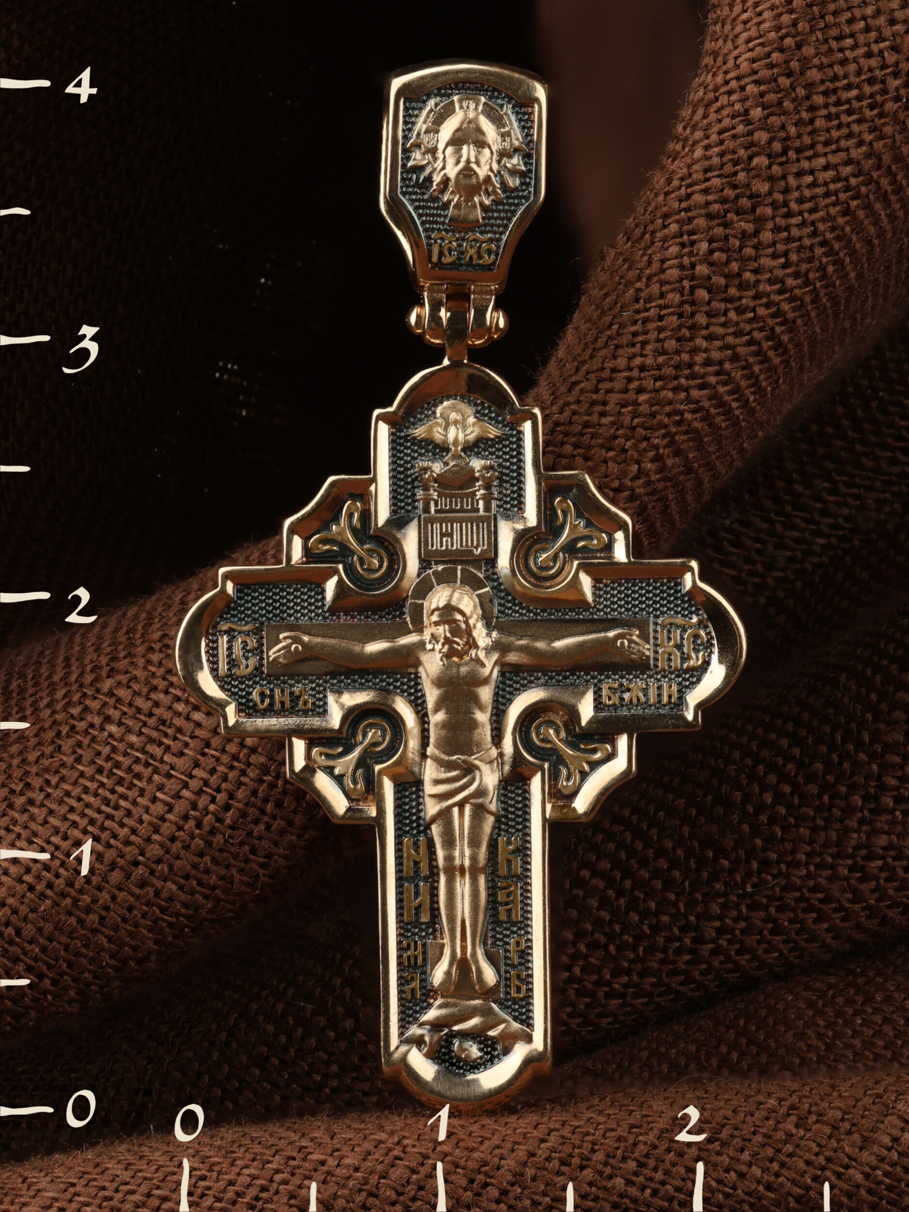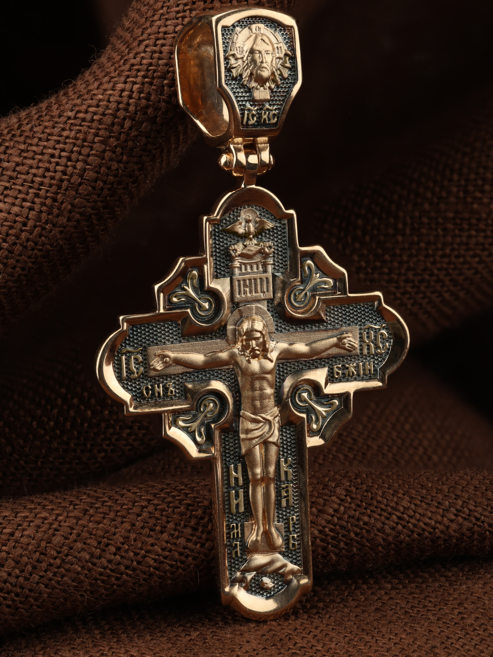 На лицевой стороне креста изображено Распятие Господа и Спасителя нашего Иисуса Христа, отдавшего Себя на смерть, чтобы другие могли жить — жить вечной жизнью, жить с Богом. Своею кровью Господь освятил крест и сделал его проводником Своей благодати, источником освящения верующих. На верхней табличке, выше головы Иисуса, расположена надпись, составленная Понтием Пилатом — «ИНЦИ». Она означает «Иисус Назорей, Царь Иудейский». Надпись «IС ХС» означает Иисус Христос помещается на разных сторонах поперечной (большой) перекладины креста. На кулонном кольце помещено изображение Духа Святого в виде голубя, сходящего с Небес