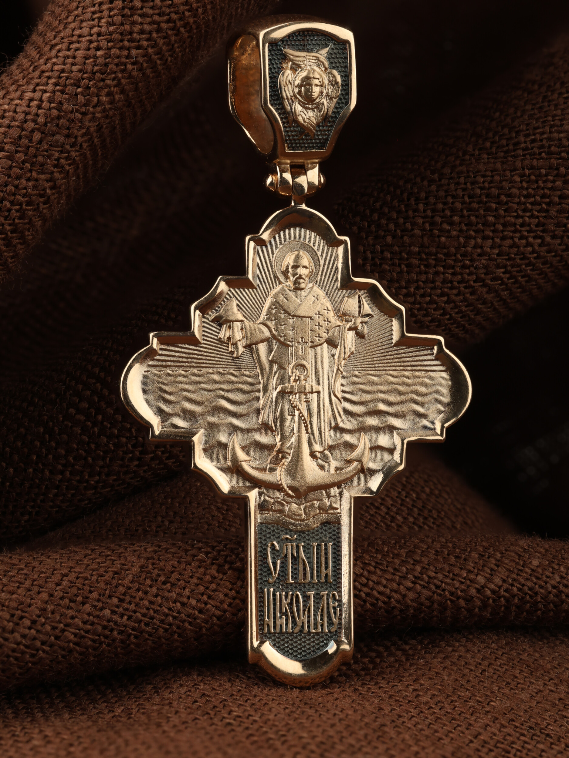 На оборотной стороне креста изображен Святитель Николай архиепископ Мир Ликийских, Чудотворец. Он является одним из самых почитаемых святых в православном мире. Много великих и преславных чудес сотворил на земле и на море великий Святитель Николай Угодник. Он помогал сущим в бедах, укрощал штормы, спасал от потопления и выносил на сушу из глубины морской, освобождал из плена и приносил освобожденных домой, избавлял от уз и темницы, защищал от посечения мечом, освобождал от смерти и подавал многим различные исцеления, слепым прозрение, хромым хождение, глухим слух, немым дар слова. Святитель Николай Чудотворец изображен стоящим в полный рост в лодке. В деснице святой держит мыс Горн, а в левой — корабль. Эта икона была написана путешественником и священником Фёдором Конюховым. Во время одного из своих путешествий, проходя пролив Дрейка, Фёдор, понимая, что выжить в такой бушующей стихии невозможно, стал молиться Святителю Николаю Чудотворцу. Он мысленно пообещал себе: «если пройду мыс Горн, то построю часовню Николаю Чудотворцу»… И в следующий миг, совсем неожиданно — волны утихли. Яхта Конюхова благополучно прошла опасный участок пути. Вернувшись домой, Фёдор Конюхов построил часовню в благодарность за свое спасение.