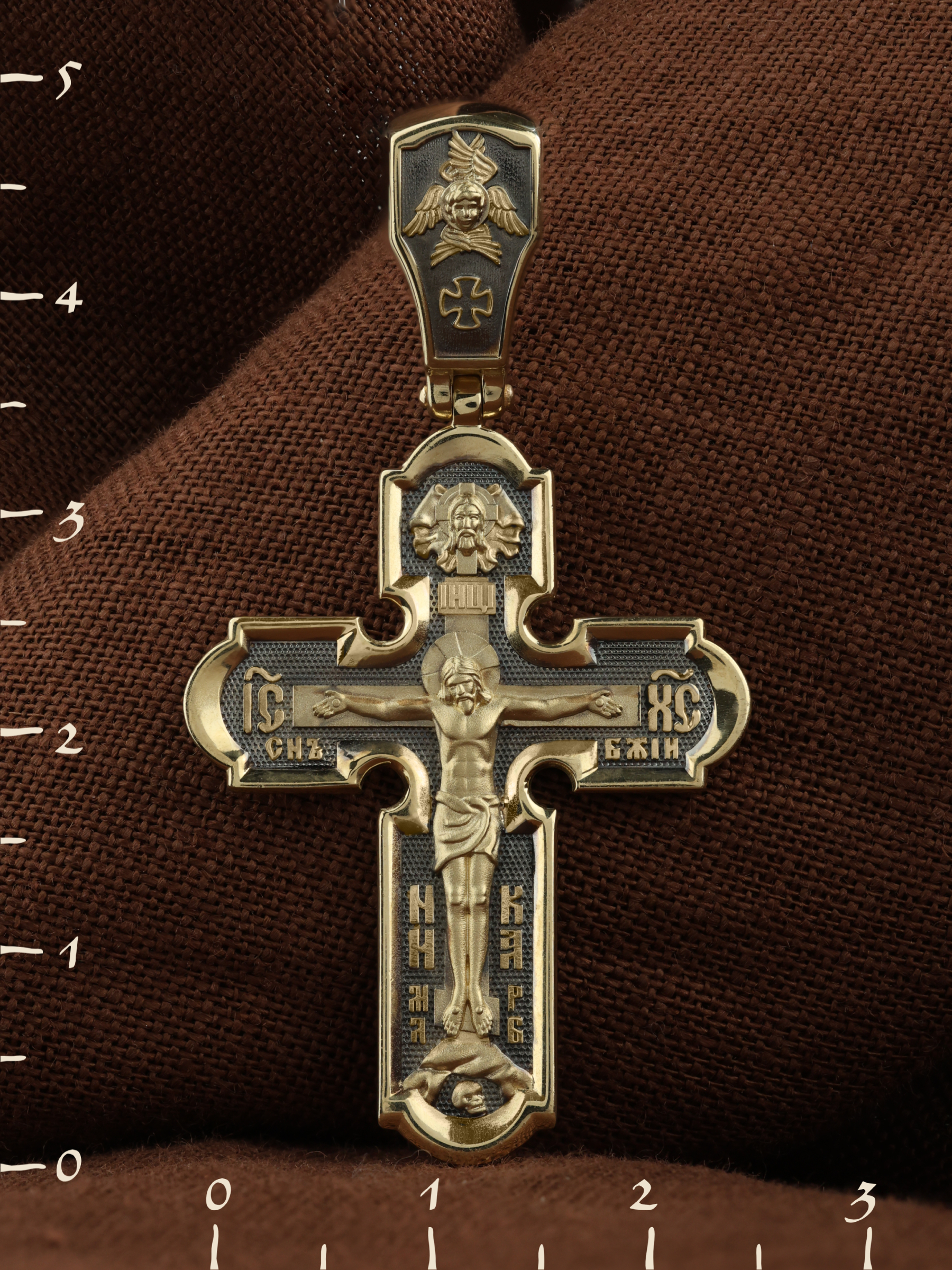 На лицевой стороне нательного креста по традиции изображено Распятие Господа нашего Иисуса Христа. Крест Господень стоит на небольшом каменистом возвышении, символизирующем гору Голгофу, которая обозначена буквами МЛРБ (Место Лобное Рай Бысть). Над головой Господа на поперечной перекладине написано «ИНЦИ», что символизирует табличку, которая была прибита к Кресту, с надписью «Иисус Назорей Царь Иудейский». Этим иудеи хотели посмеяться над Христом, не зная, что распинают истинного Царя всех царей. По сторонам основной перекладины расположены позолоченные рельефные инициалы Христа «ИС ХС». Под перекладиной, по сторонам древа, находится надпись «СЫН БОЖИЙ», а в основании креста — надпись «НИКА» (Победитель).