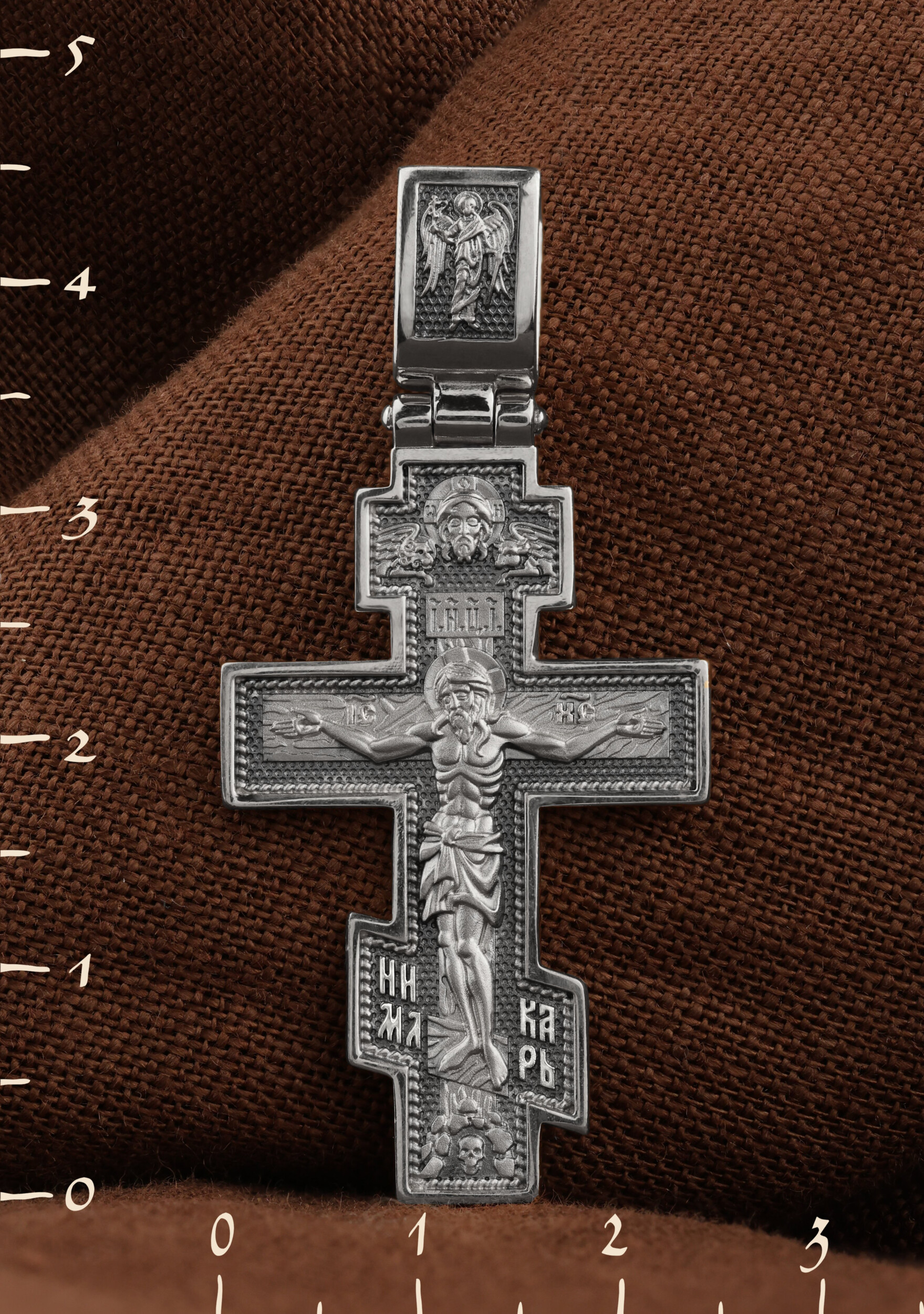 На лицевой стороне креста изображено Распятие, потому что это орудие казни Иисус Христос сделал орудием победы над грехом и смертью. Своими страданиями Он искупил грехи человечества, умерев и сошествовав во ад, победил сатану, освободил души праведников от вечной смерти и открыл им небесные врата рая. Жертва Христа сделала возможным спасение для каждого человека. На православном кресте Христос не умирает, а свободно простирает руки, ладони Иисуса открыты, будто он хочет обнять все человечество, даря им свою любовь и открывая путь к вечной жизни. Верхняя перекладина символизирует собой табличку с надписью «IHЦI» — Иисус Назарянин Царь Иудейский. У подножия добавляется: «НИКА» (греч. — Победитель) и «МЛРБ» — Место Лобное Рай Бысть. Возвышение, на котором стоит Крест, символизирует гору Голгофу, на которой произошло Распятие. У подножия Креста изображают прах Адама, обозначенный черепом.