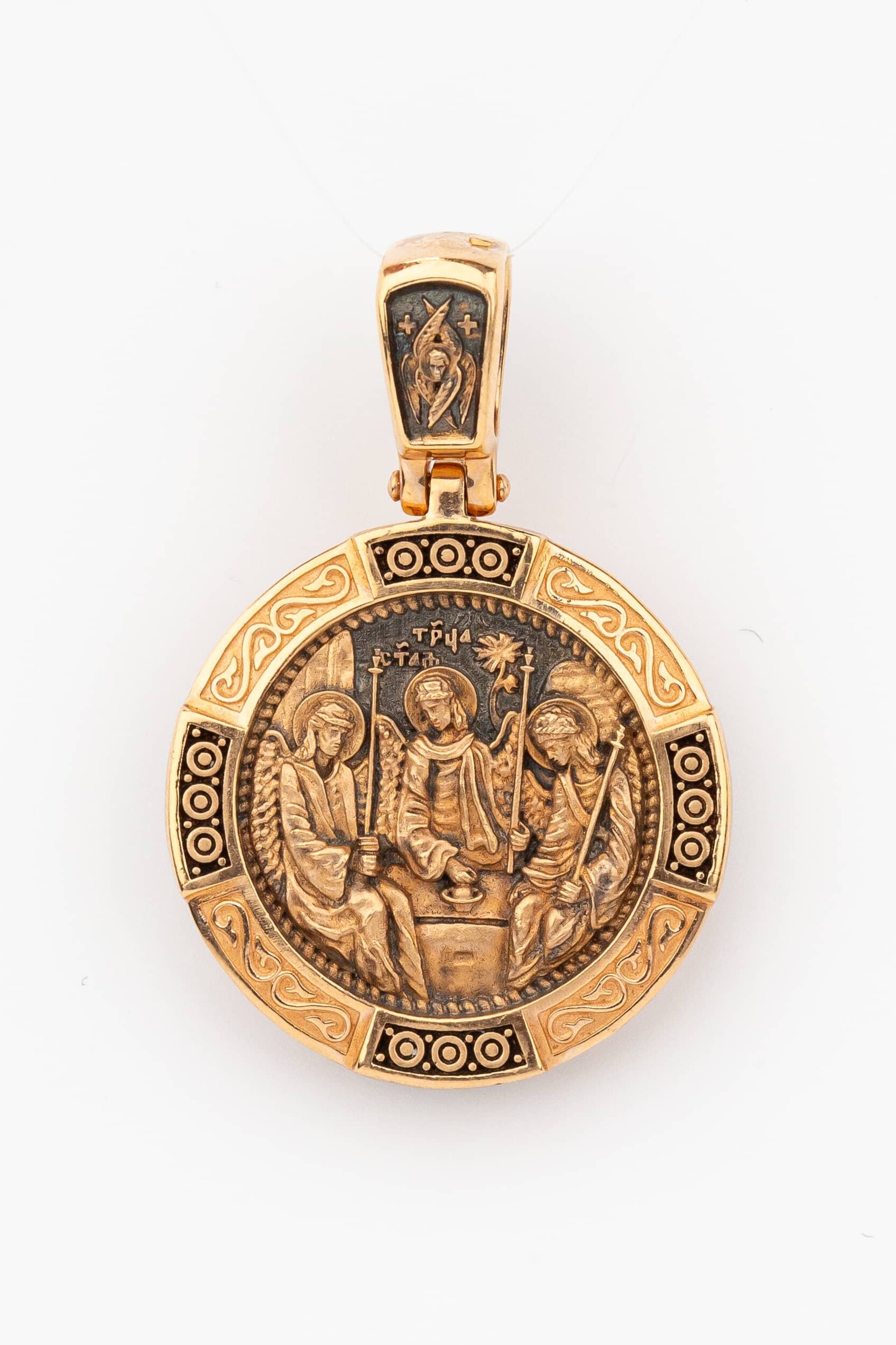 На лицевой стороне изображена икона Святой Троицы. Это образ Триединого Бога явившегося в виде трех Ангелов праотцу Аврааму. Ангелы сидят за трапезным столом вокруг чаши, которая символизирует грядущую жертву Второго Лица Пресвятой Троицы, Бога Сына.