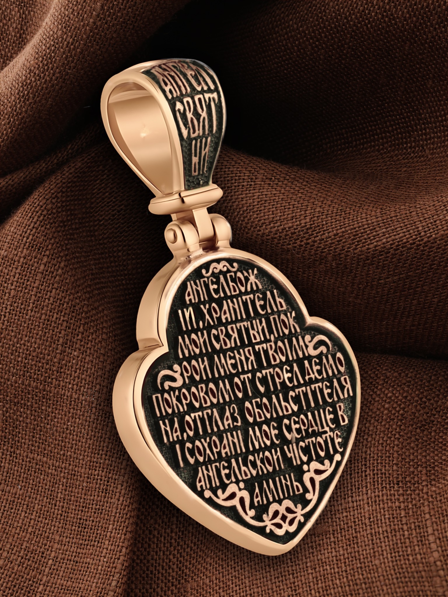 На оборотной стороне образка написана молитва: «Ангеле Божий, Хранитель мой Святый, покрой меня твоим покровом от стрел демона, от глаз обольстителя и сохрани мое сердце в ангельской чистоте. Аминь».