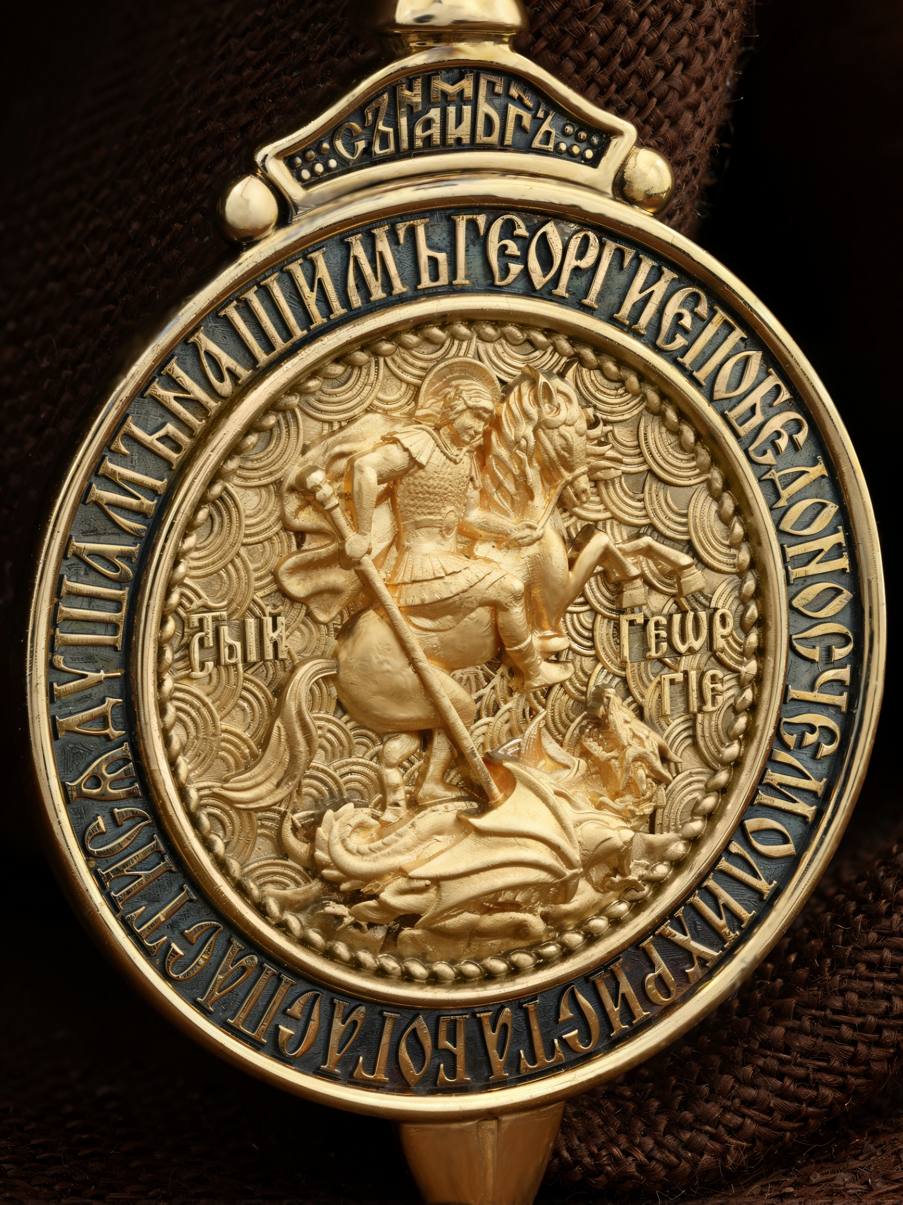 Основой композиции лицевой стороны является изображение Святого Великомученика Георгия Победоносца — одного из самых почитаемых и удивительных святых. На Руси он известен как Юрий или Егорий, покровитель воинов, помощник в крестьянском труде. На образке он изображен как воитель, сидящий на вздыбленном коне и поражающий копьем огнедышащего змея. Змей символизирует собою сатанинские силы. Молитвами вознесенными к Всевышнему и своей непреклонной верой он смог одолеть чудовище. Святой убил змея, спас царскую дочь, принесенную в жертву, и жителей города, их души от влияния дьявола, породив в них надежду и веру в Господа, призывая людей принять христианскую веру. Изображение святого великомученика Георгия Победоносца обрамлено словами молитвы: «Геогрие Победоносче, моли Христа Бога спастися душам нашим».