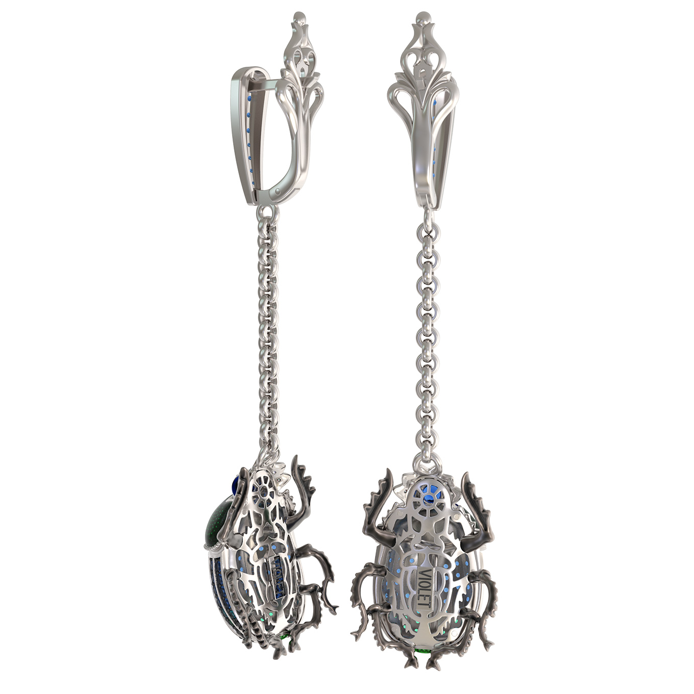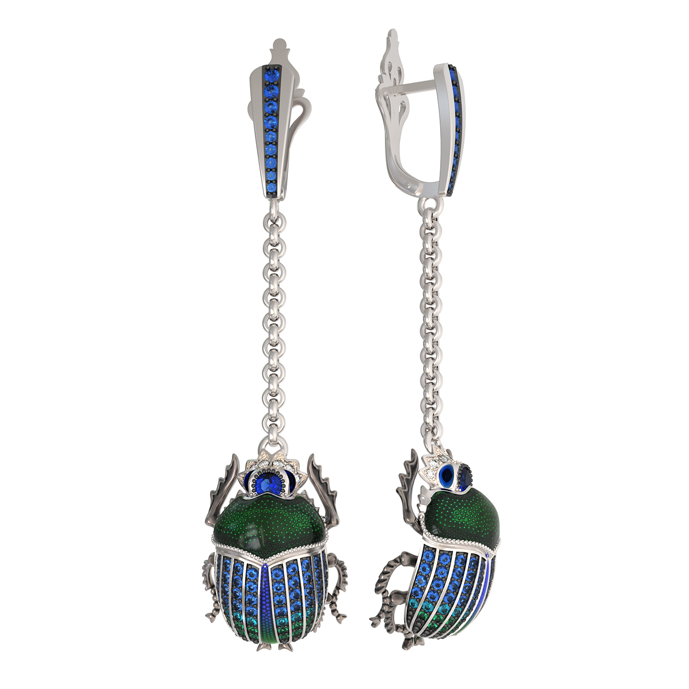 Серьги из белого золота c эмаль, фианитом и сапфиром