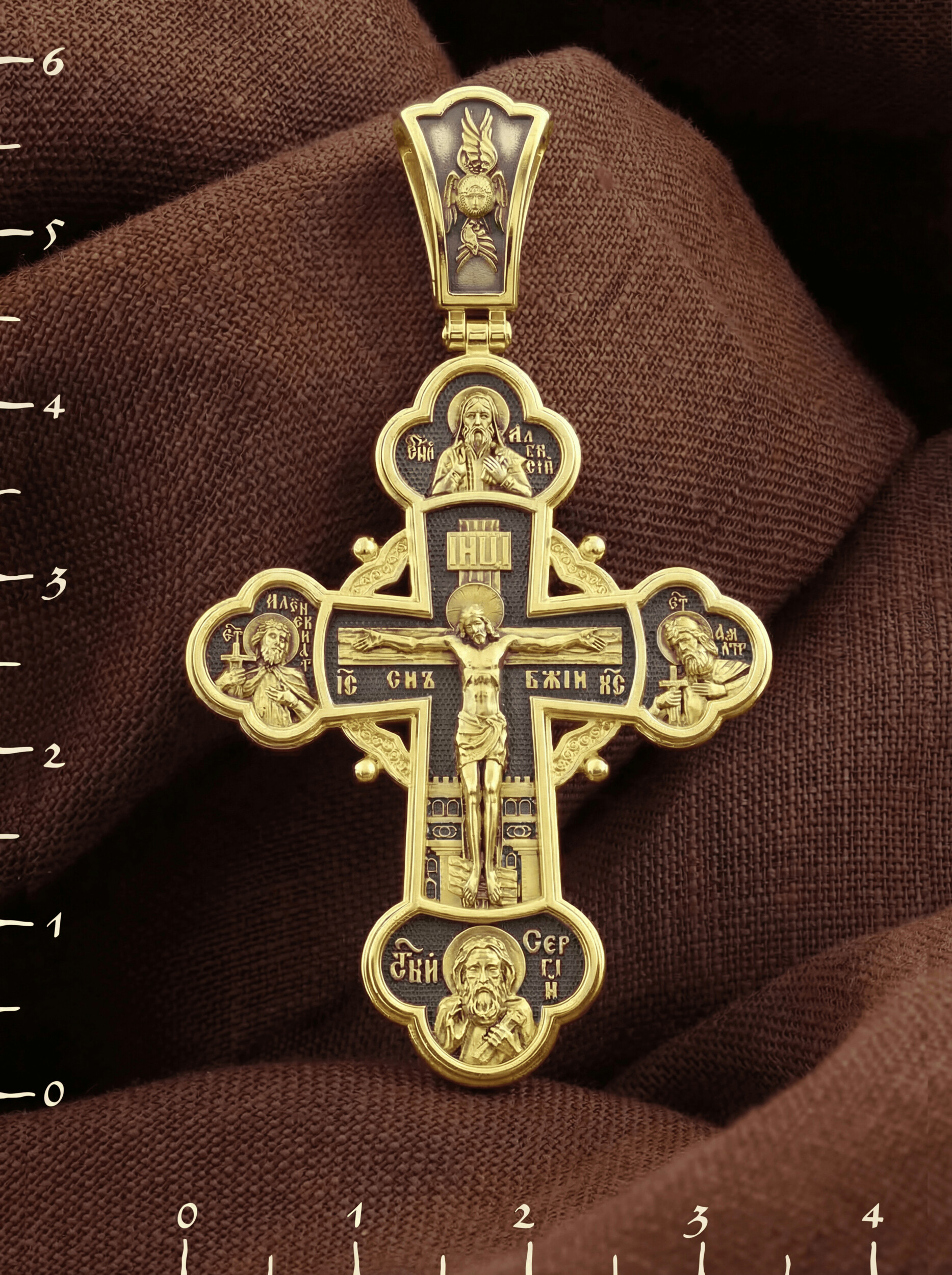 На лицевой стороне креста в центре изображено Распятие Господа Иисуса Христа. Слева от Господа находится святой благоверный князь Александр Невский, справа — святой благоверный князь Димитрий Донской. Святые князья почитаются как покровители воинов и защитники от врагов телесных и душевных. Вверху и над Распятием — образ митрополита московского святителя Алексия. Он почитается как помощник в воспитании детей и целитель, особенно при болезни глаз. Внизу — икона преподобного Сергия Радонежского, великого чудотворца и целителя. К нему обращаются в различных болезнях, тяжелых жизненных ситуациях, а также когда у детей возникают сложности в обучении.