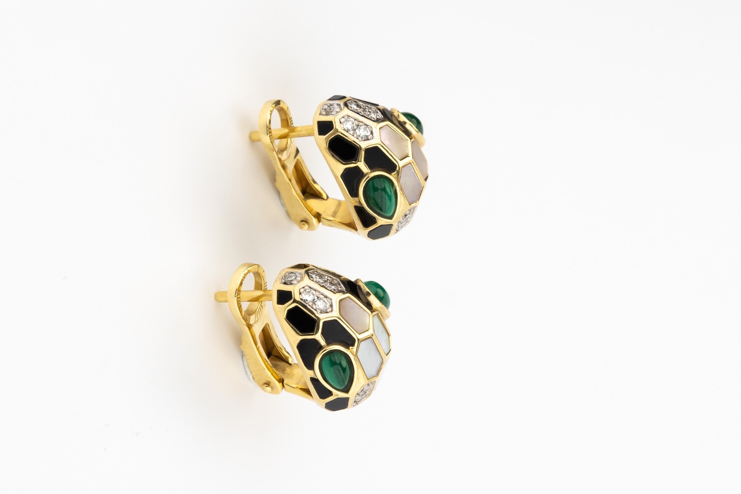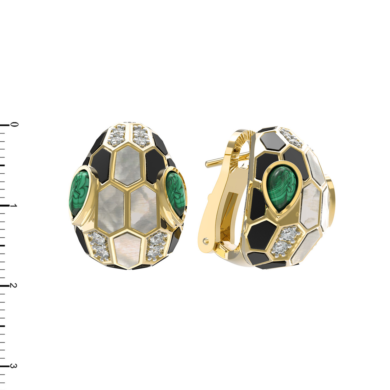 Серьги из лимонного золота c бриллиантами, рубином, ониксом, малахитом и перламутром
