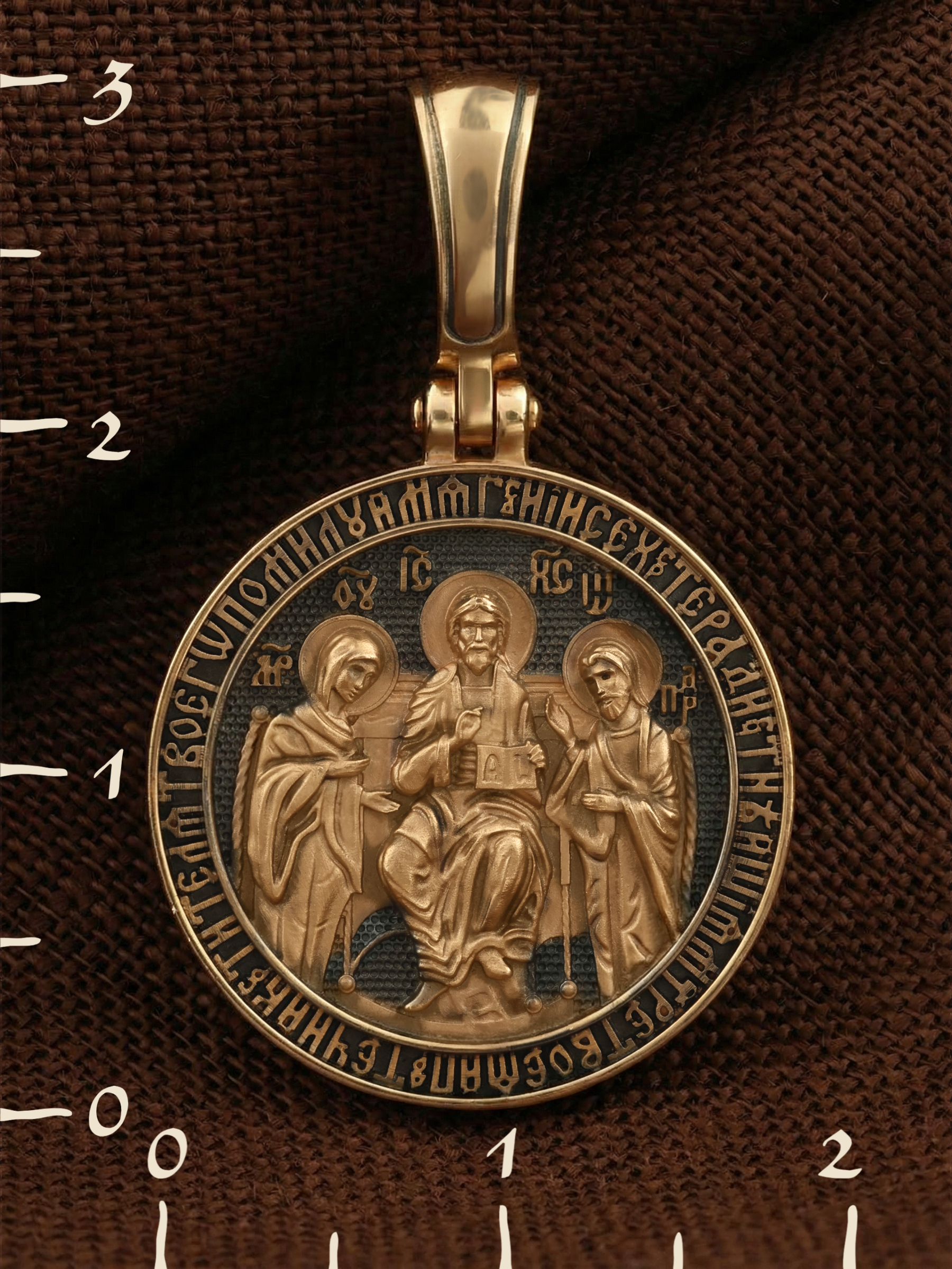 На лицевой стороне образка изображена икона Иисуса Христа Деисус. Он представлен в образе Господа Вседержителя, восседающего на престоле. В его руках — Книга Судеб всего человечества. С двух сторон ему предстоят Пресвятая Богородица и пророк Иоанн Предтеча, Креститель Господень. Первыми помощниками и заступниками человека в его земной жизни являются Матерь Божия и Иоанн Креститель. Поэтому каждый верующий в первую очередь к ним обращает свои молитвы с просьбой о духовной помощи. Такая молитва-прошение помещена на образке: «Господи Иисусе Христе, ради честнейшия Матери Твоея и Предтечи и Крестителя Твоего, помилуй мя».