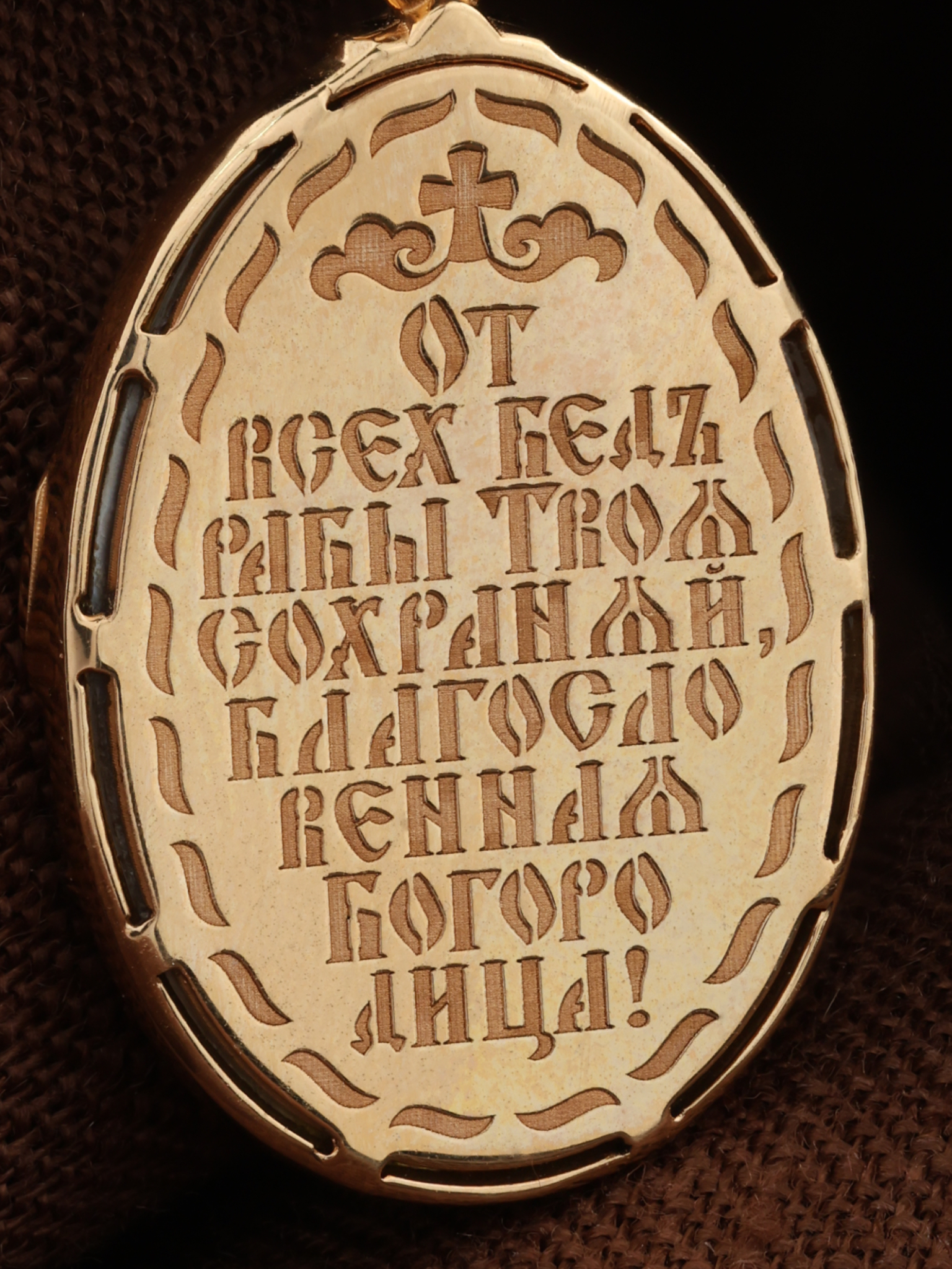 На оборотной стороне образка написана молитва: «От всех бед рабы Твоя сохраняй, Благословенная Богородица!»