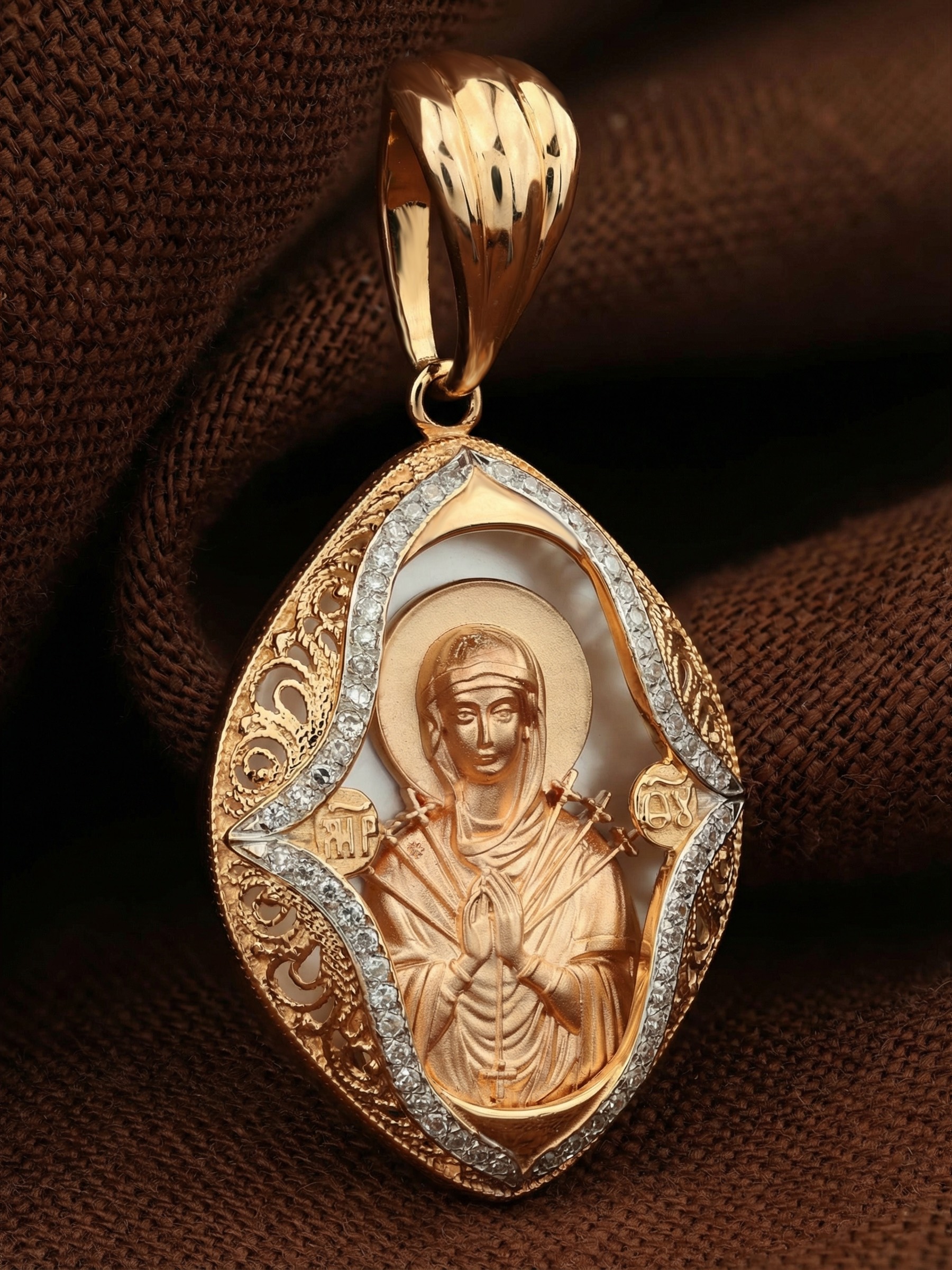 На лицевой стороне образка изображена икона Пресвятой Богородицы «Семистрельная» — одна из самых чудотворных икон на Руси. На протяжении многих веков христиане взывали к Царице Небесной через эту икону, если в стране начинались войны или мятежи. Пресвятая Богородица символически изображена пронзенной семью стрелами. Это образ скорби Матери, увидевшей страдания Своего Сына. Подобно тому, как Тело Христа пронзили гвоздями и копием, так и душу Пречистой Его Матери поразило «оружие» печали и сердечной боли. По учению Православной Церкви Господь был распят за грехи людей, и каждый день вновь распинается на Литургии за новые грехи ныне живущих. Поэтому семь стрел символически означают также семь смертных грехов человеческих, приносящих Богородице новые скорби.
