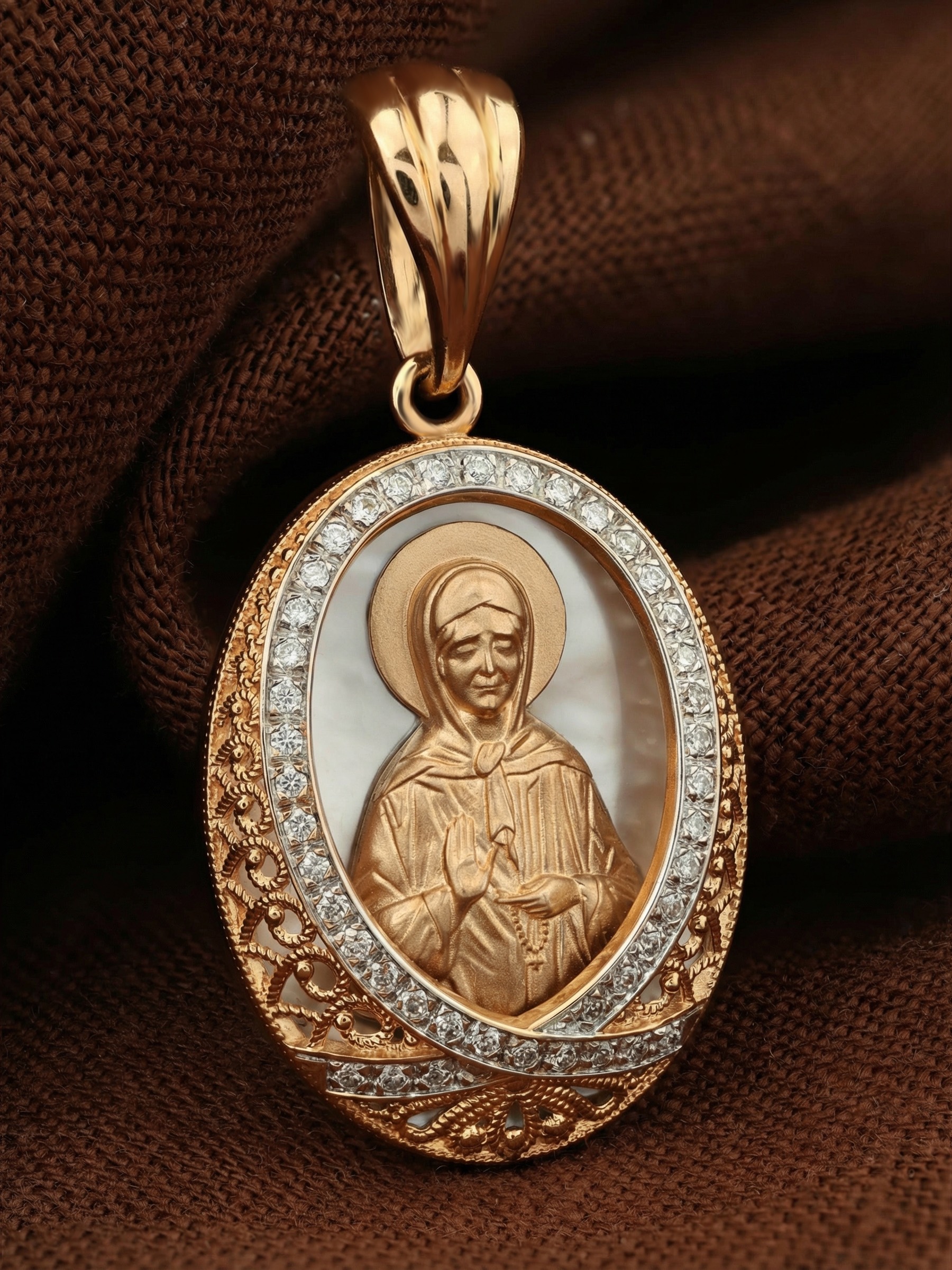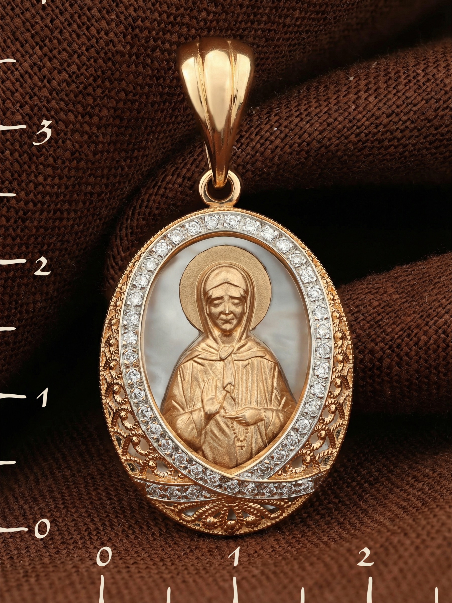 На лицевой стороне образка изображена Святая Матрона Московская. Родилась блаженная Матрона в 1881 г. в бедной, но благочестивой крестьянской семье. Кроме Матроны в семье уже было трое детей: двое братьев и сестра. Мать Матроны хотела отдать будущего ребенка в приют, но увидев вещий сон, отказалась от этой мысли. Дочь родилась слепой, но мать любила свое «дитя-несчастное». Уже с восьми лет Матрона имела глубокую веру, способность исцелять больных и предсказывать будущее. Она чувствовала приближение опасности, предвидела стихийные и общественные бедствия. По ее молитве люди получали исцеление от болезней и утешение в скорбях. В возрасте около 17 лет у неё отнялись ноги. Сама Матрона знала, что так должно было случиться, и приняла это как волю Божию. Блаженная Матрона Московская является одной из самых известных и почитаемых в России святых. Считается, что по молитвам святой Матроны происходит огромное количество чудес и исцелений. Поклониться святой Матроне приезжают паломники из других стран. Патриарх Московский и всея Руси Кирилл призывал всех обращаться к святой Матроне не только за помощью в решении жизненных проблем, но и даровании сил несения страданий.