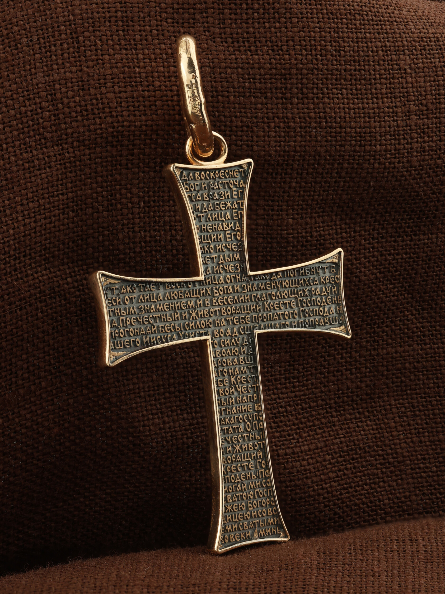 На оборотной стороне креста размещена молитва Честному и Животворящему Кресту Господню: «Да воскреснет Бог, и расточатся врази Его, и да бежат от лица Его ненавидящии Его. Яко исчезает дым, да исчезнут; яко тает воск от лица огня, тако да погибнут беси от лица любящих Бога и знаменующихся крестным знамением, и в веселии глаголющих: радуйся, Пречестный и Животворящий Кресте Господень, прогоняяй бесы силою на тебе пропятаго Господа нашего Иисуса Христа, во ад сшедшаго и поправшаго силу диаволю, и даровавшаго нам тебе Крест Свой Честный на прогнание всякаго супостата. О, Пречестный и Животворящий Кресте Господень! Помогай ми со Святою Госпожею Девою Богородицею и со всеми святыми во веки. Аминь».