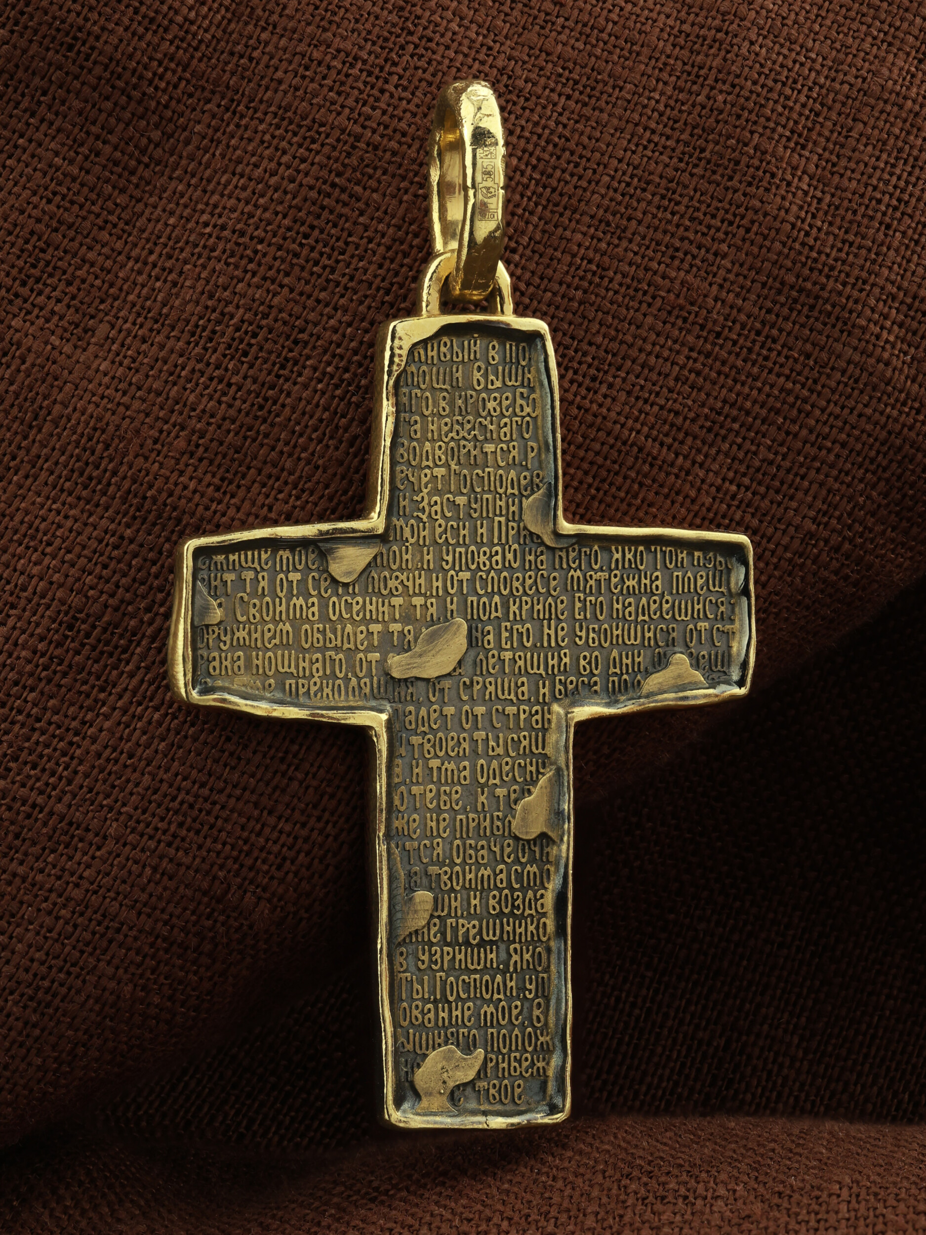 На оборотной стороне креста размещена часть 90 псалма царя Давида: «Живый в помощи Вышняго, в крове Бога Небеснаго водворится. Речет Господеви: Заступник мой еси и Прибежище мое, Бог мой, и уповаю на Него. Яко Той избавит тя от сети ловчи, и от словесе мятежна, плещма Своима осенит тя, и под криле Его надеешися: оружием обыдет тя истина Его. Не убоишися от страха нощнаго, от стрелы летящия во дни, от вещи во тме преходящия, от сряща, и беса полуденнаго. Падет от страны твоея тысяща, и тма одесную тебе, к тебе же не приближится, обаче очима твоима смотриши, и воздаяние грешников узриши. Яко Ты, Господи, упование мое, Вышняго положил еси прибежище твое. Не приидет к тебе зло, и рана не приближится телеси твоему, яко Ангелом Своим заповесть о тебе, сохранити тя во всех путех твоих. На руках возмут тя, да не когда преткнеши о камень ногу твою, на аспида и василиска наступиши, и попереши льва и змия. Яко на Мя упова, и избавлю и: покрыю и, яко позна имя Мое. Воззовет ко Мне, и услышу его: с ним есмь в скорби, изму его, и прославлю его, долготою дней исполню его, и явлю ему спасение Мое.»
