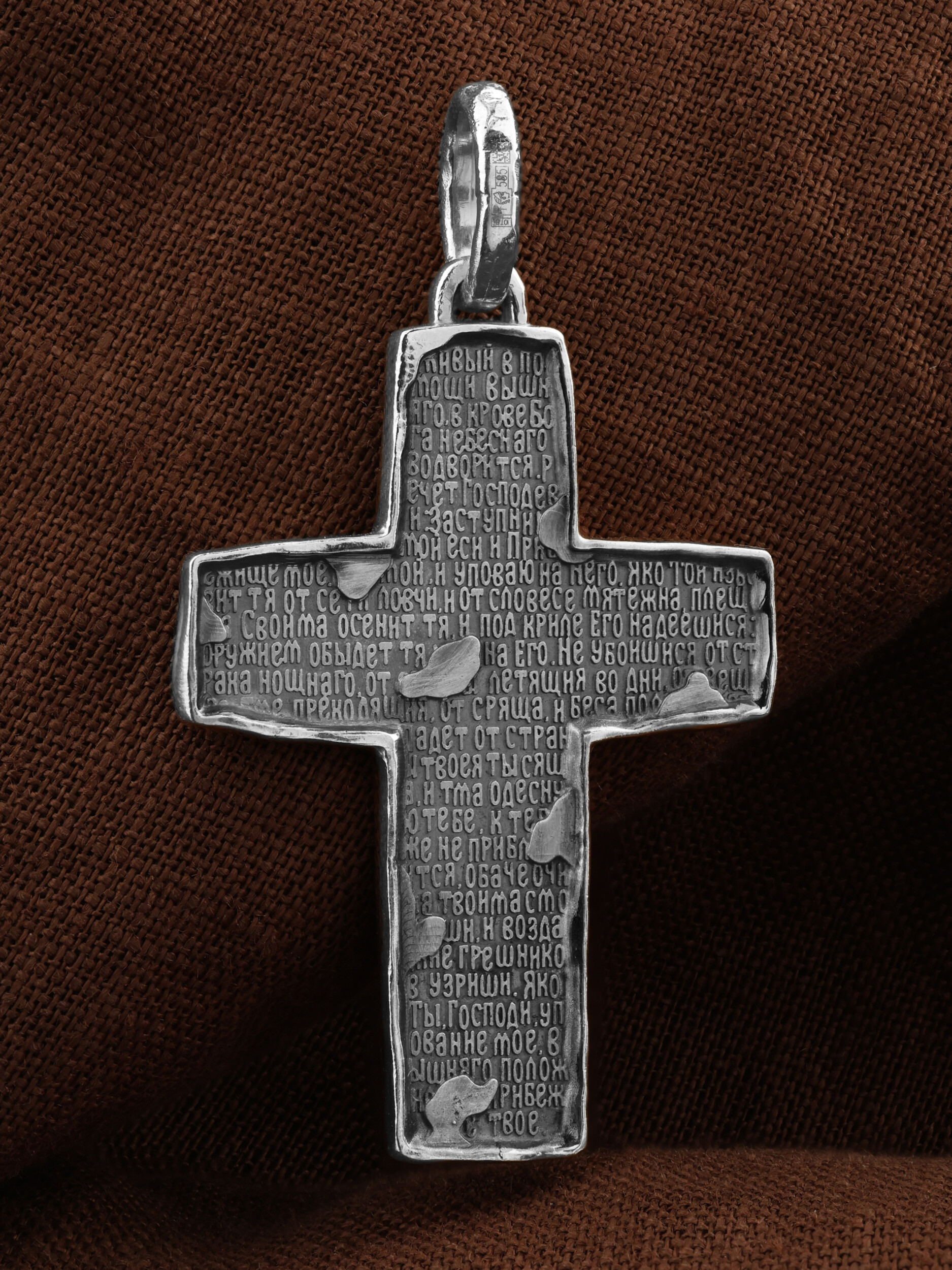 На оборотной стороне креста размещена часть 90 псалма царя Давида: «Живый в помощи Вышняго, в крове Бога Небеснаго водворится. Речет Господеви: Заступник мой еси и Прибежище мое, Бог мой, и уповаю на Него. Яко Той избавит тя от сети ловчи, и от словесе мятежна, плещма Своима осенит тя, и под криле Его надеешися: оружием обыдет тя истина Его. Не убоишися от страха нощнаго, от стрелы летящия во дни, от вещи во тме преходящия, от сряща, и беса полуденнаго. Падет от страны твоея тысяща, и тма одесную тебе, к тебе же не приближится, обаче очима твоима смотриши, и воздаяние грешников узриши. Яко Ты, Господи, упование мое, Вышняго положил еси прибежище твое. Не приидет к тебе зло, и рана не приближится телеси твоему, яко Ангелом Своим заповесть о тебе, сохранити тя во всех путех твоих. На руках возмут тя, да не когда преткнеши о камень ногу твою, на аспида и василиска наступиши, и попереши льва и змия. Яко на Мя упова, и избавлю и: покрыю и, яко позна имя Мое. Воззовет ко Мне, и услышу его: с ним есмь в скорби, изму его, и прославлю его, долготою дней исполню его, и явлю ему спасение Мое.»