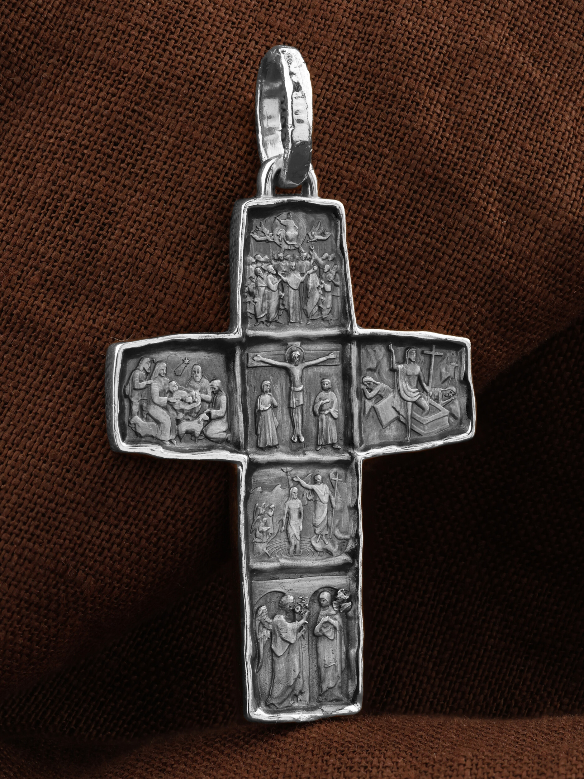 На лицевой стороне креста изображены основные события земной жизни, Крестные Страдания, Воскресение и Вознесение Господа и Спасителя нашего Иисуса Христа. Крест — символ спасения и искупления рода человеческого, знамение победы над смертью и адом. Иисус Христос, как искупительная жертва освобождения человечества от власти греха, умер крестной смертью и в третий день воскрес. В центре креста изображено Распятие Иисуса Христа на Кресте. Ниже Распятия размещено изображение Благовещения Пресвятой Богородицы, а так же Крещение Господне. Слева от Распятия изображено Рождество Господне, справа отображен образ Воскресшего из гроба Господа и Спасителя нашего Иисуса Христа. Над Распятием изображено Вознесение Господне.