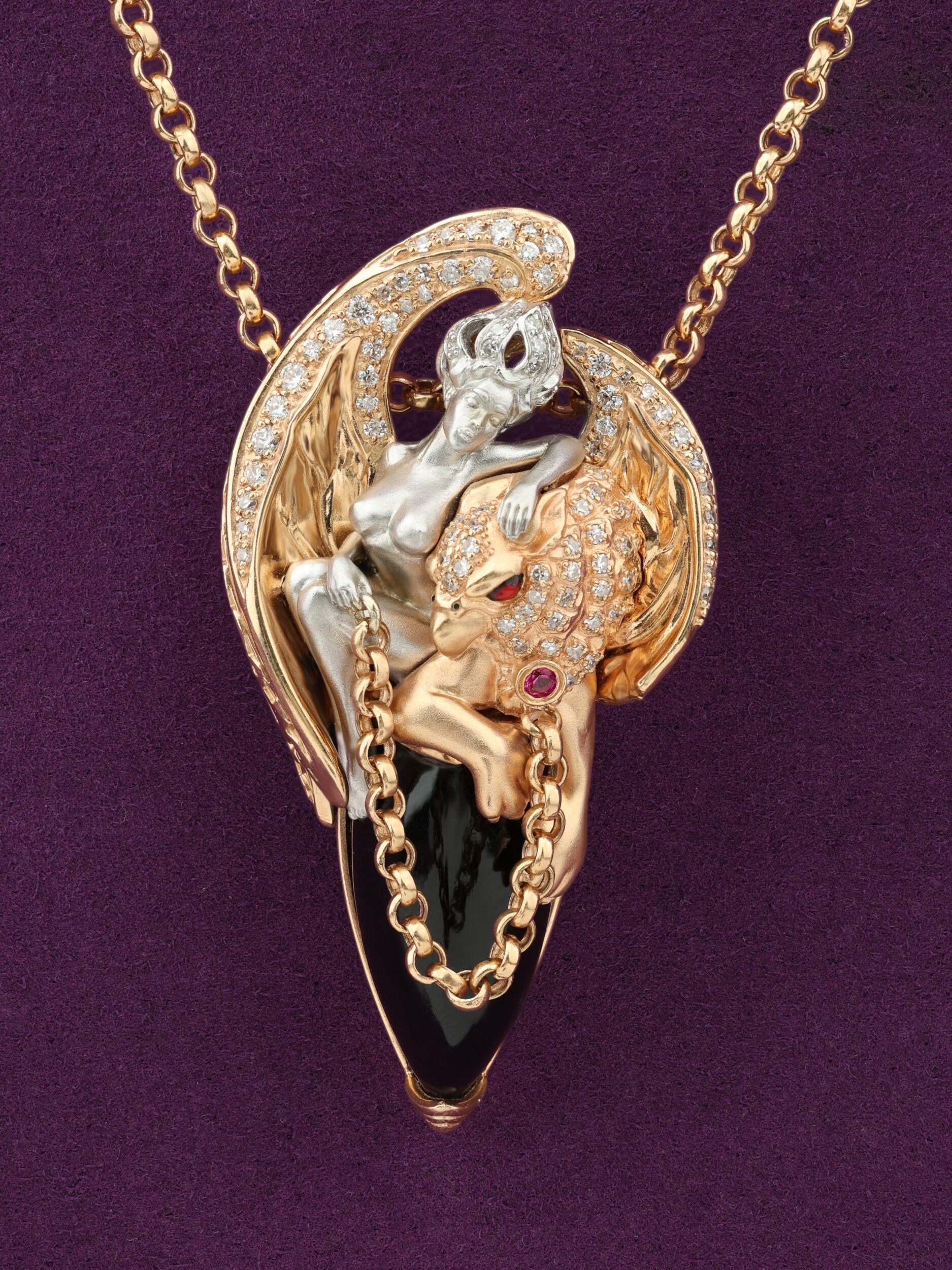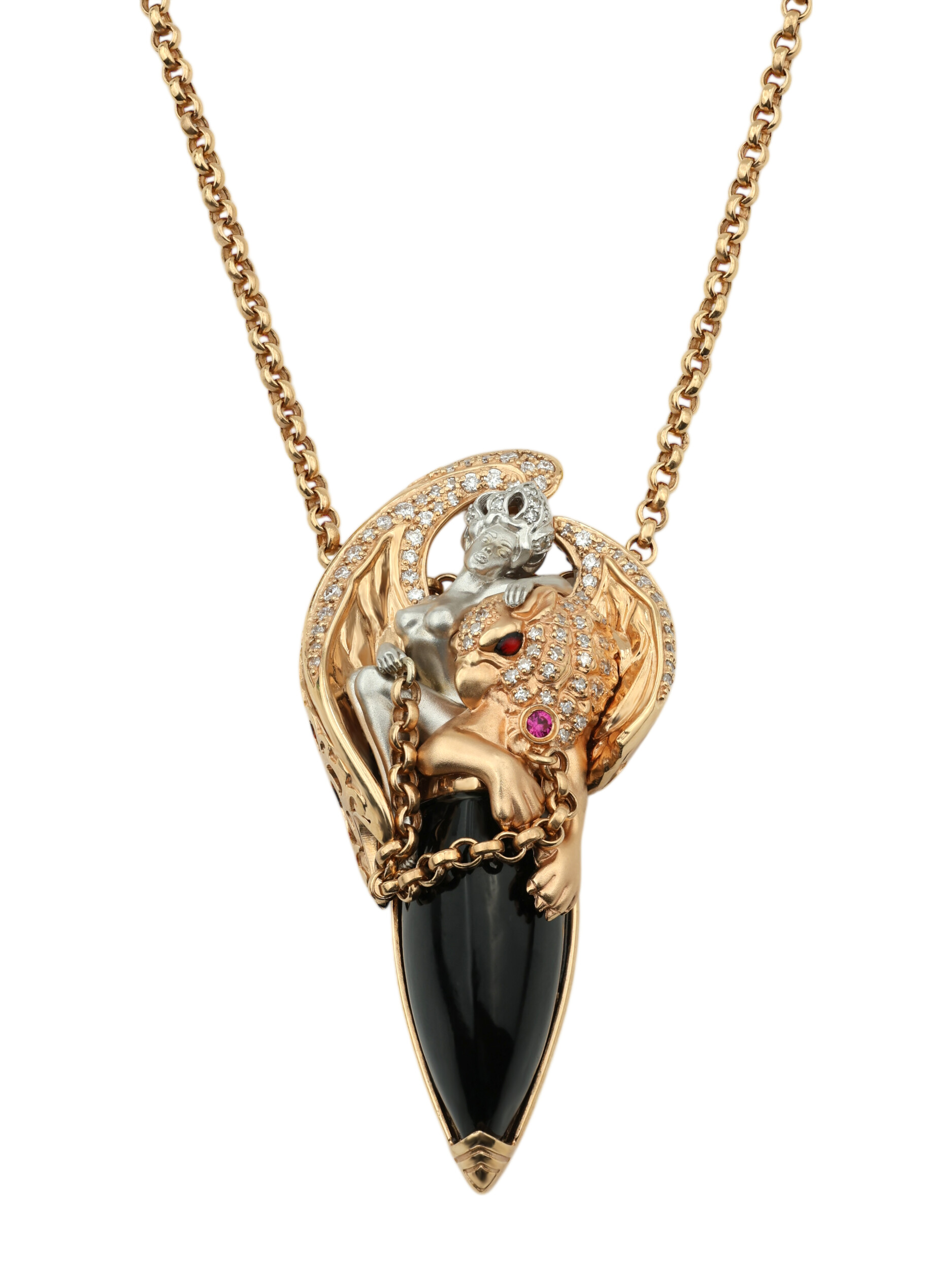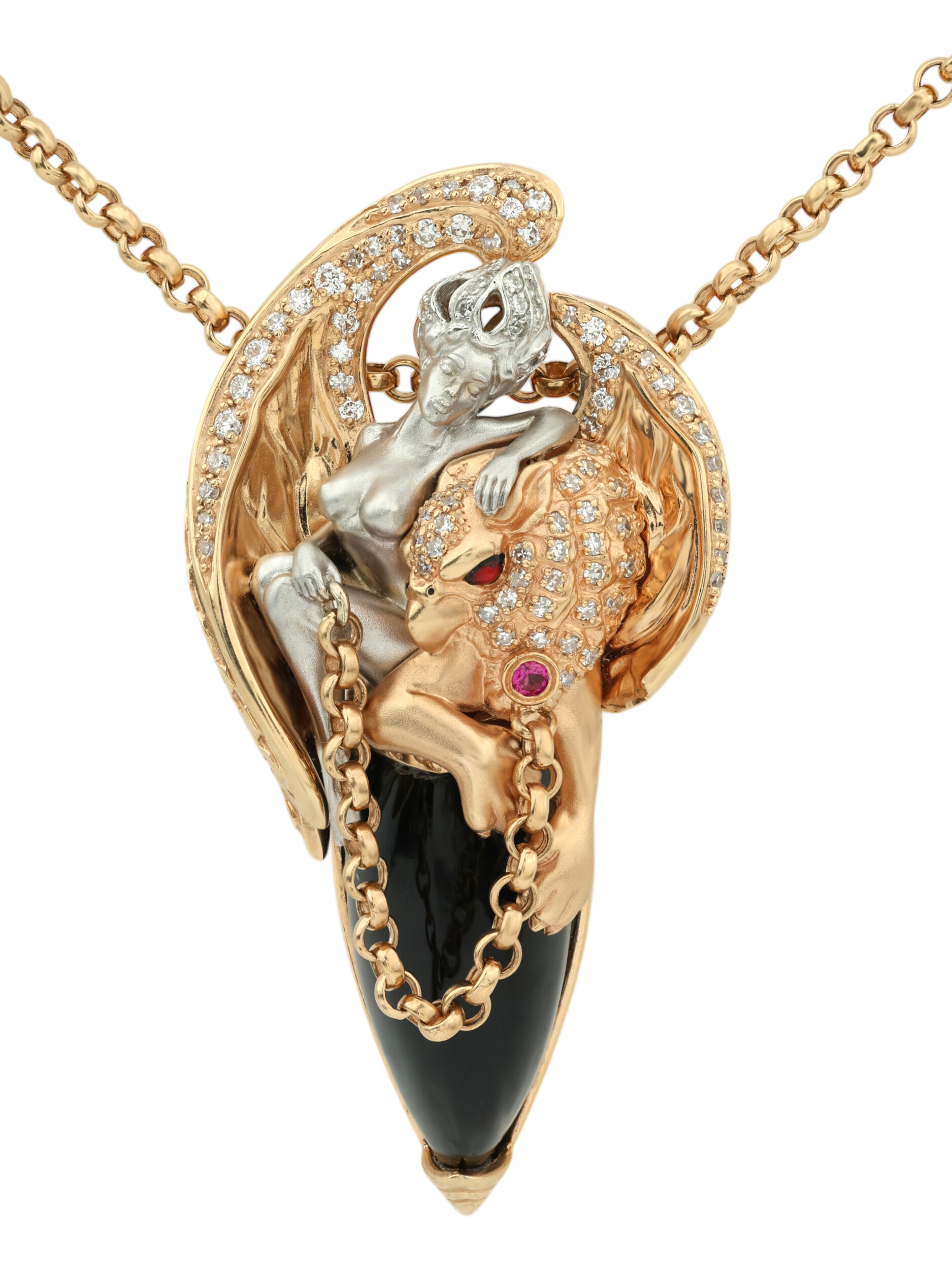 Колье из золота c эмалью, бриллиантами, рубином и ониксом