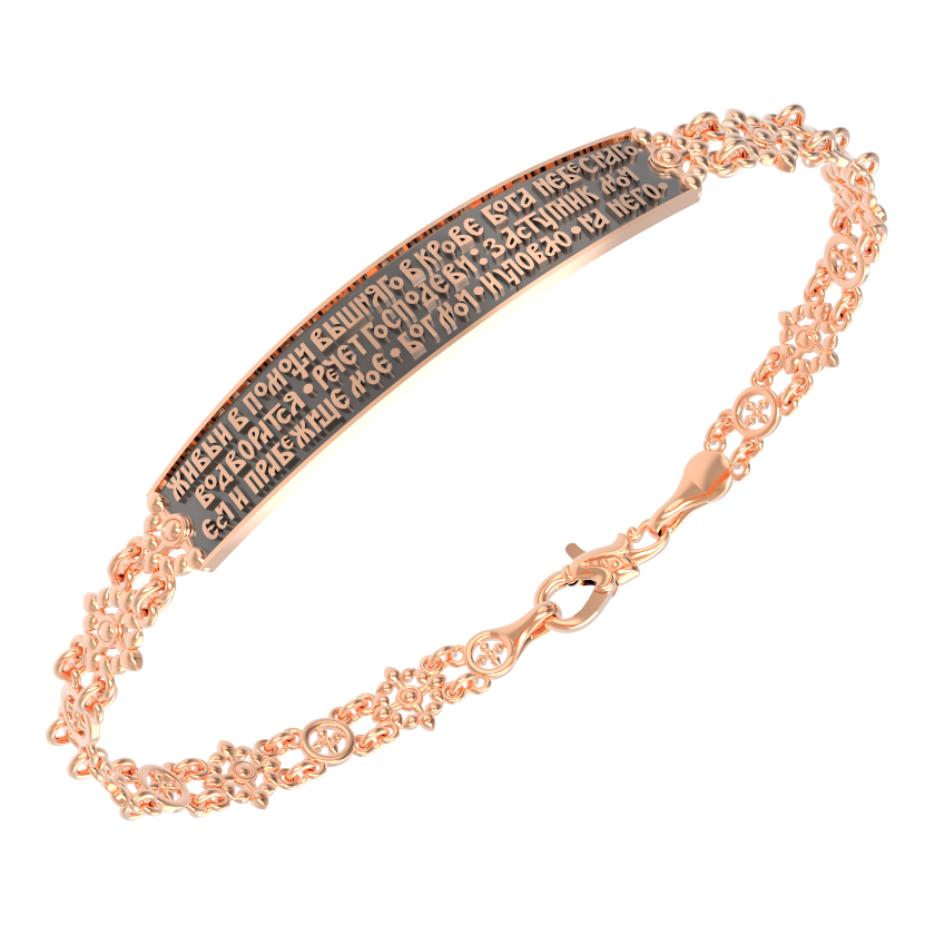 На основном звене браслета написана молитва: «Живый в помощи Вышняго, в крове Бога Небеснаго водворится. Речет Господеви: Заступник мой еси и Прибежище мое, Бог мой, и уповаю на Него.»