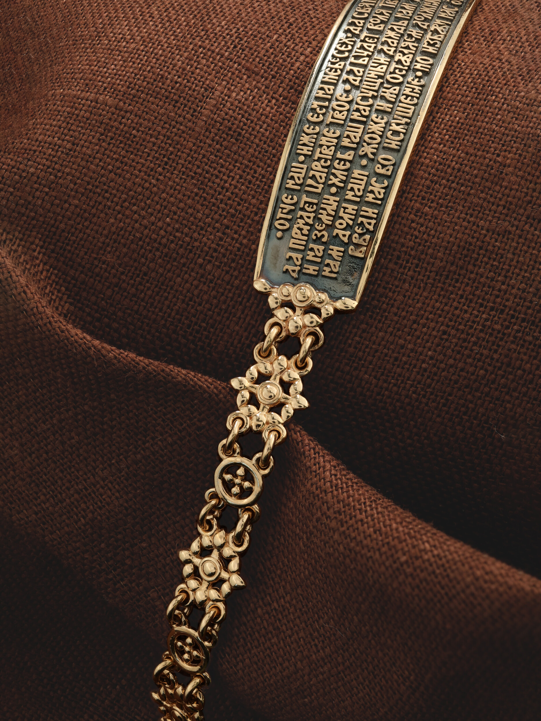 На основном звене написана молитва: «Отче наш, Иже еси на небесех! Да святится имя Твое, да приидет Царствие Твое, да будет воля Твоя, яко на небеси и на земли. Хлеб наш насущный даждь нам днесь; и остави нам долги наша, якоже и мы оставляем должником нашим; и не введи нас во искушение, но избави нас от лукаваго».