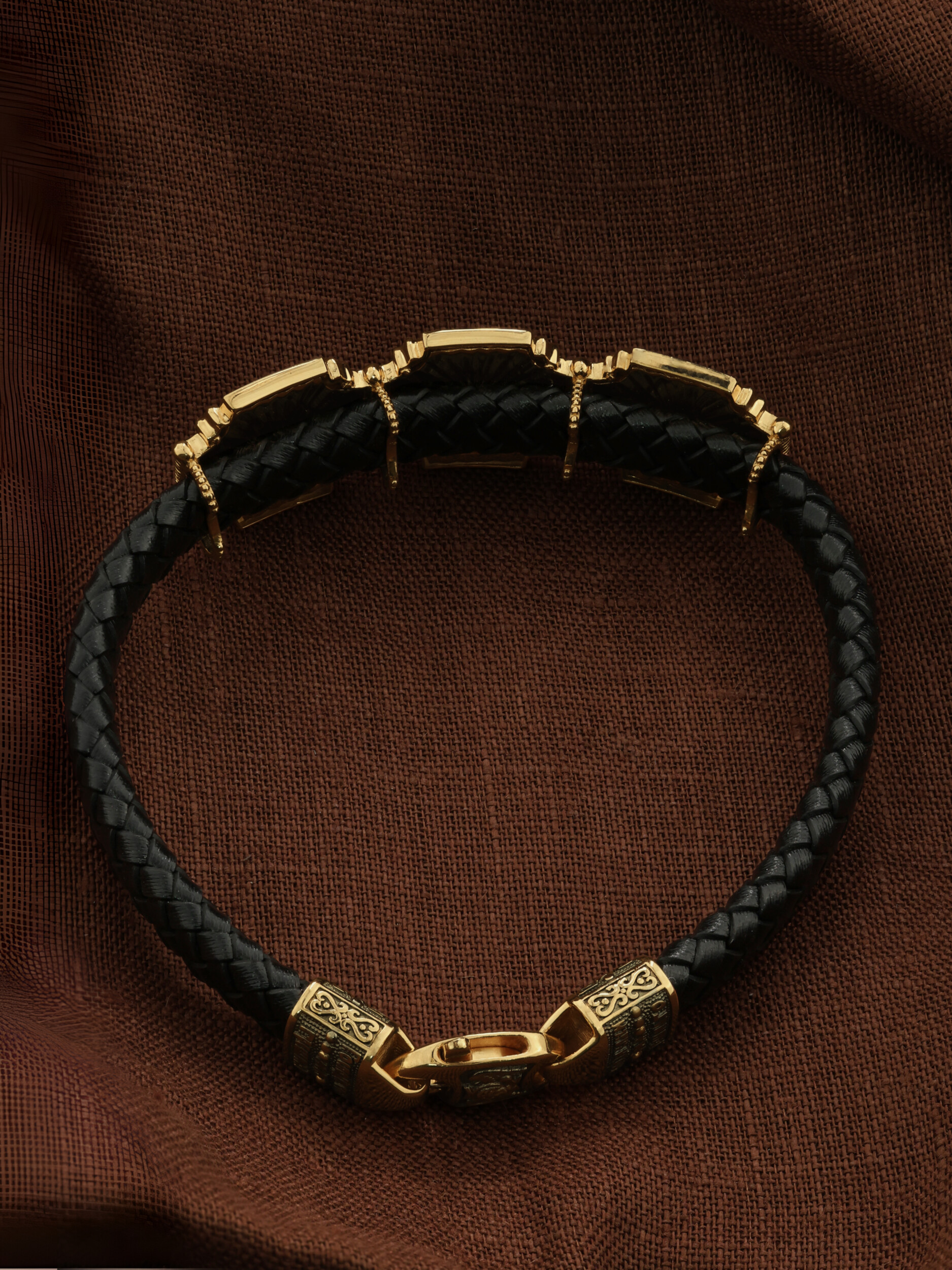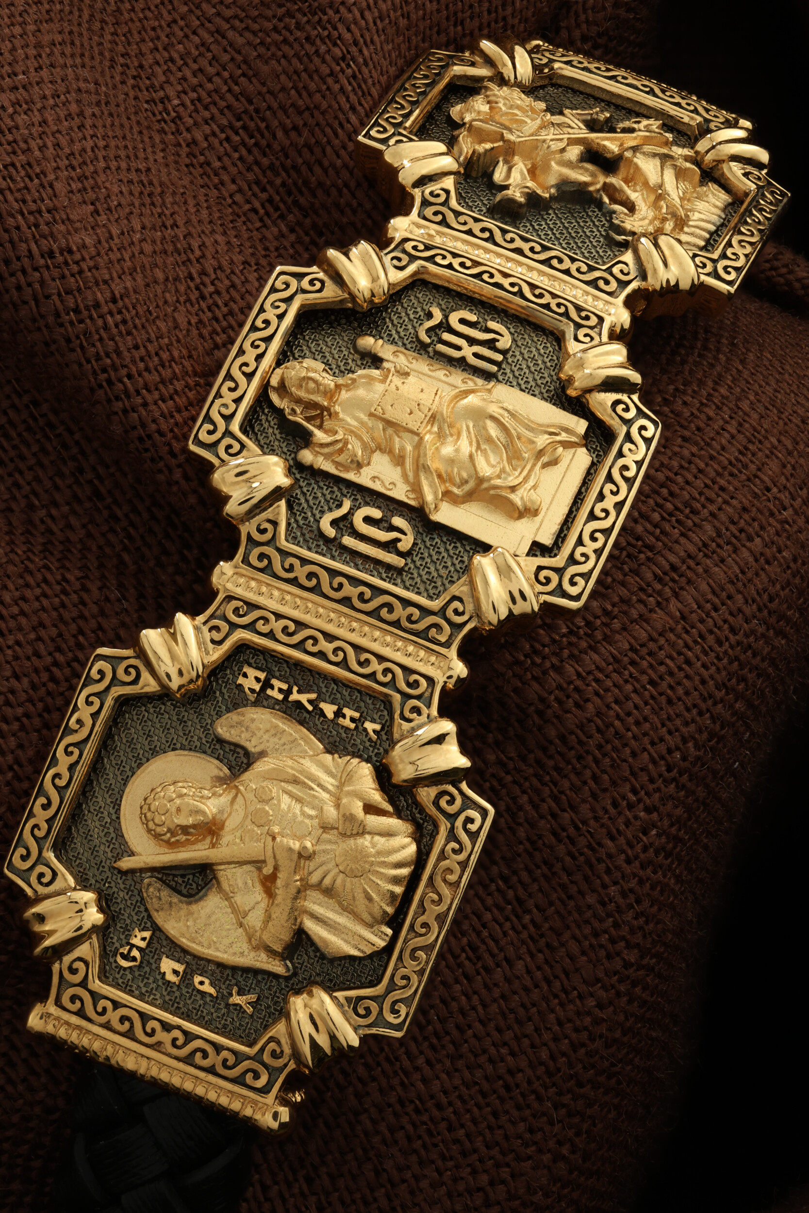 Композиционным центром браслета является Иисус Христос в образе Вседержителя, по-гречески «Пантократор». Это древнейший образ Спасителя, на котором Он представлен как властелин и правитель мира. Христос держит в руках Книгу, которая символизирует Книгу Бытия, то есть весь сотворенный Богом мир. В этой Книге судьбы всех людей, живущих на земле. Слева от образа Вседержителя — икона Архангела Михаила — Архистратига всех Небесных Воинств. Он ведет непримиримую войну против сил зла, охраняет райские врата и защищает души людей. Его имя означает «Кто яко Бог?», так как он самый могучий и грозный враг зла. Он первым ополчился на Денницу, когда тот восстал против Бога, низверг его с Неба и не перестает сражаться с его темным воинством. Поэтому он часто изображается в виде воина, в доспехах и с огненным мечом. Справа от образа Вседержителя — Великомученик Георгий Победоносец. Образ Великомученика считают одним из наиболее чтимых святынь в Святыни Православных, он олицетворяет собой заступника для верующих, чья жизнь имеет какое-либо отношение к военным делам, также он может оберегать и землевладельцев. Одно из самых великих чудес которое сотворил Великомученик так это — спасения всего города от устрашающего змия. Молитвами и своей непреклонной верой, взываемой к Всевышнему, он смог одолеть чудовище. Святой убил змея, спас жителей и их души от влияния дьявола, породив в них надежду и веру в Господа, призывая людей принять христианскую веру. Поскольку при жизни Святой Георгий был военным, он считается покровителем всех, кто имеет отношение к армии — военнослужащим, участникам боевых действий. Молитва перед иконой Георгия Победоносца поможет защититься от врагов, одержать победу в сражении (военном, спортивном, духовной брани с дьяволом), содействие в установлении мир