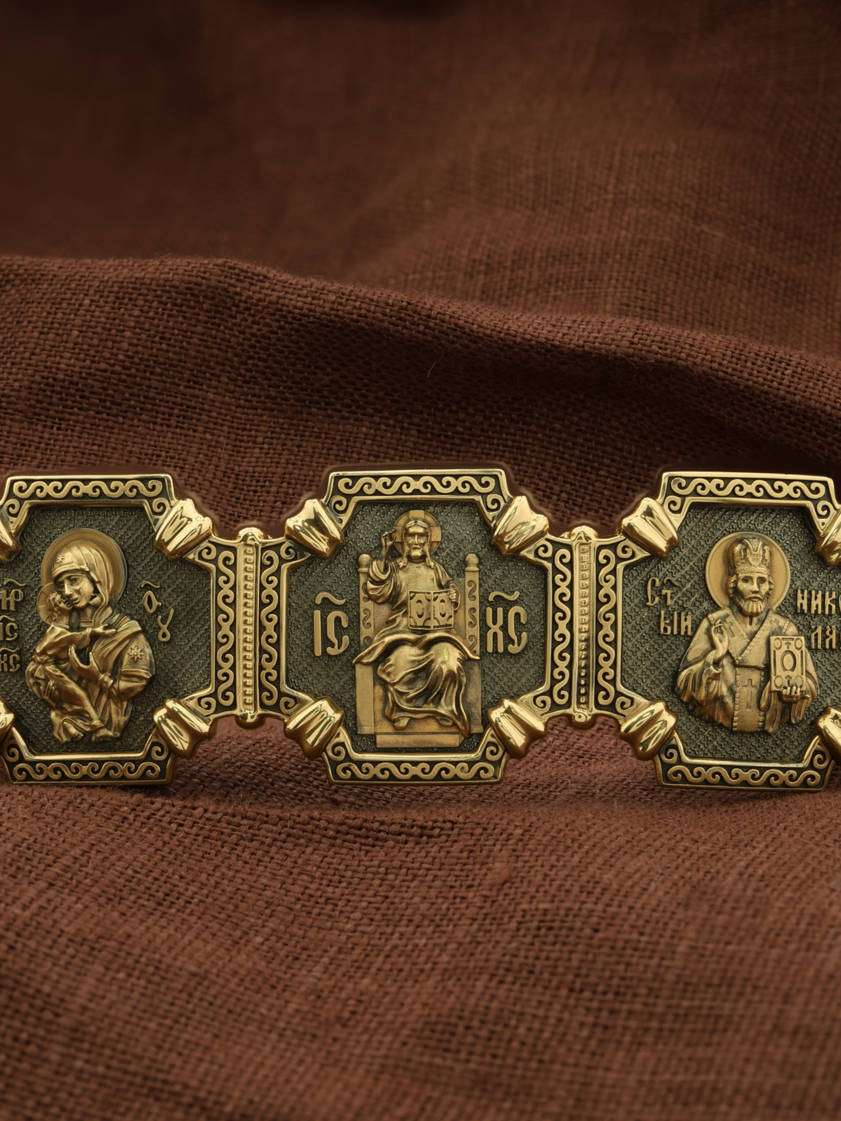 Композиционным центром браслета является Иисус Христос в образе Вседержителя. Это древнейший образ Спасителя, на котором Он представлен как властелин и правитель мира. Христос держит в руках Книгу, которая символизирует Книгу Бытия. В этой Книге судьбы всех людей, живущих на земле. Слева от образа Вседержителя — Владимирская икона Божией Матери. По преданию, была написана на доске трапезного стола из дома Иисуса Христа. На Русь Владимирская икона Божией Матери была привезена в начале XII века и с тех пор почитается как главная святыня нашего Отечества. Перед ней молитвенно просят Богородицу об исцелении от телесных недугов, в частности, заболеваний сердца и сердечнососудистой системы. За помощью к ней обращаются во время бедствий, когда нуждаются в защите от врагов. Справа от образа Вседержителя изображена икона Святого Николая Чудотворца. Живший в III веке епископ Ликийского города Миры — самый почитаемый святой не только в России, но и во всем мире. Николай Чудотворец — помощник в делах, защитник путешествующих, покровитель учащихся, утешитель обиженных и нуждающихся, целитель самых страшных и тяжелых недугов, представитель и молитвенник за людей перед Богом.