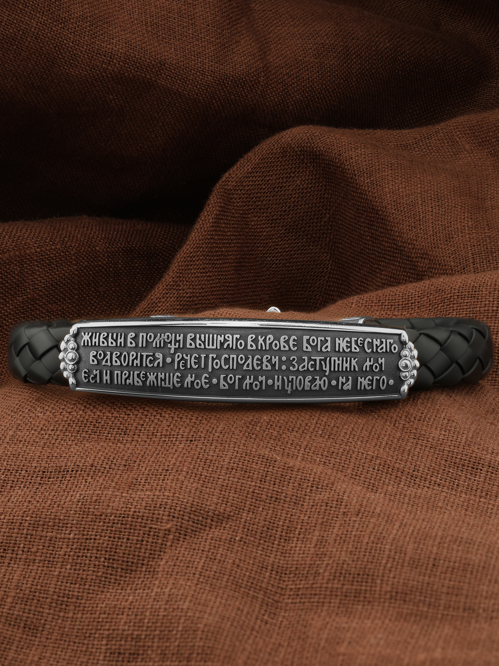 На основном звене браслета написана молитва: «Живый в помощи Вышняго, в крове Бога Небеснаго водворится. Речет Господеви: Заступник мой еси и Прибежище мое, Бог мой, и уповаю на Него.»