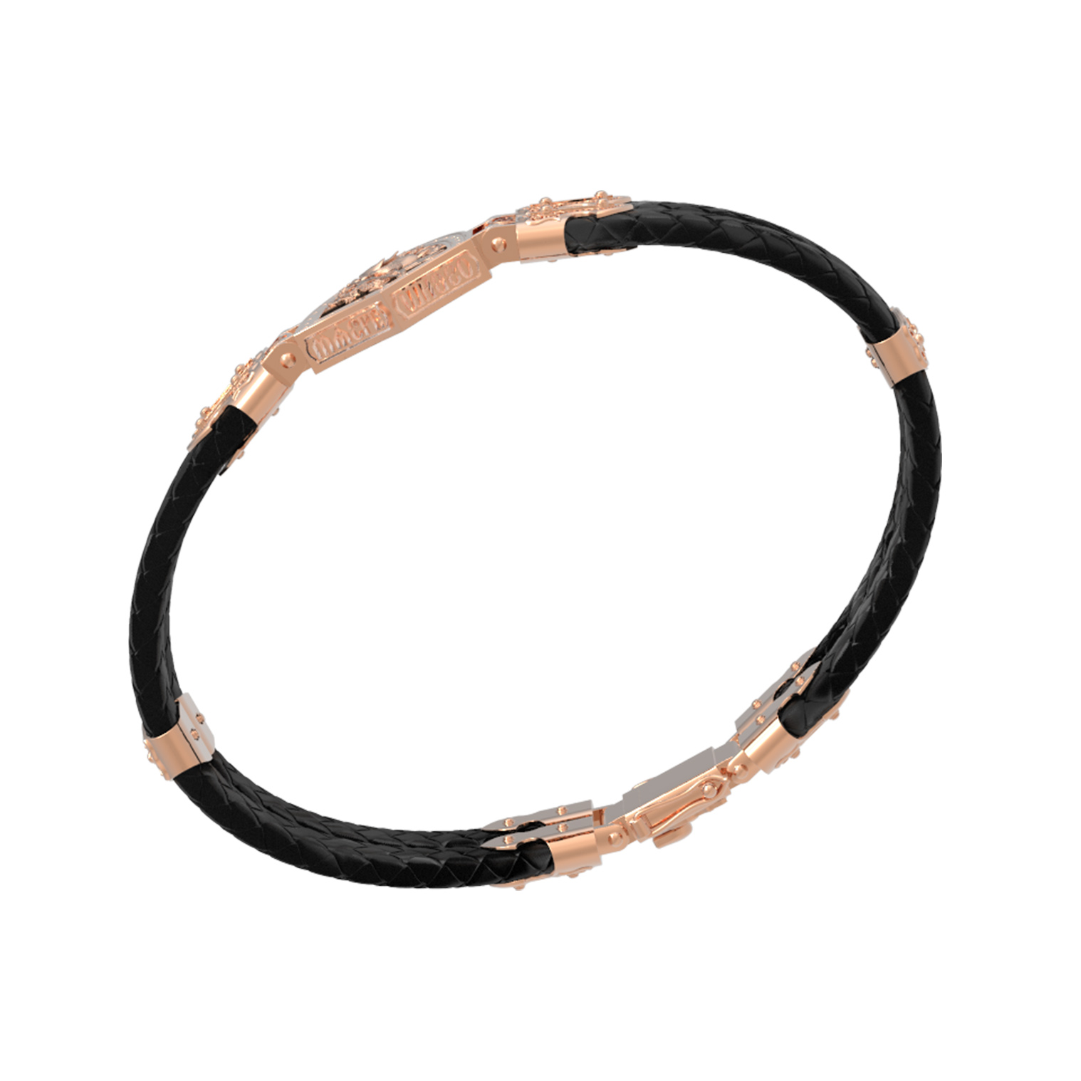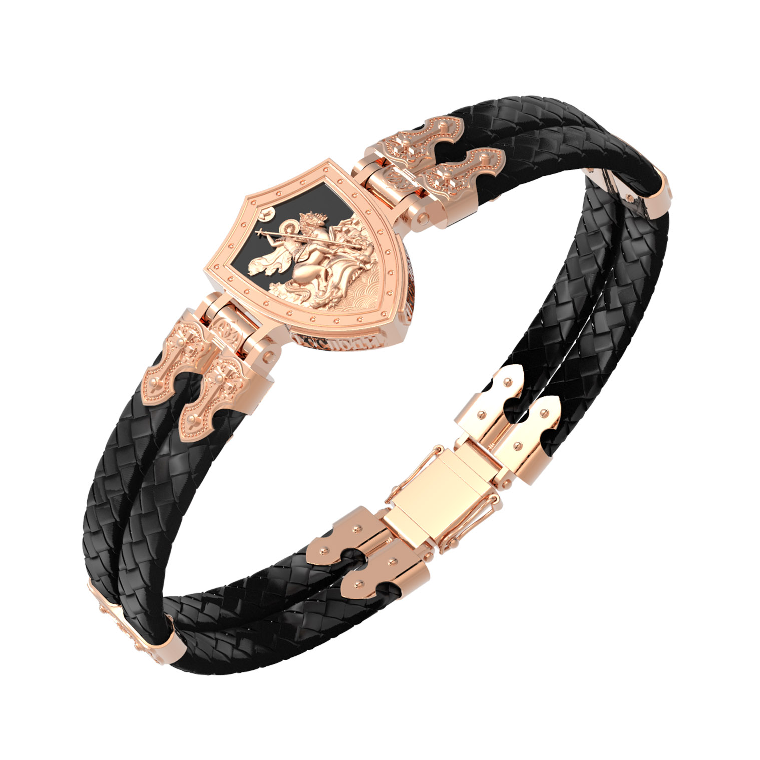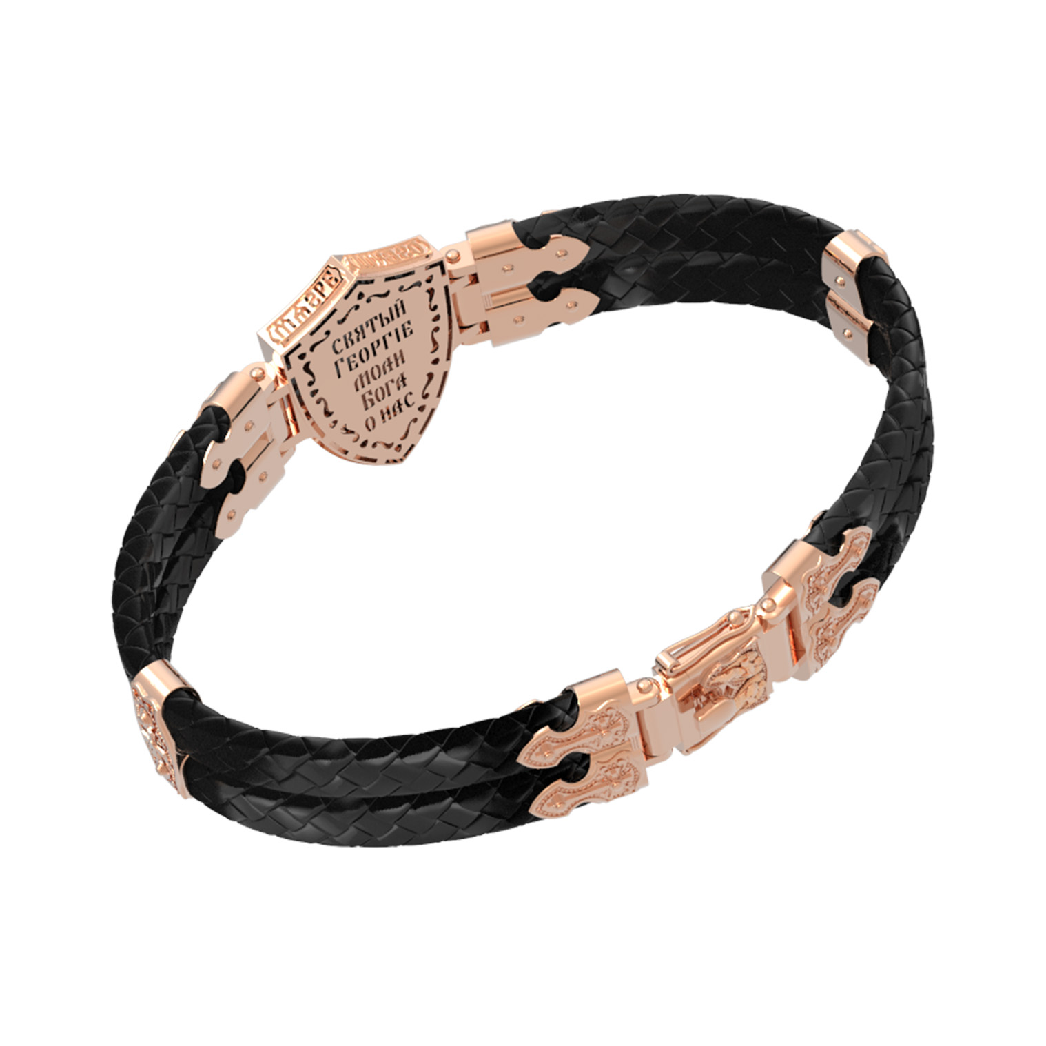 Основой композиции лицевой стороны браслета является изображение Святого Великомученика Георгия Победоносца — одного из самых почитаемых и удивительных святых. Георгий родился в Каппадокии (Малая Азия) в семье богатых и знатных горожан. Юношей поступил на службу к римскому императору Диоклетиану, за отличное знание военного дела и проявленную в боях и походах храбрость был приближен к императору и удостоен высокого воинского звания. Во время начавшихся гонений на христиан, перешел на сторону гонимых и, отвергнув человеческий страх, стал ярым проповедником учения Христа. Мучители подвергли опального воеводу жесточайшим восьмидневным пыткам и казнили его (обезглавили) в возрасте около тридцати лет в 303 году. На Руси он известен как Юрий или Егорий, заступник для верующих, чья жизнь имеет какое-либо отношение к военным делам, помощник в крестьянском труде. Браслет сделан в виде воинского щита. На нем Георгий изображен как воитель, сидящий на вздыбленном коне и поражающий копьем огнедышащего змея. Над образом изображена благословляющая Божия десница. Змей символизирует собою сатанинские силы. Молитвами вознесенными к Всевышнему и своей непреклонной верой он смог одолеть чудовище. Святой убил змея, спас царскую дочь, принесенную в жертву, и жителей города, их души от влияния дьявола, породив в них надежду и веру в Господа, призывая людей принять христианскую веру. На торце изделия помещена молитва: «Господи, помилуй мя грешного».