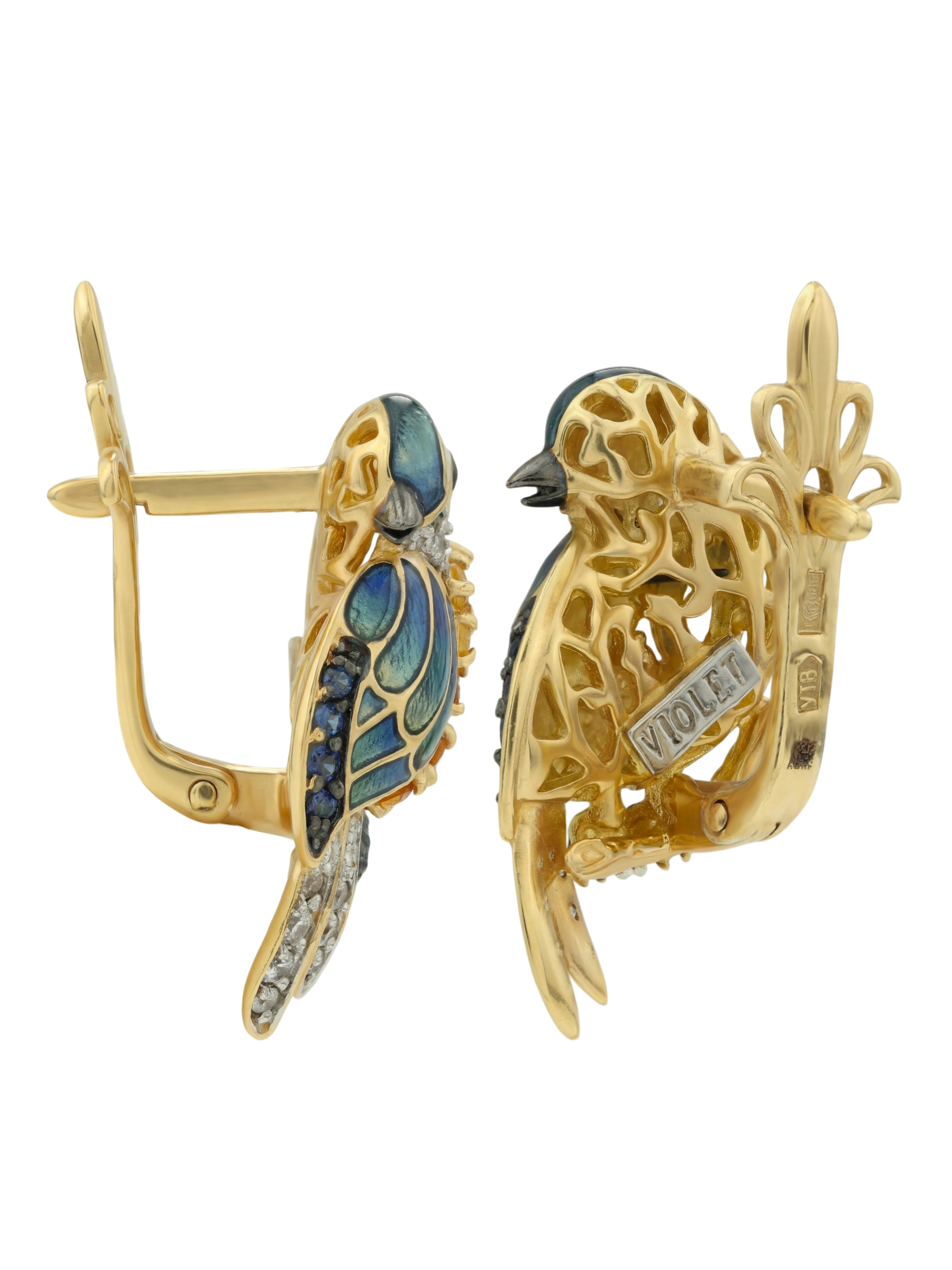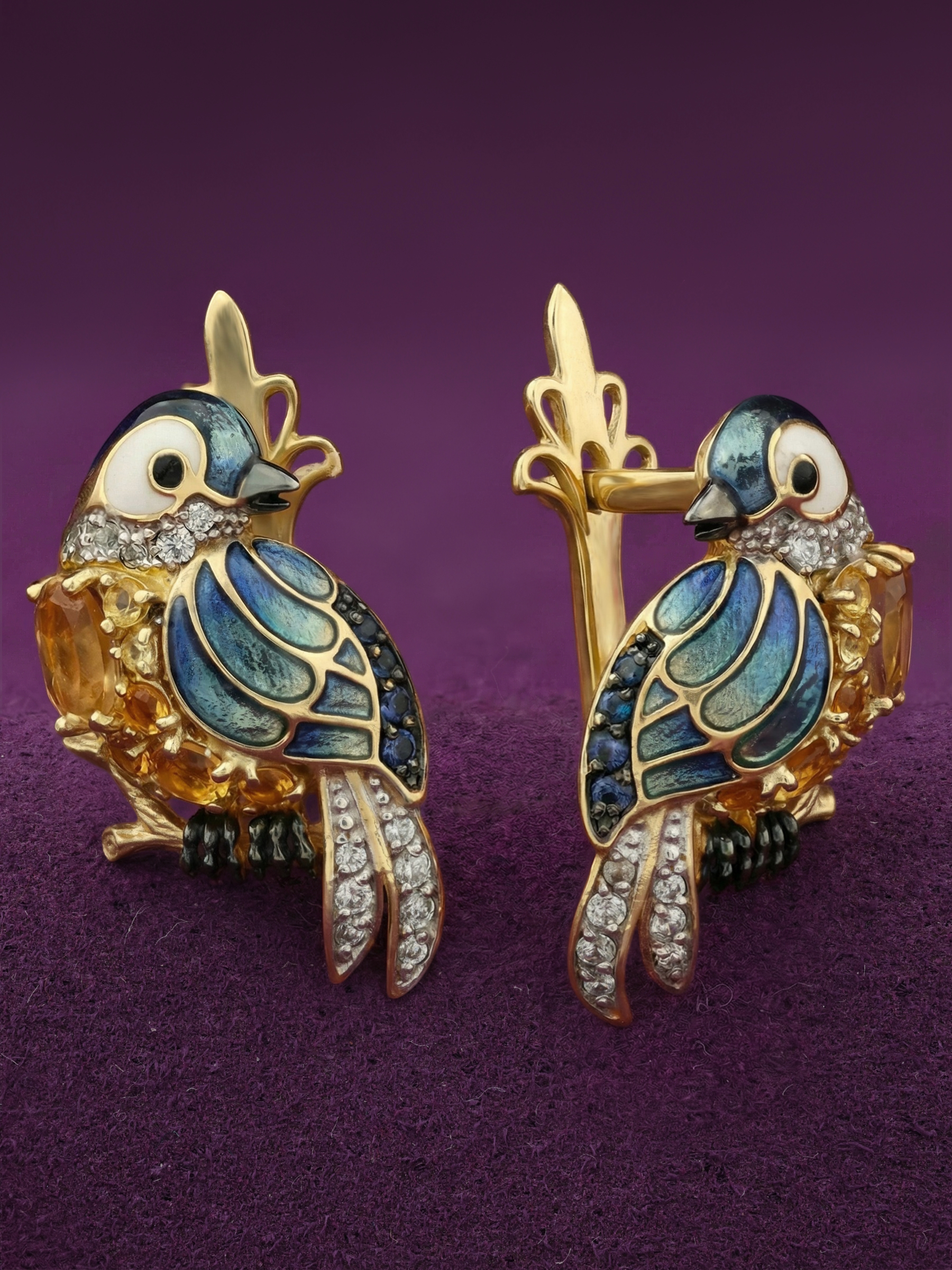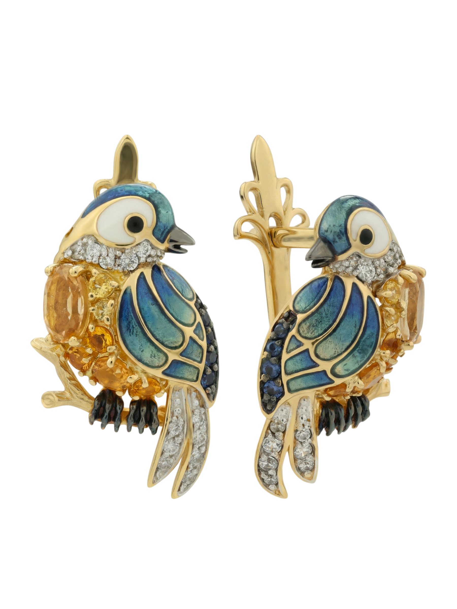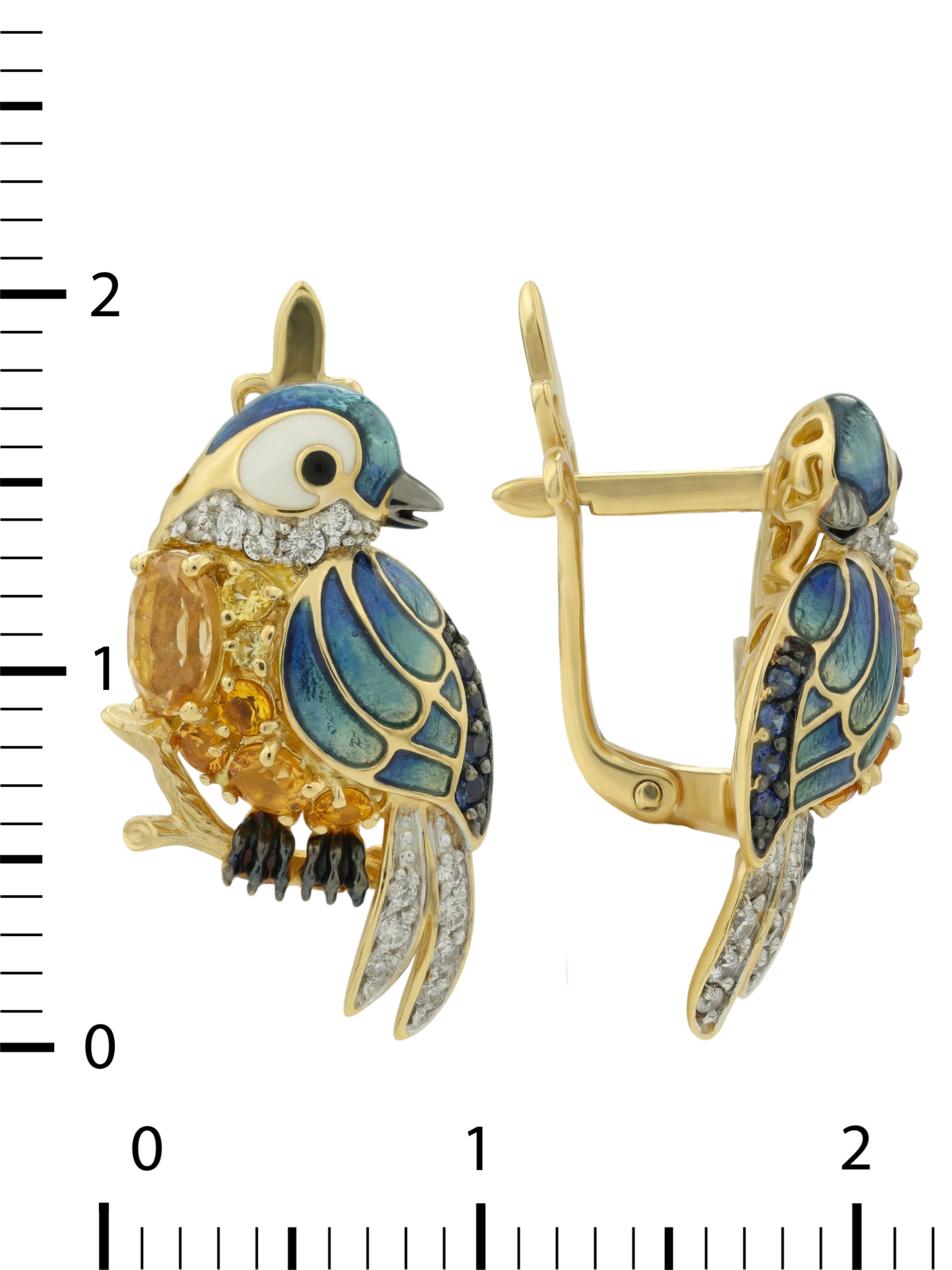 Серьги из лимонного золота c эмаль , фианитом, цитрином и сапфиром