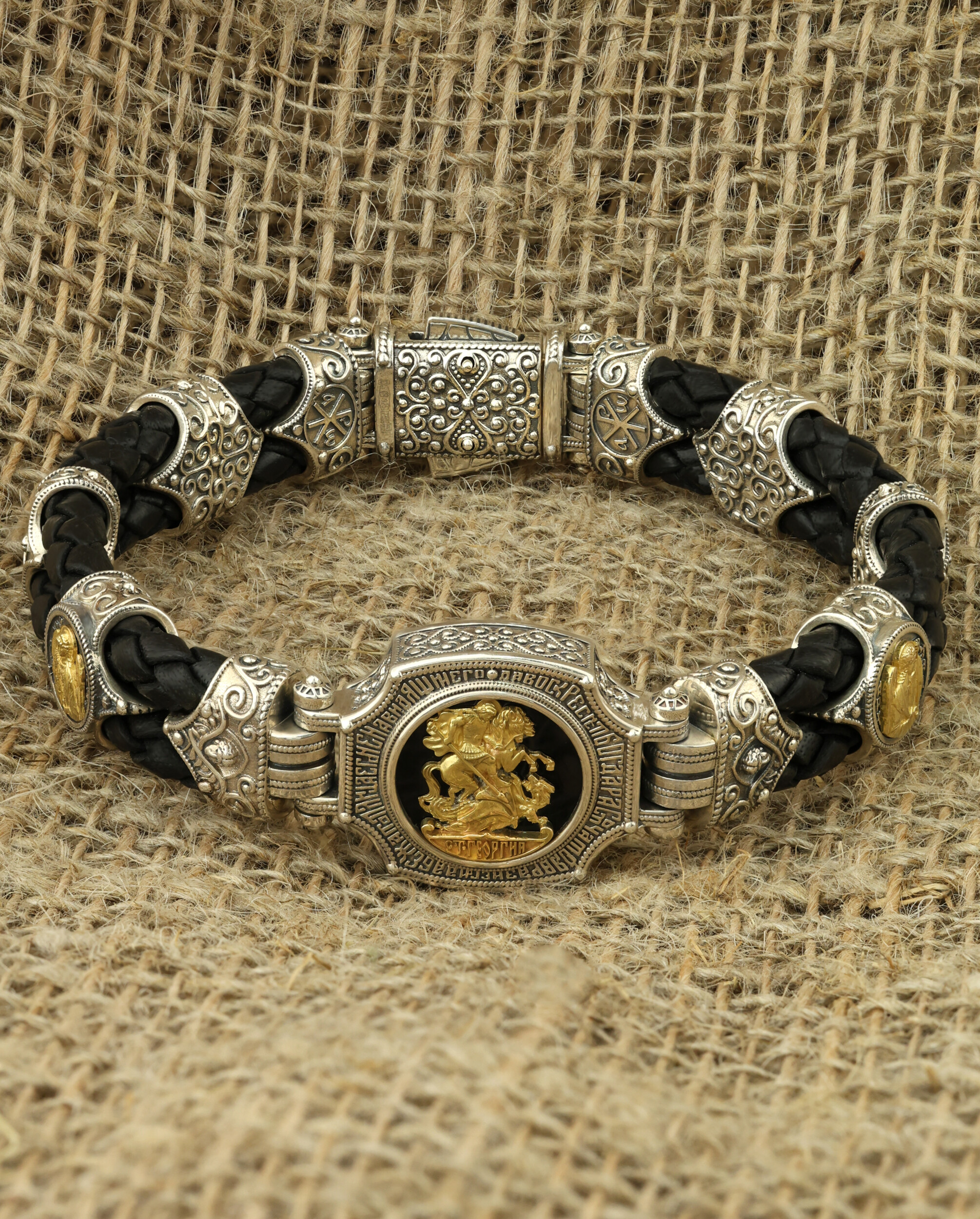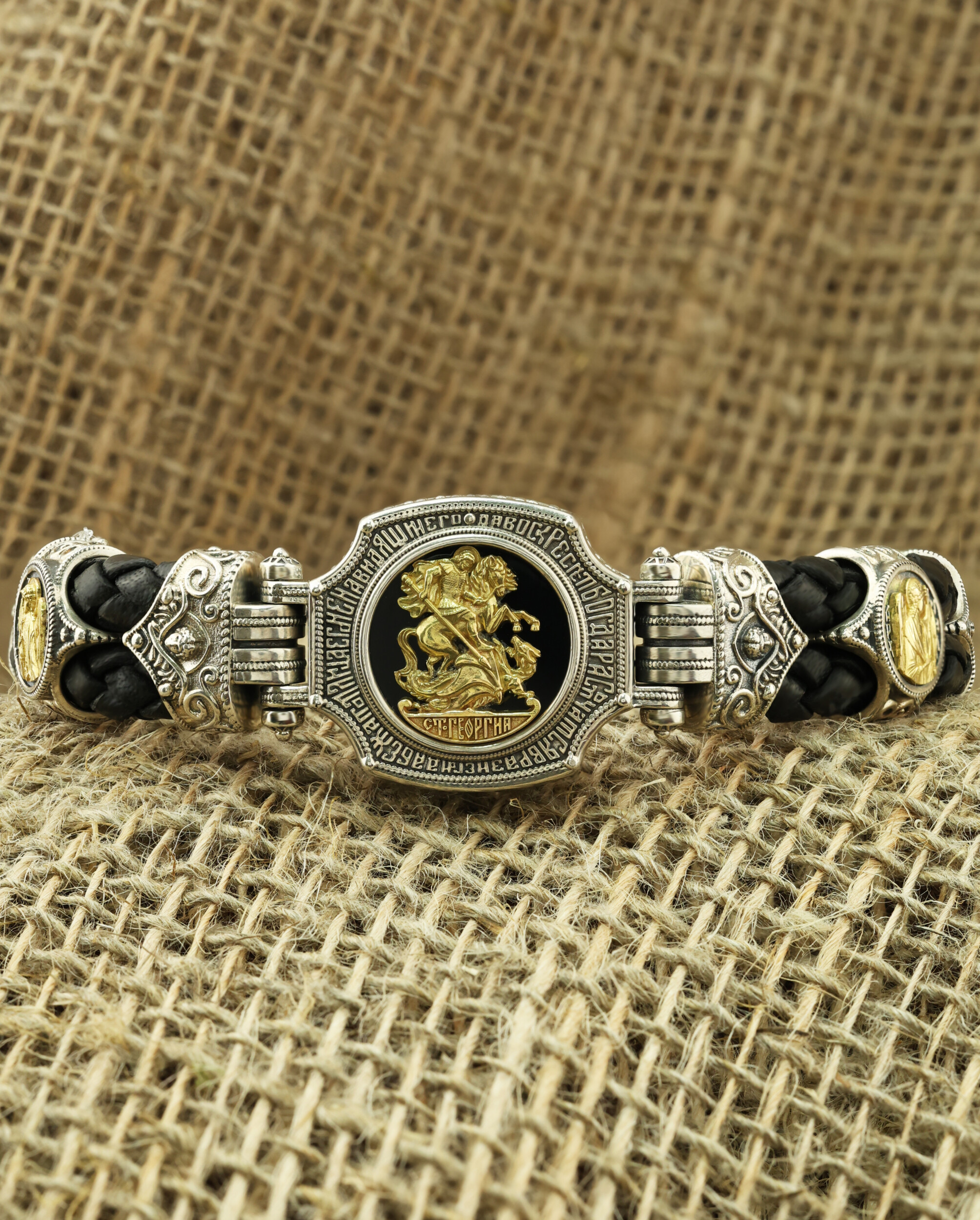 Браслет из серебра и золота c кожаным шнурком и ониксом