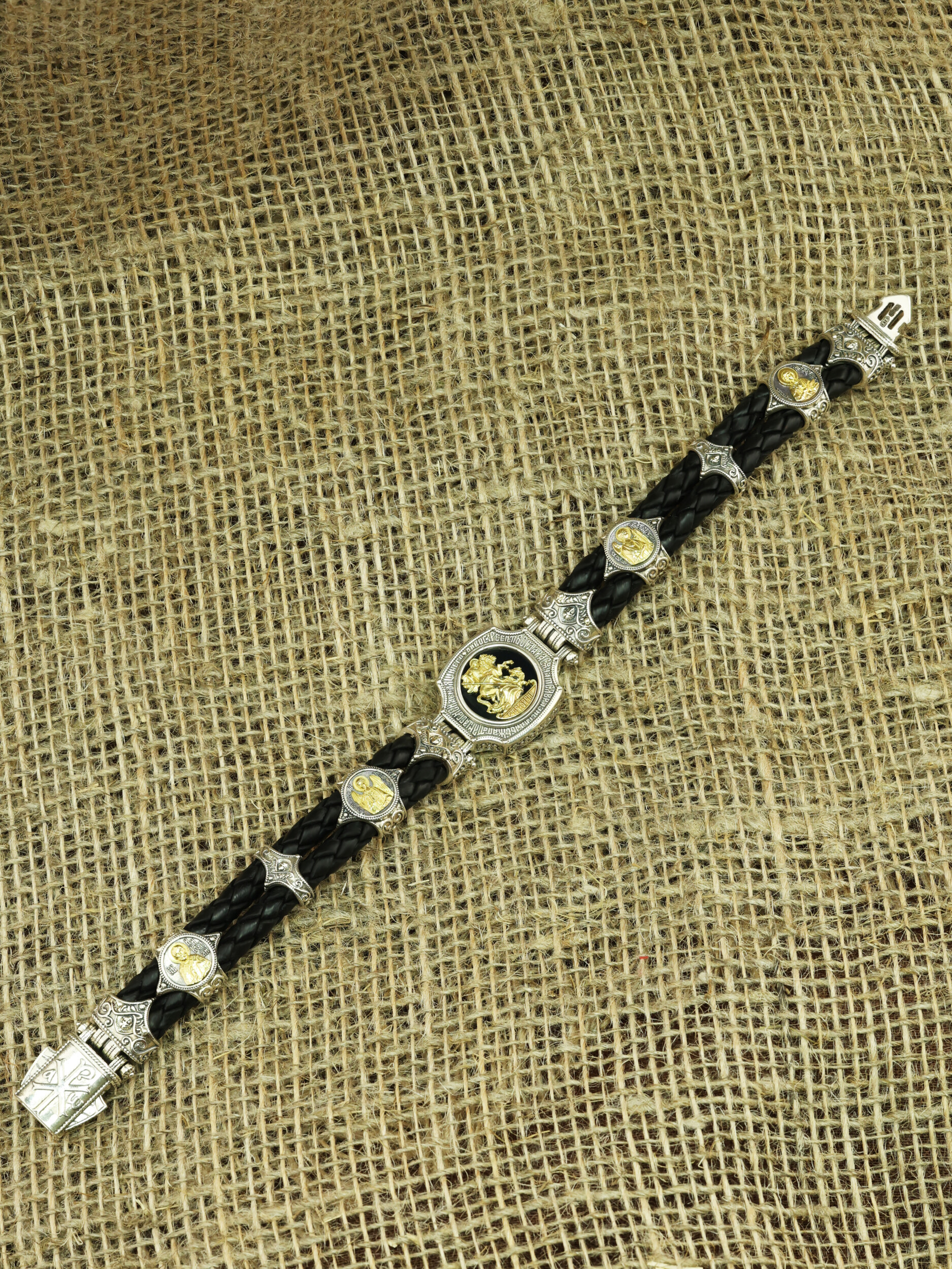 Браслет из серебра и золота c кожаным шнурком и ониксом