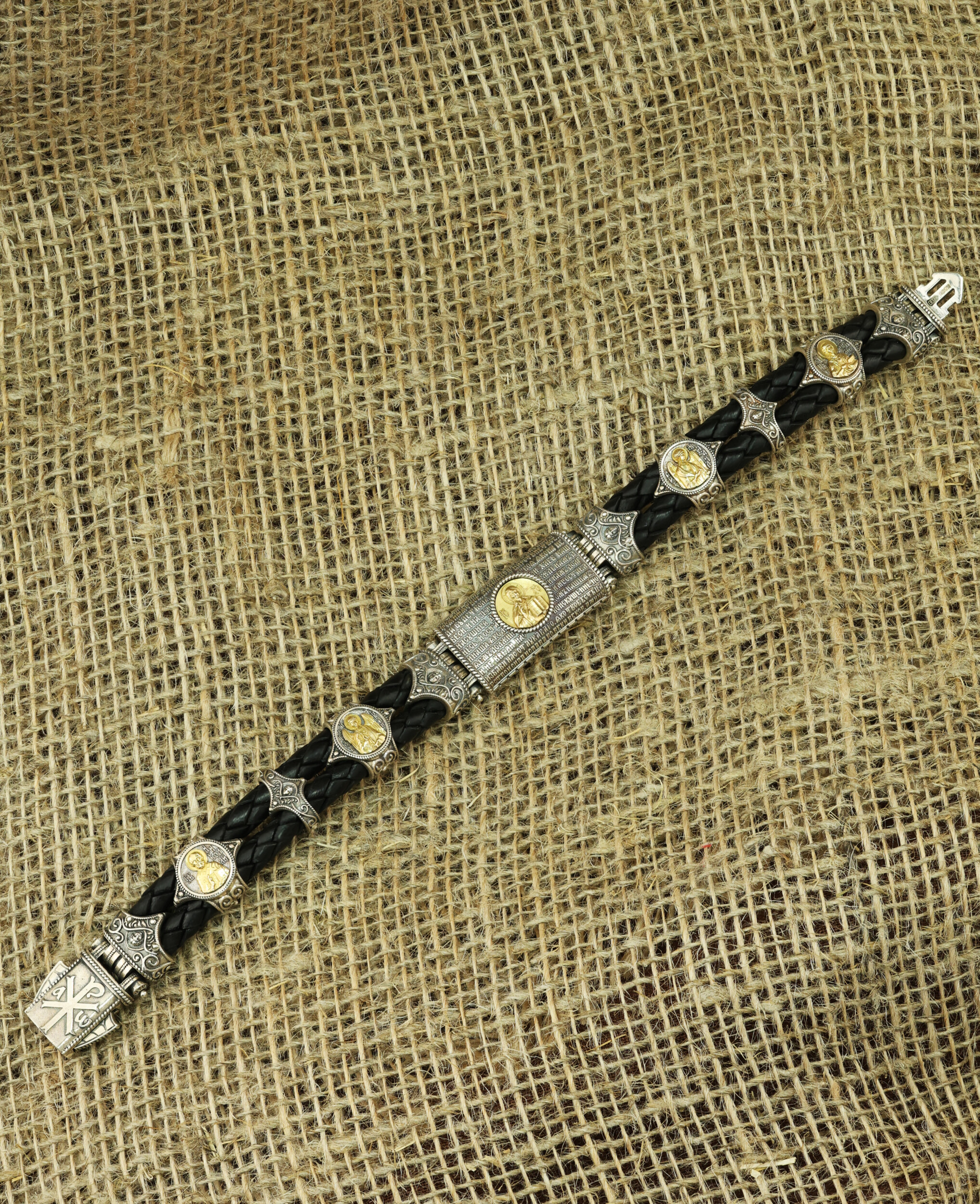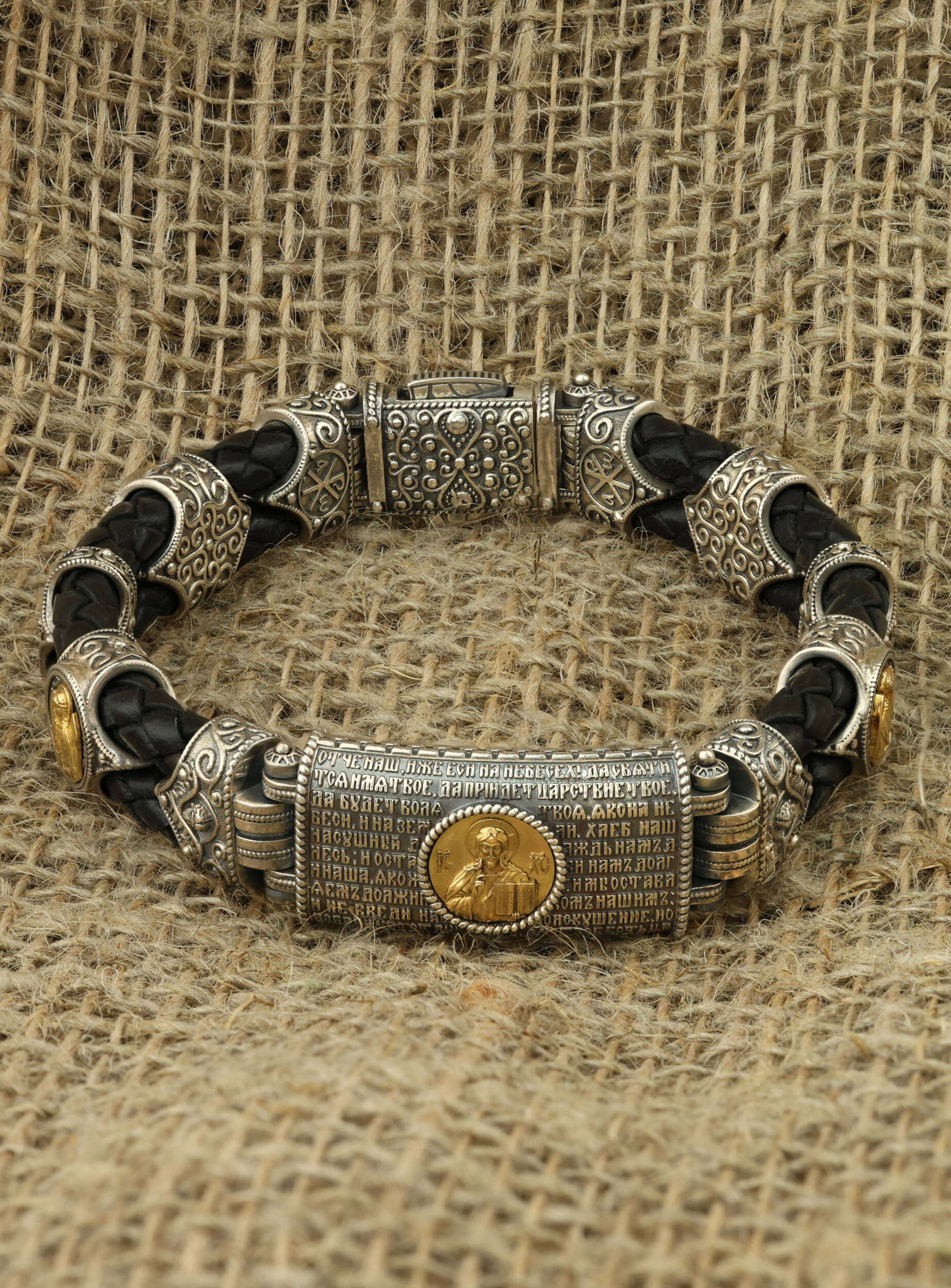 Браслет из серебра и золота c кожаным шнурком