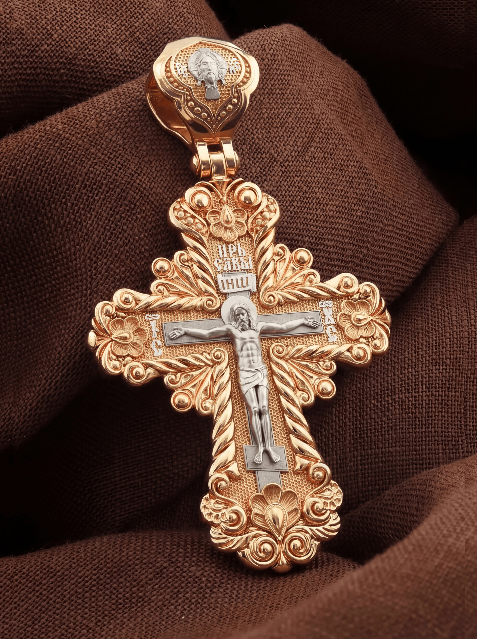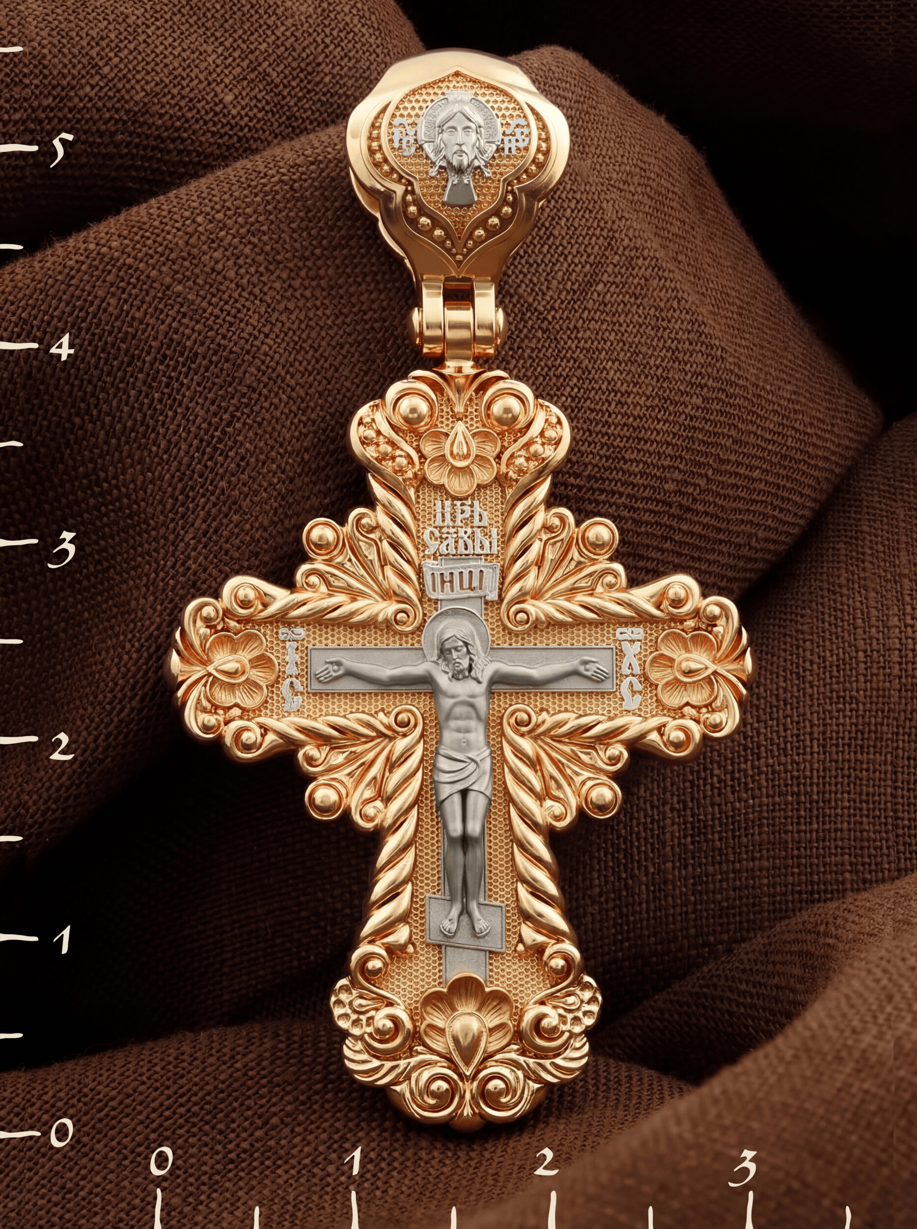 На лицевой стороне креста изображено Распятие Господа и Спасителя нашего Иисуса Христа, отдавшего Себя на смерть, для искупления грехов мира. Крест является символом жертвенной любви Всеблагого Бога к падшим людям, всепобеждающим духовным оружием христиан, основанием и средоточием церковной жизни. Господь сказал: кто хочет идти за Мною, отвергнись себя, и возьми крест свой, и следуй за Мною. (Мк. 8: 34). Над Распятием помещена надпись «Царь Славы». На верхней табличке, выше головы Иисуса, расположена надпись, составленная Понтием Пилатом — «IНЦI». Она означает «Иисус Назорей, Царь Иудейский». Надпись «IC» «ХC», означает Иисус Христос, помещается на разных сторонах поперечной перекладины креста. На кулонном кольце изображен Нерукотворный образ Господа и Спасителя нашего Иисуса Христа, чудесно отпечатавшийся на плате, которым Христос вытер свой лик.