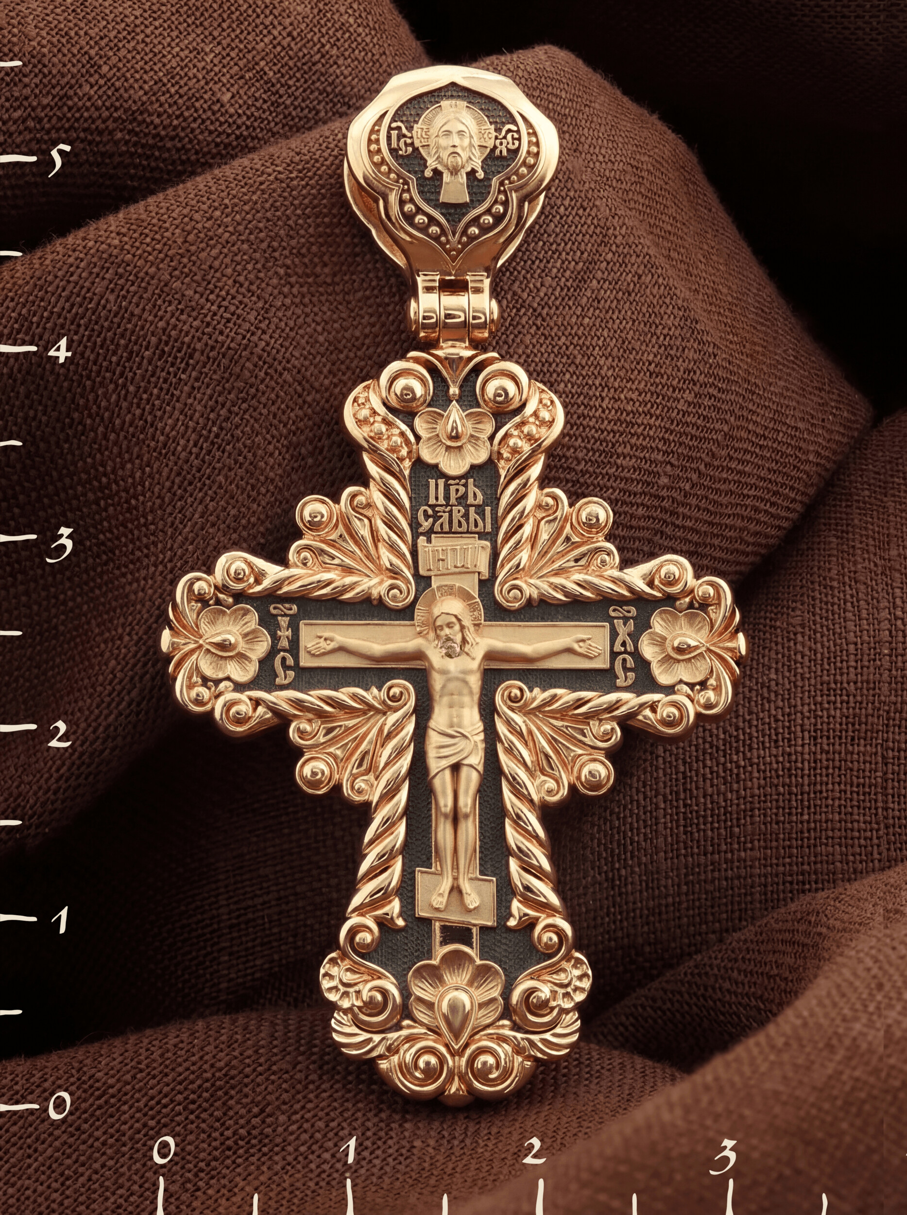 На лицевой стороне креста изображено Распятие Господа и Спасителя нашего Иисуса Христа, отдавшего Себя на смерть, для искупления грехов мира. Крест является символом жертвенной любви Всеблагого Бога к падшим людям, всепобеждающим духовным оружием христиан, основанием и средоточием церковной жизни. Господь сказал: кто хочет идти за Мною, отвергнись себя, и возьми крест свой, и следуй за Мною. (Мк. 8: 34). Над Распятием помещена надпись «Царь Славы». На верхней табличке, выше головы Иисуса, расположена надпись, составленная Понтием Пилатом — «IНЦI». Она означает «Иисус Назорей, Царь Иудейский». Надпись «IC» «ХC», означает Иисус Христос, помещается на разных сторонах поперечной перекладины креста. На кулонном кольце изображен Нерукотворный образ Господа и Спасителя нашего Иисуса Христа, чудесно отпечатавшийся на плате, которым Христос вытер свой лик.