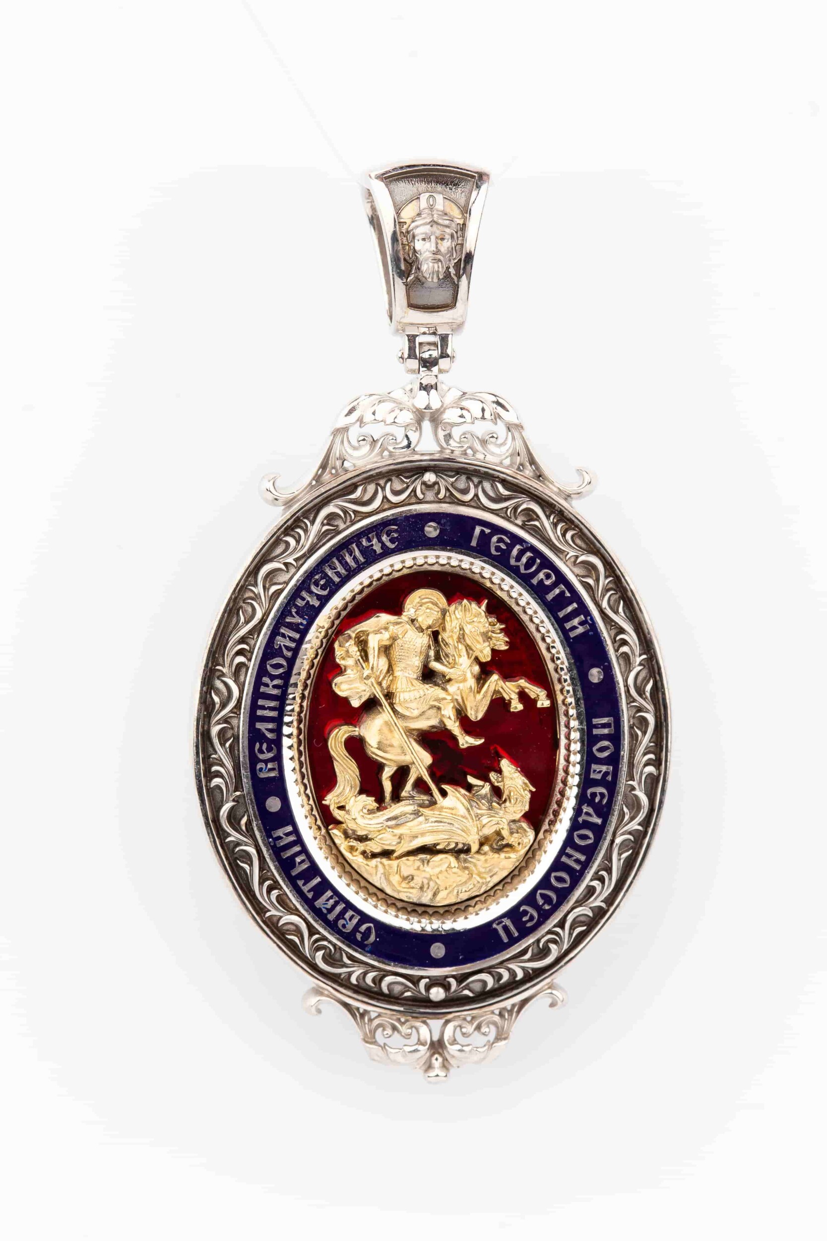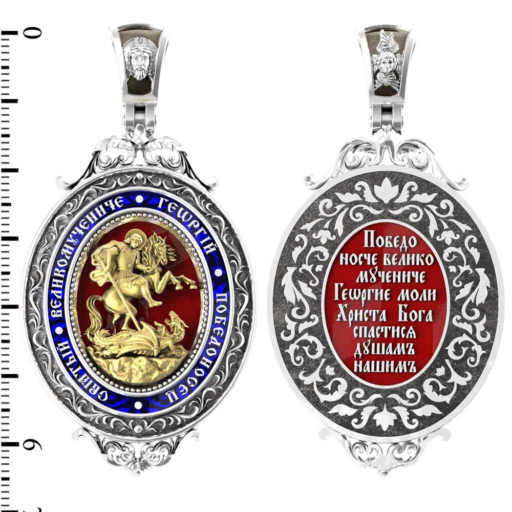 Молитва перед иконой Георгия Победоносца поможет защититься от врагов, одержать победу в сражении (военном, спортивном, духовной брани с дьяволом), содействие в установлении мира между членами семьи, избавиться от телесного недуга. На кулонном кольце изображен Спас Нерукотворный — Символ вочеловечившегося Божества и шестикрылый Серафим — самый приближенный к Господу Ангел.
