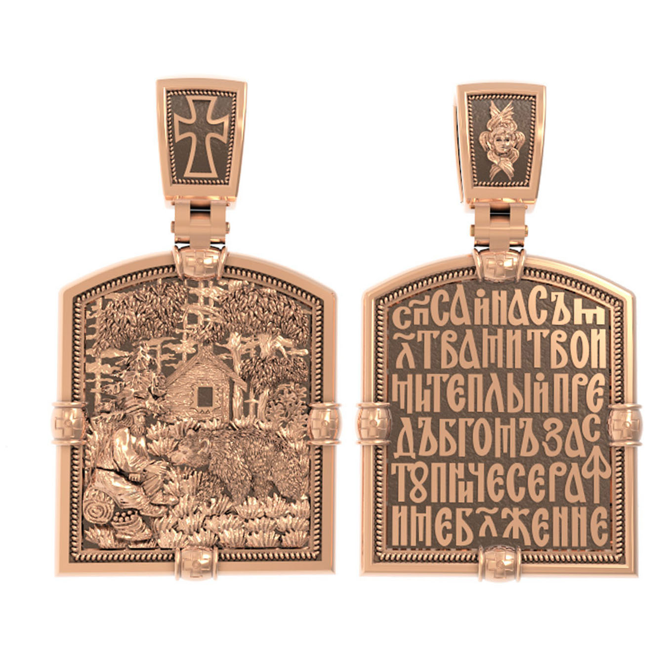 На лицевой стороне образка изображен Преподобный Серафим Саровский, самый великий русский святой XIX века. Преподобный Серафим почитается за особую милостивую любовь к людям и неоскудевающую помощь во всяких делах.
